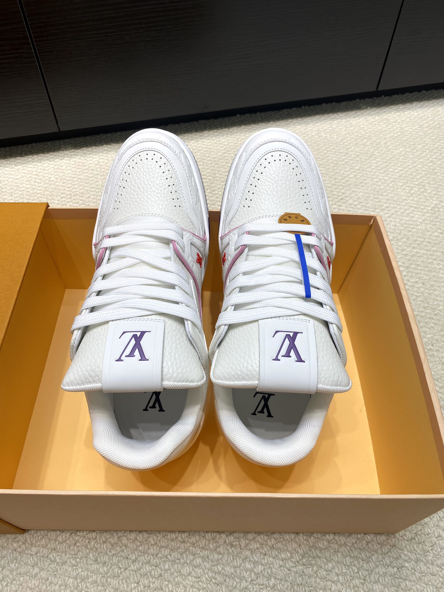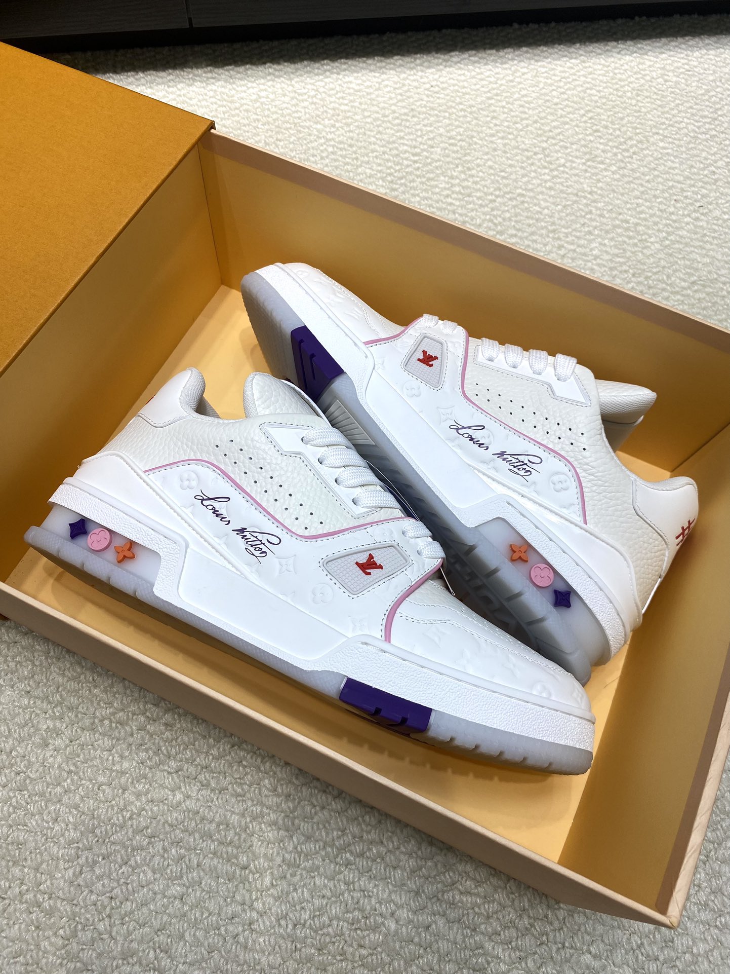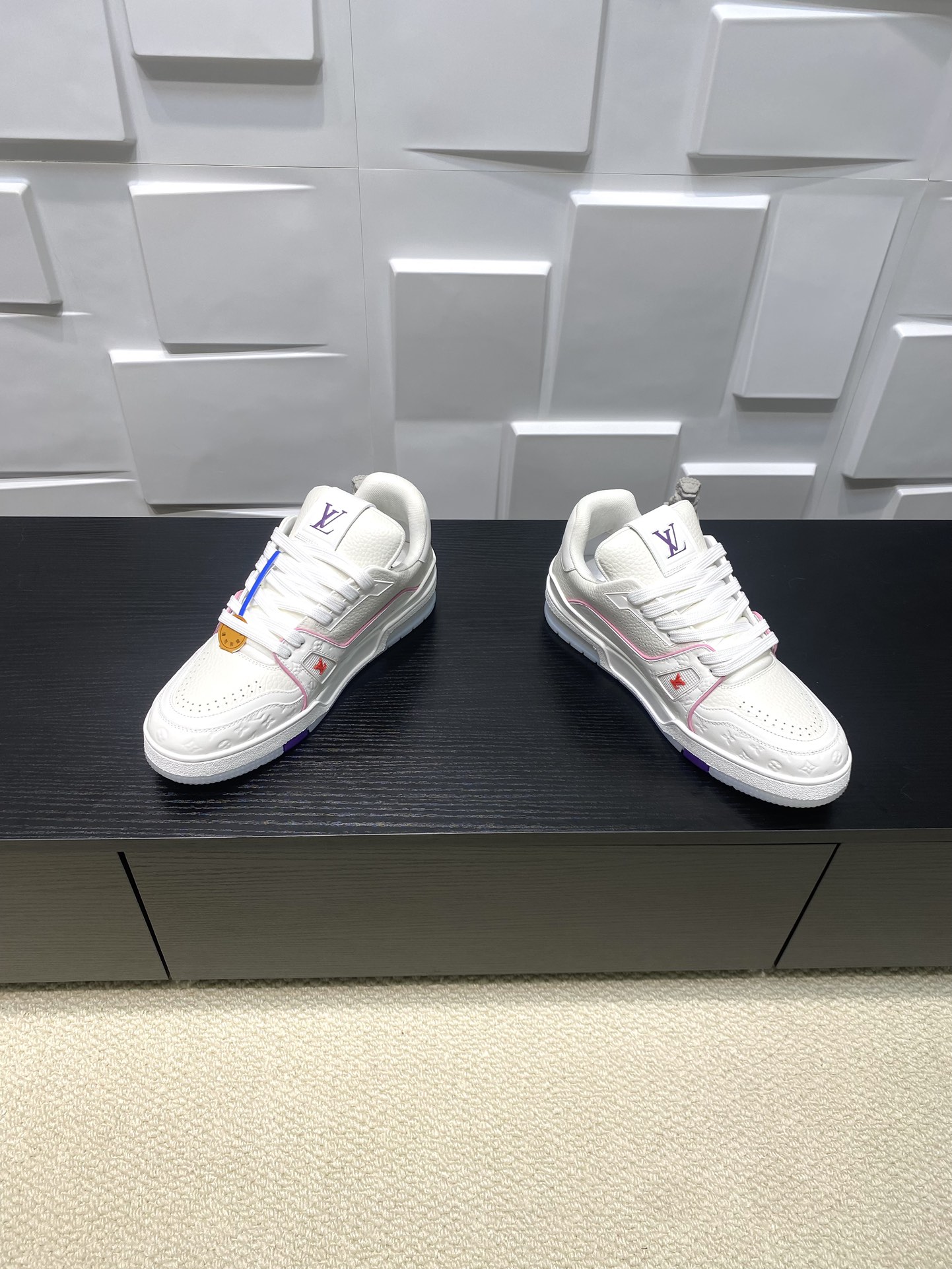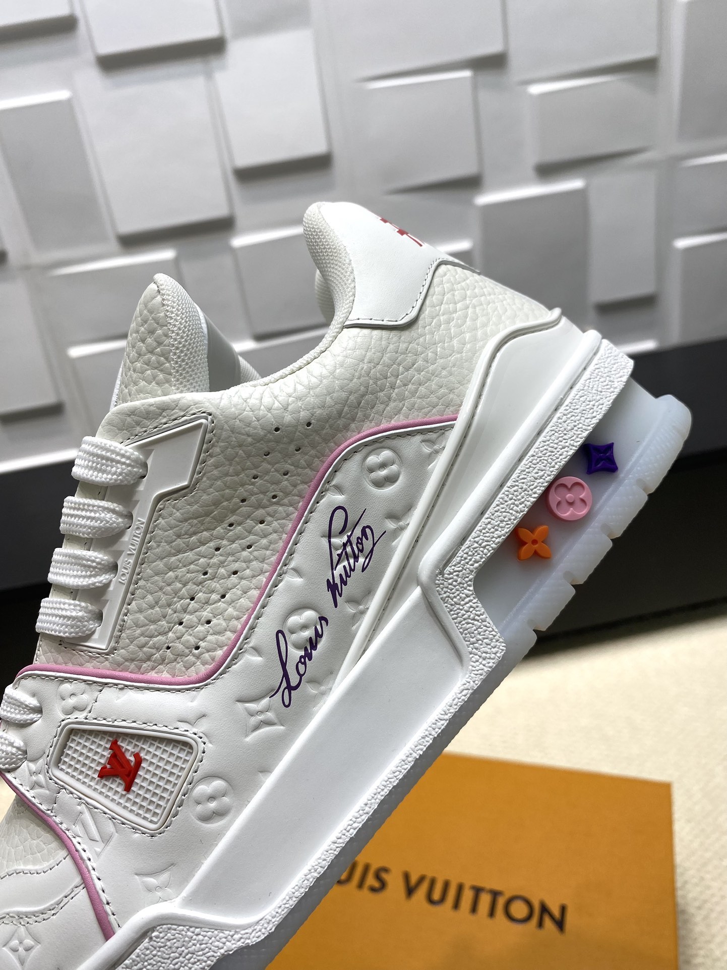 这款鞋子是AAAAA 1:1 质量 (非常棒). 使用了和原版一模一样的材料. 商标部分也保持了和路易威登/Louis Vuitton一样. 图片拍摄是实物鞋子拍摄, 您所收到的实物保证和我们图片一模一样.