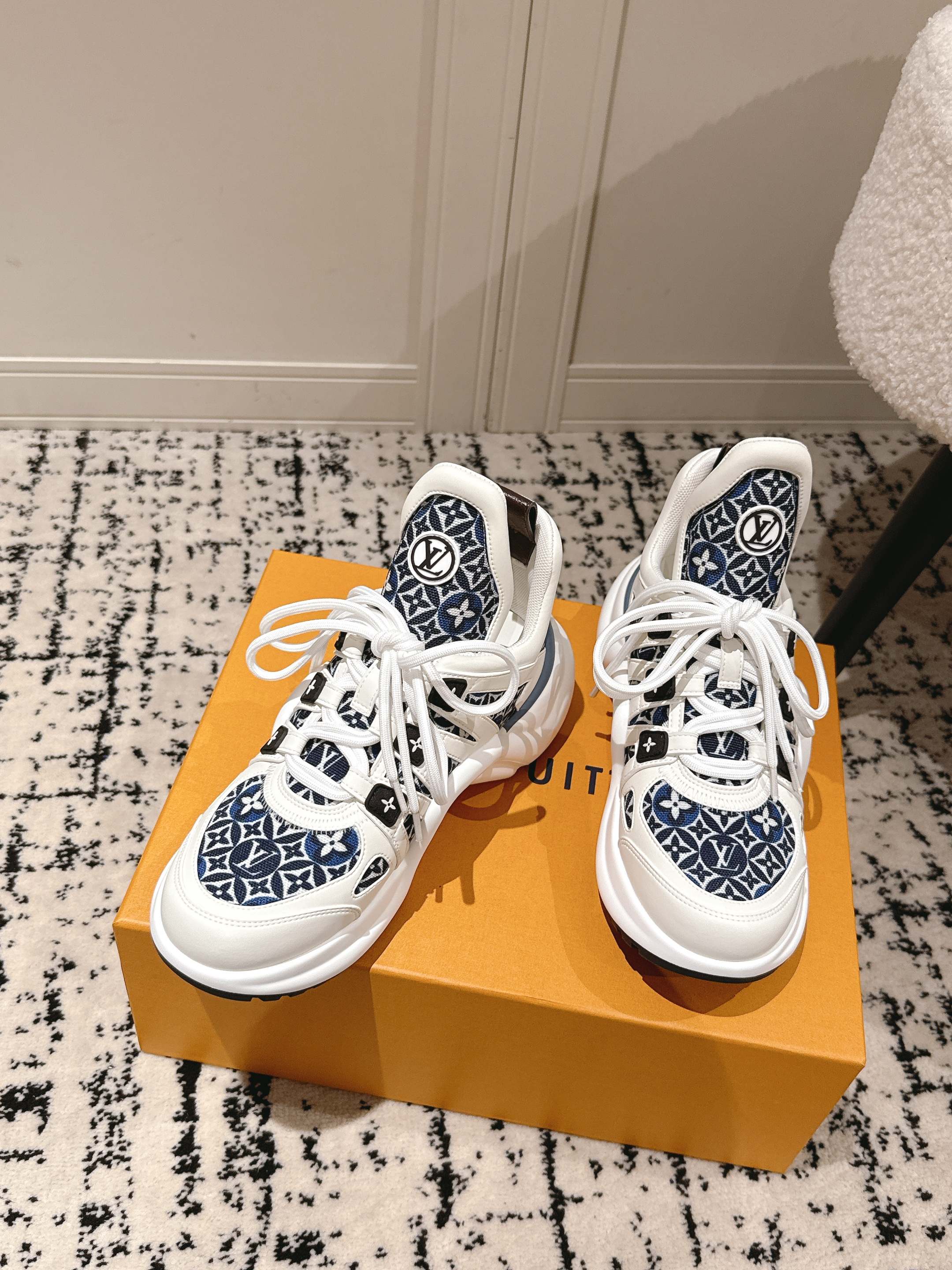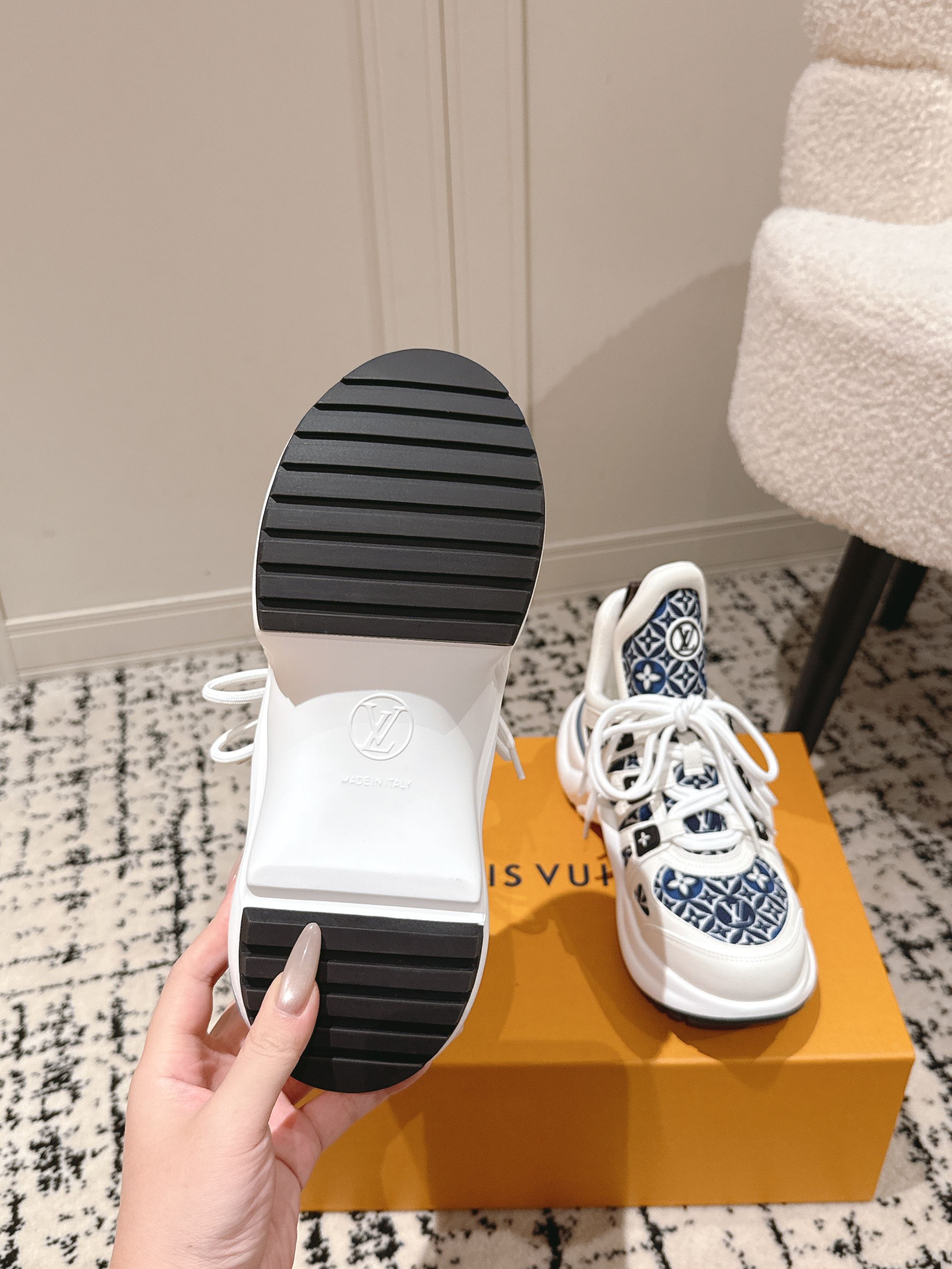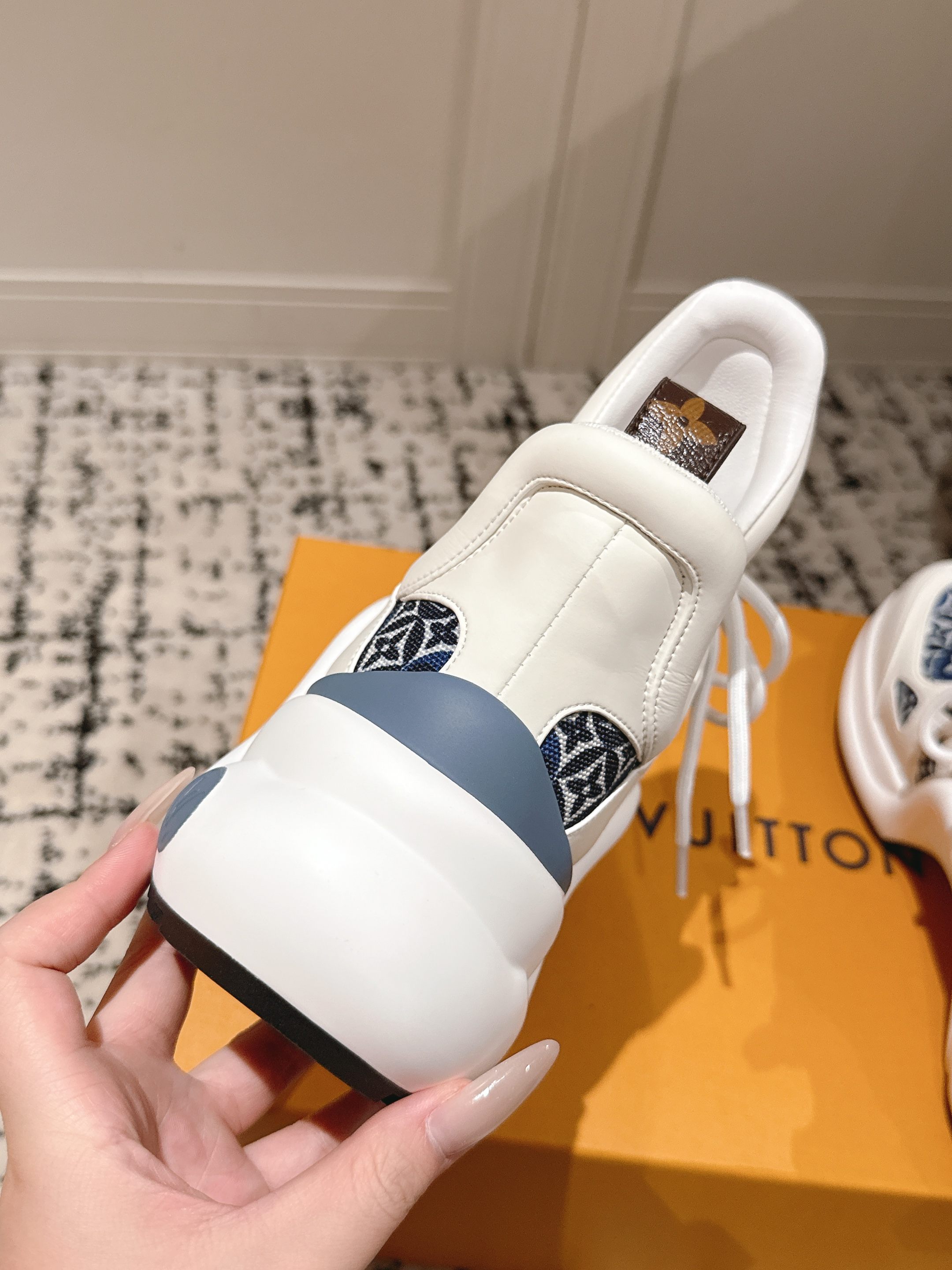 这款鞋子是AAAAA 1:1 质量 (非常棒). 使用了和原版一模一样的材料. 商标部分也保持了和路易威登/Louis Vuitton一样. 图片拍摄是实物鞋子拍摄, 您所收到的实物保证和我们图片一模一样.