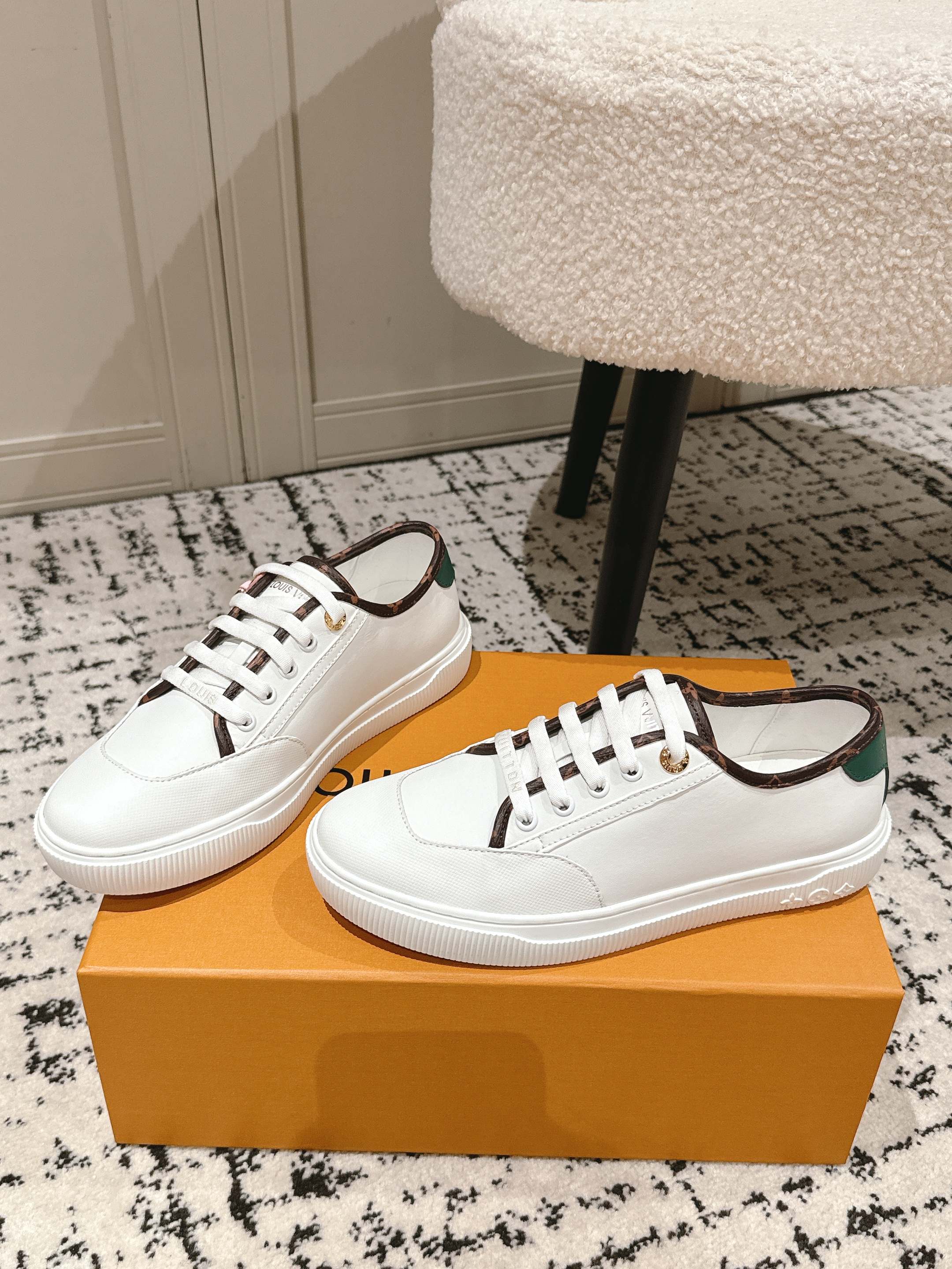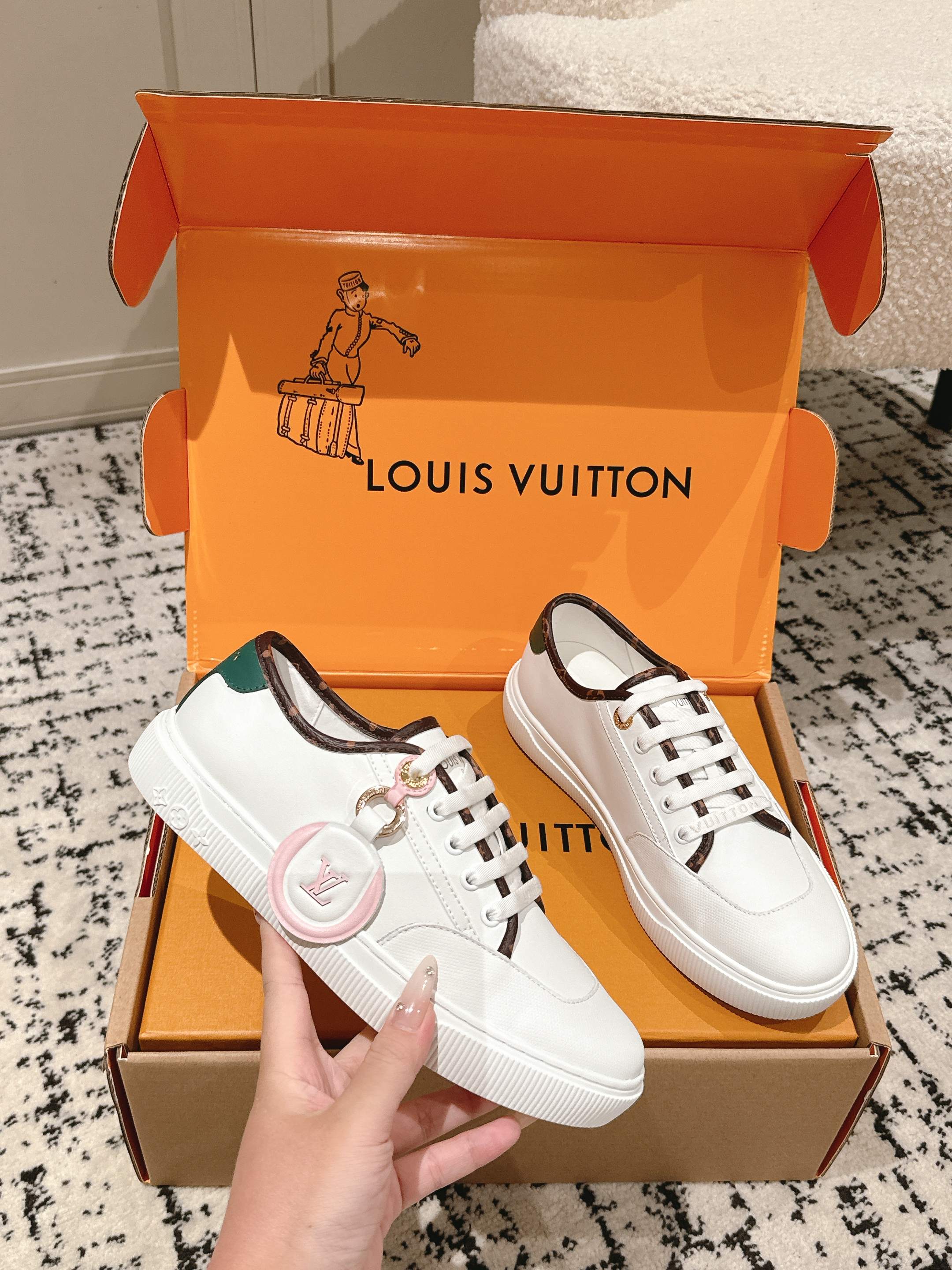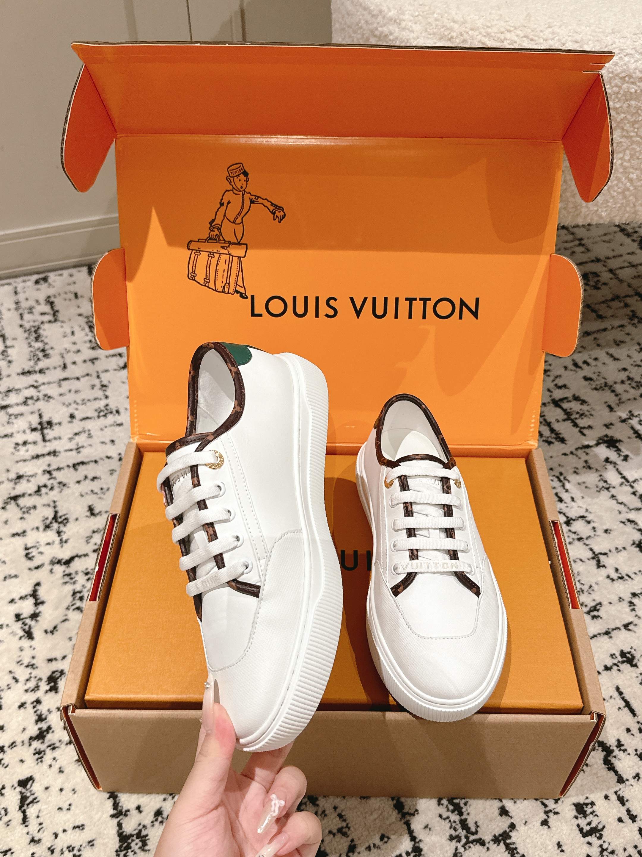 这款鞋子是AAAAA 1:1 质量 (非常棒). 使用了和原版一模一样的材料. 商标部分也保持了和路易威登/Louis Vuitton一样. 图片拍摄是实物鞋子拍摄, 您所收到的实物保证和我们图片一模一样.