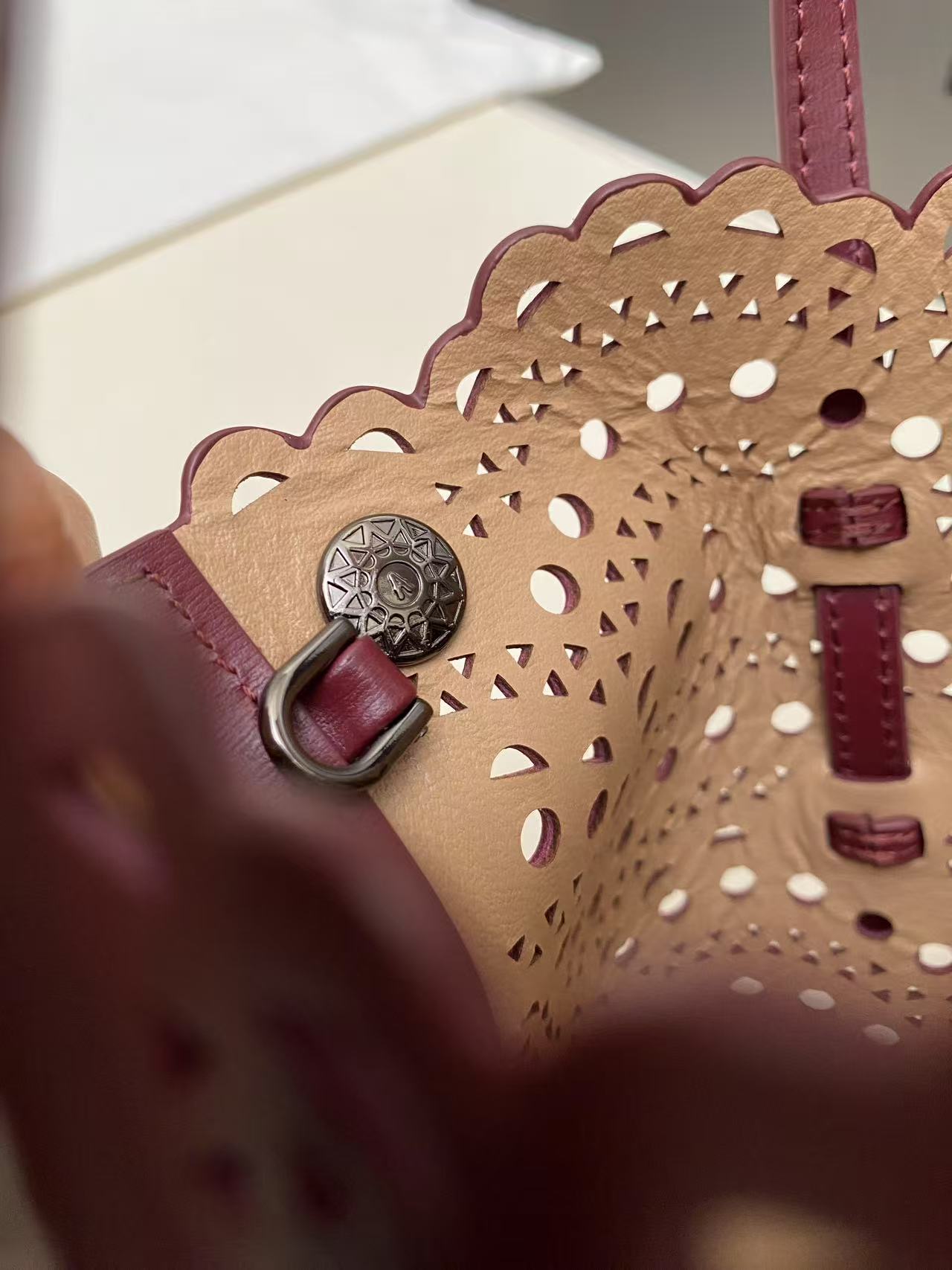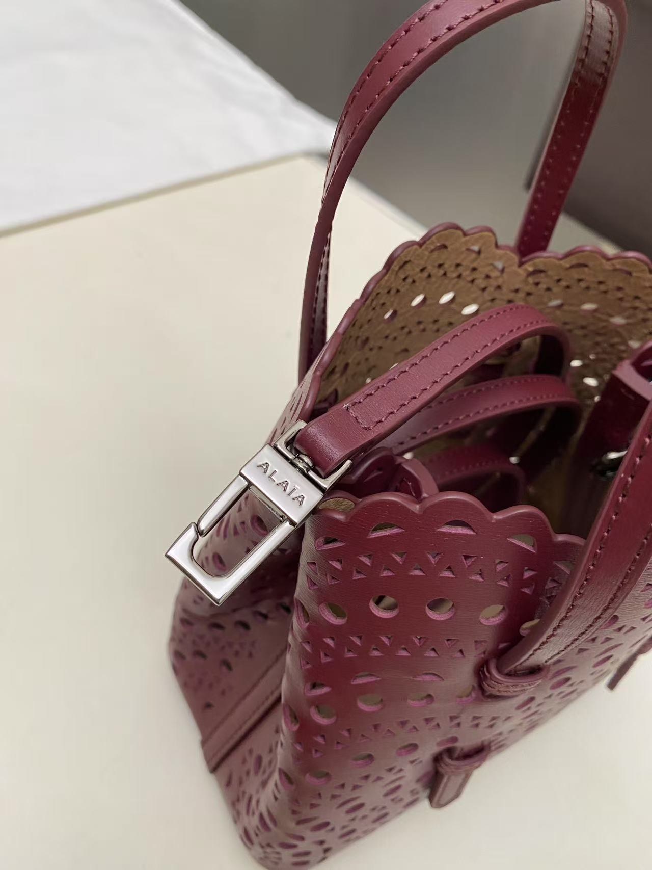 这款包包是AAAAA 1:1 质量 (非常棒). 使用了和原版一模一样的材料. 商标部分也保持了和Alaia一样. 图片拍摄是实物包包拍摄, 您所收到的实物保证和我们图片一模一样.