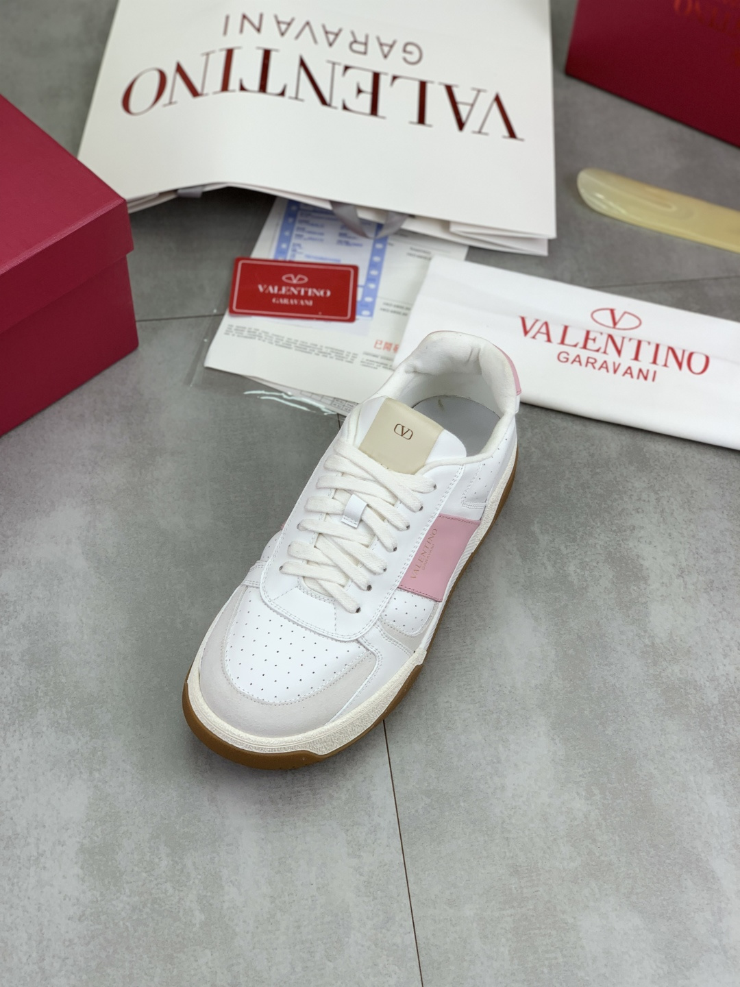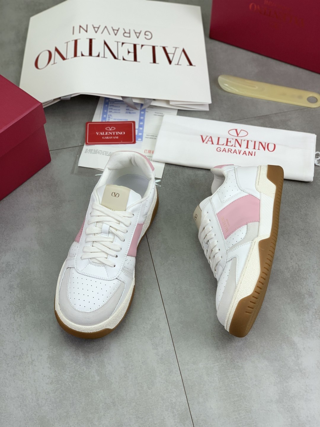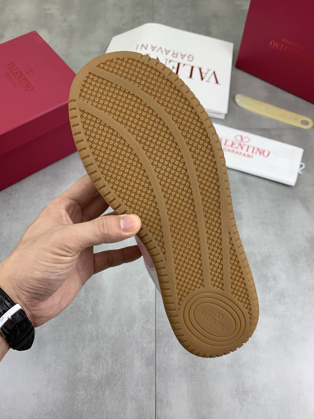 这款鞋子是AAAAA 1:1 质量 (非常棒). 使用了和原版一模一样的材料. 商标部分也保持了和华伦天奴/Valentino一样. 图片拍摄是实物鞋子拍摄, 您所收到的实物保证和我们图片一模一样.