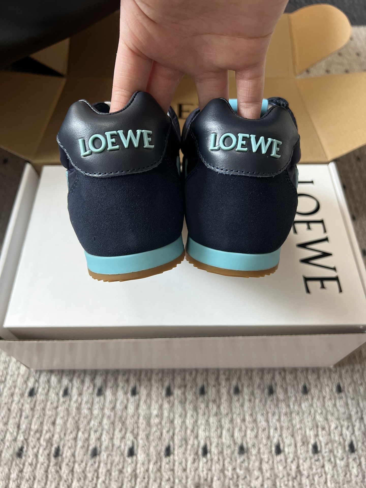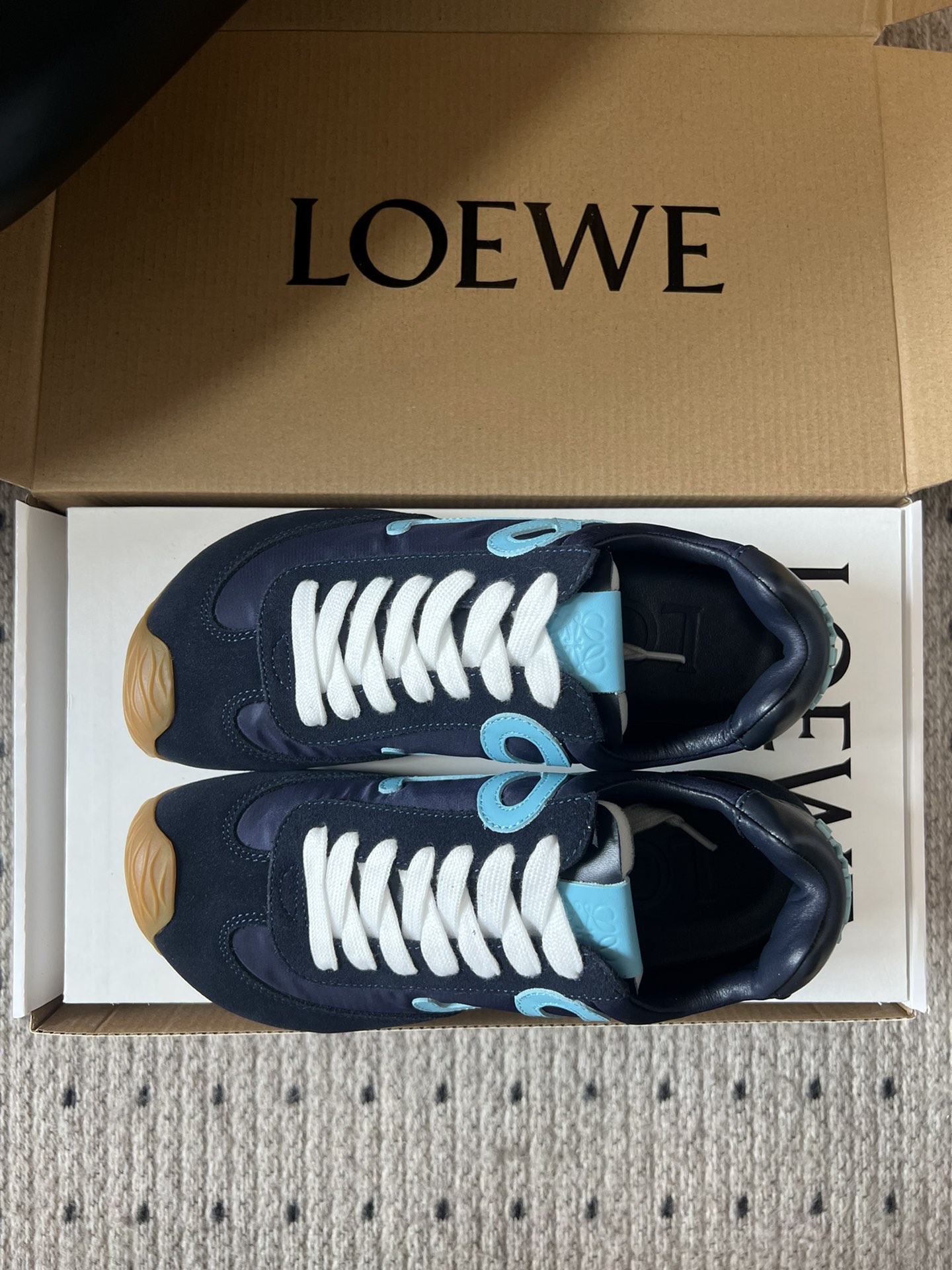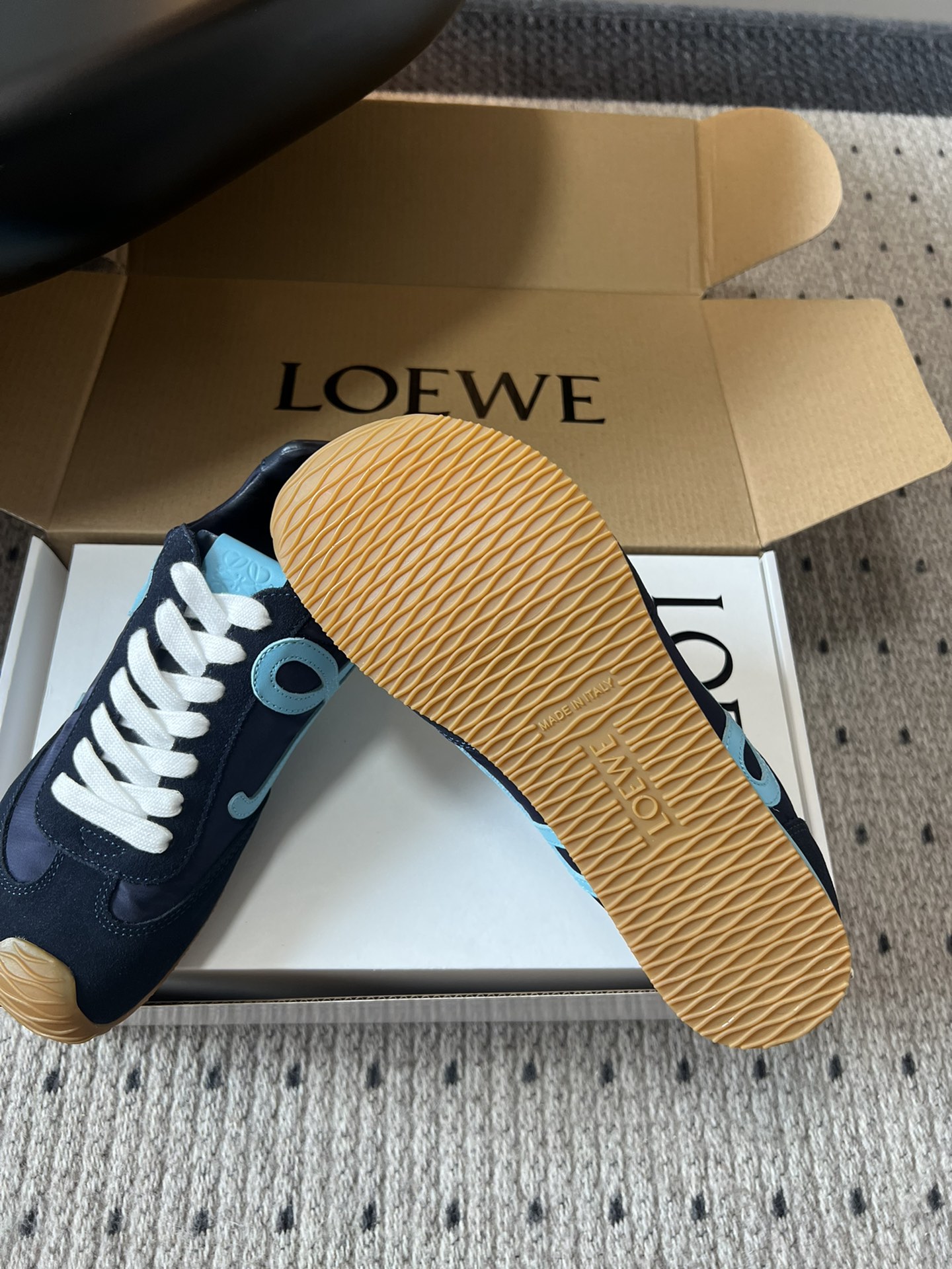 这款鞋子是AAAAA 1:1 质量 (非常棒). 使用了和原版一模一样的材料. 商标部分也保持了和罗意威/Loewe一样. 图片拍摄是实物鞋子拍摄, 您所收到的实物保证和我们图片一模一样.