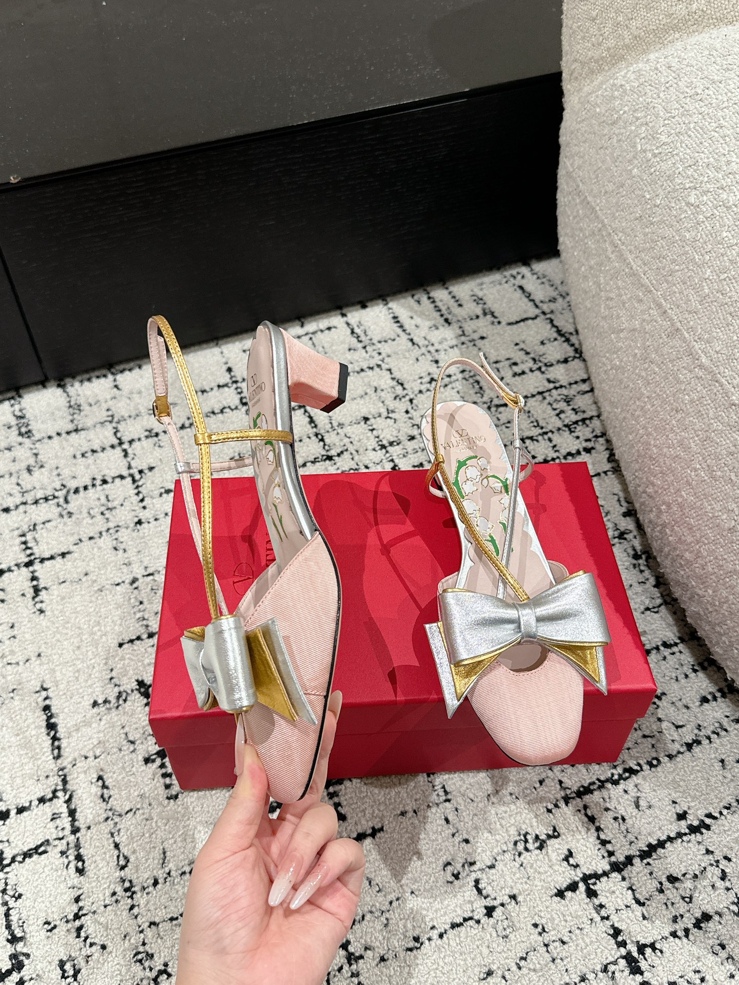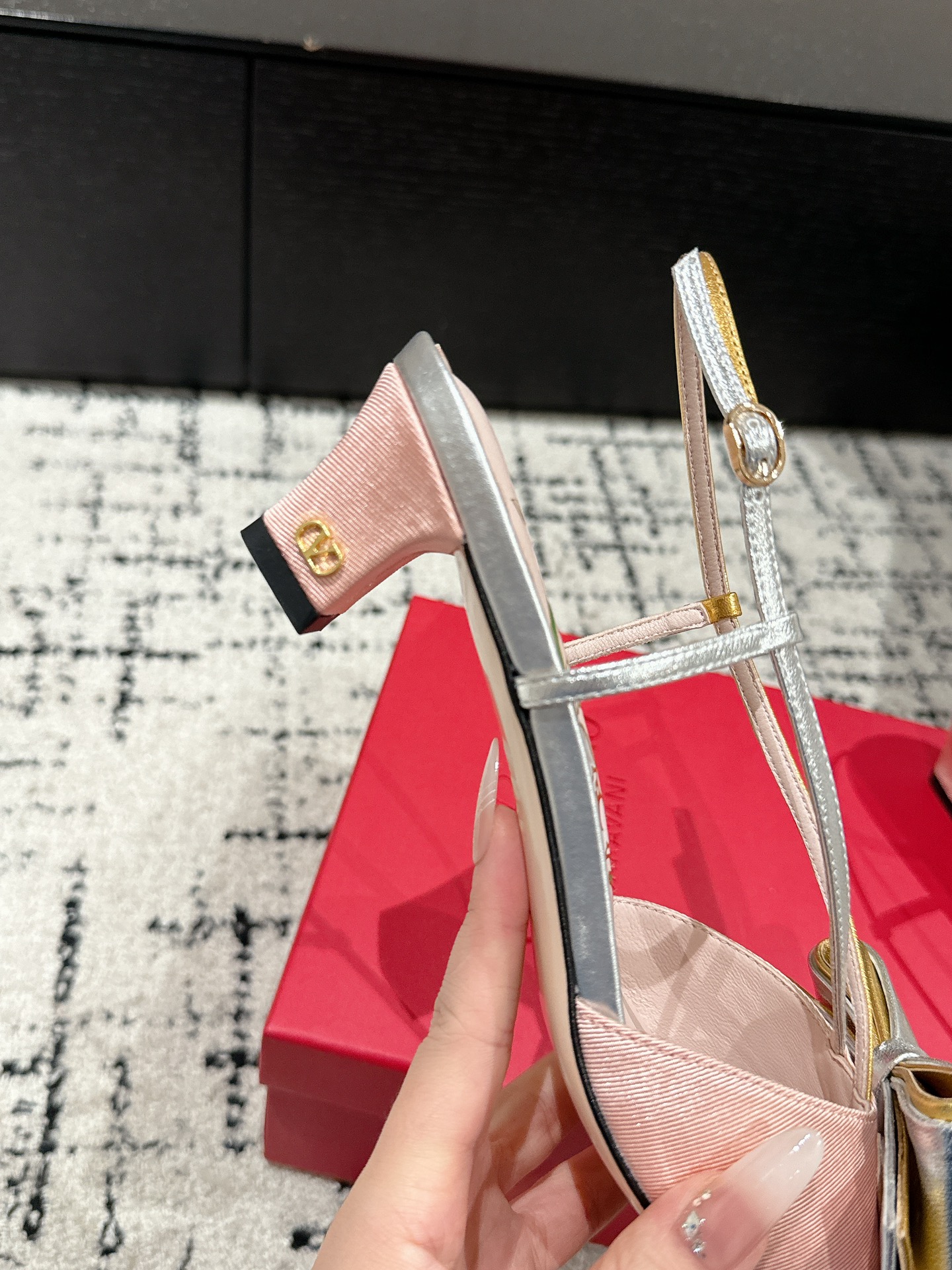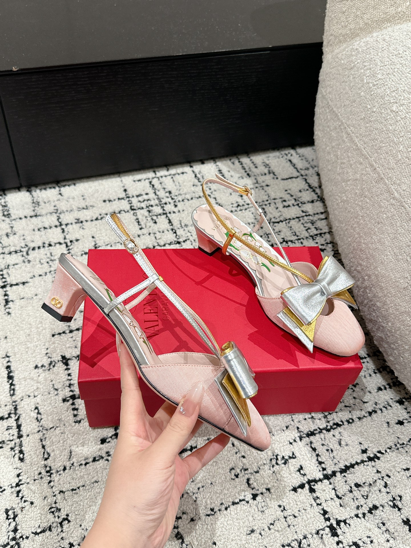 这款鞋子是AAAAA 1:1 质量 (非常棒). 使用了和原版一模一样的材料. 商标部分也保持了和华伦天奴/Valentino一样. 图片拍摄是实物鞋子拍摄, 您所收到的实物保证和我们图片一模一样.