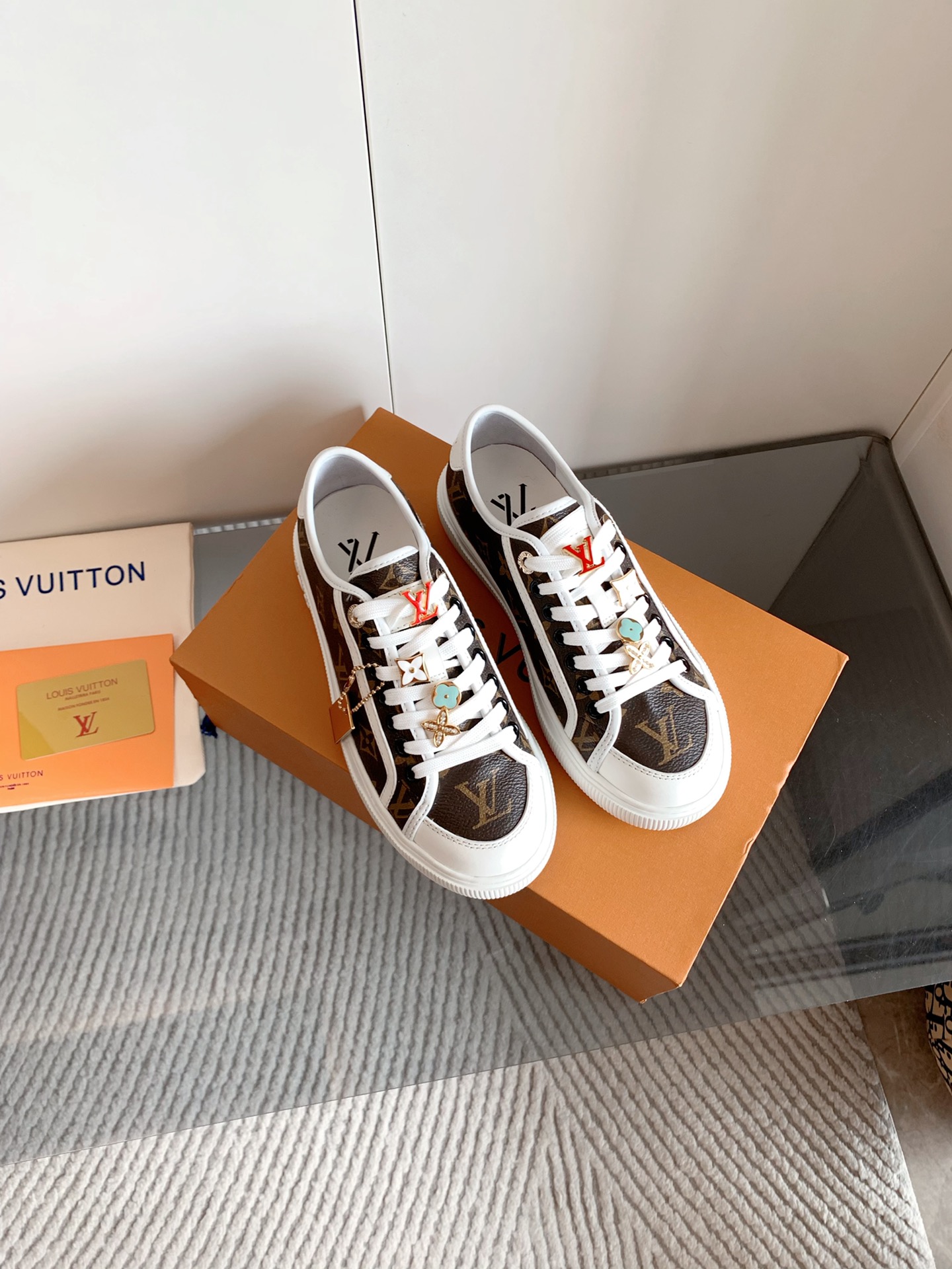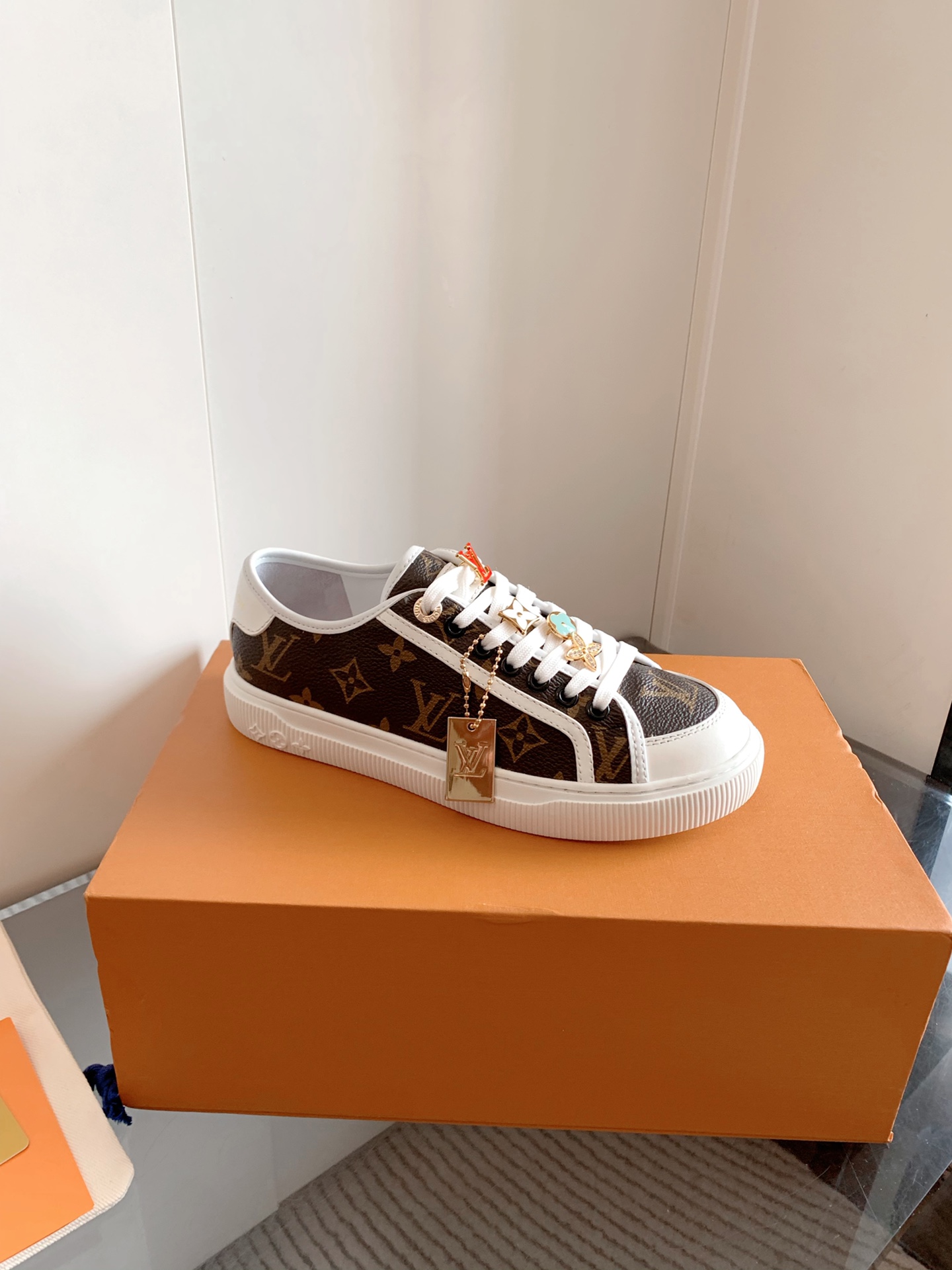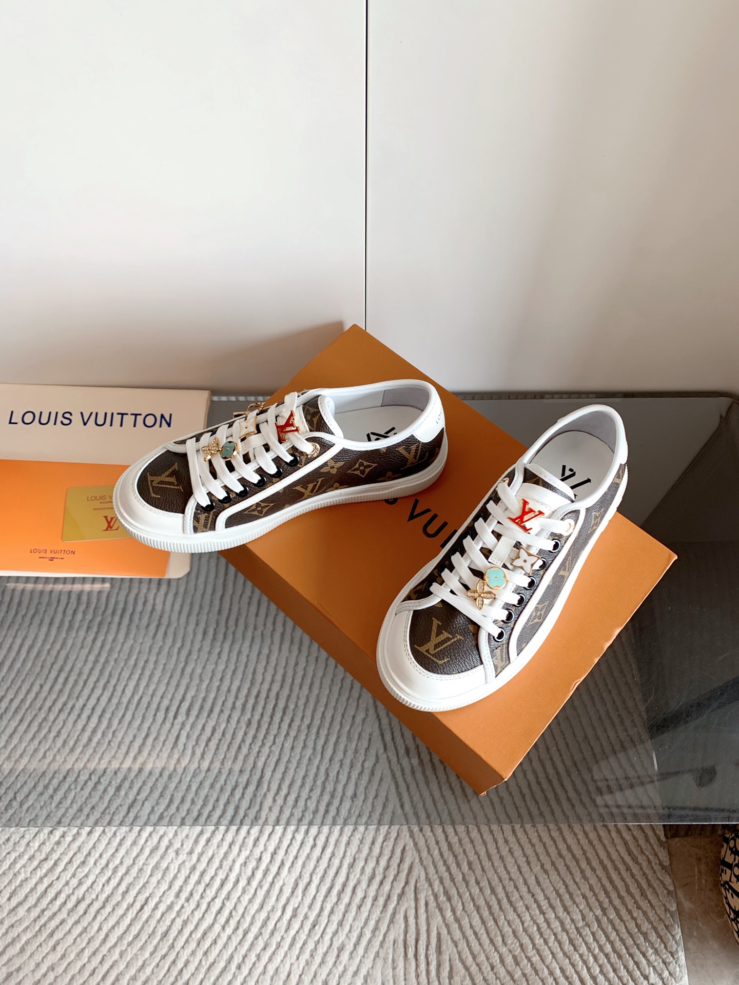 这款鞋子是AAAAA 1:1 质量 (非常棒). 使用了和原版一模一样的材料. 商标部分也保持了和路易威登/Louis Vuitton一样. 图片拍摄是实物鞋子拍摄, 您所收到的实物保证和我们图片一模一样.