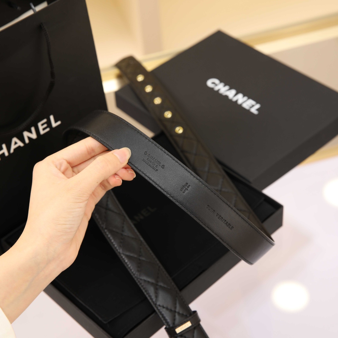 这款皮带是AAAAA 1:1 质量 (非常棒). 使用了和原版一模一样的材料. 商标部分也保持了和香奈儿/Chanel一样. 图片拍摄是实物皮带拍摄, 您所收到的实物保证和我们图片一模一样.