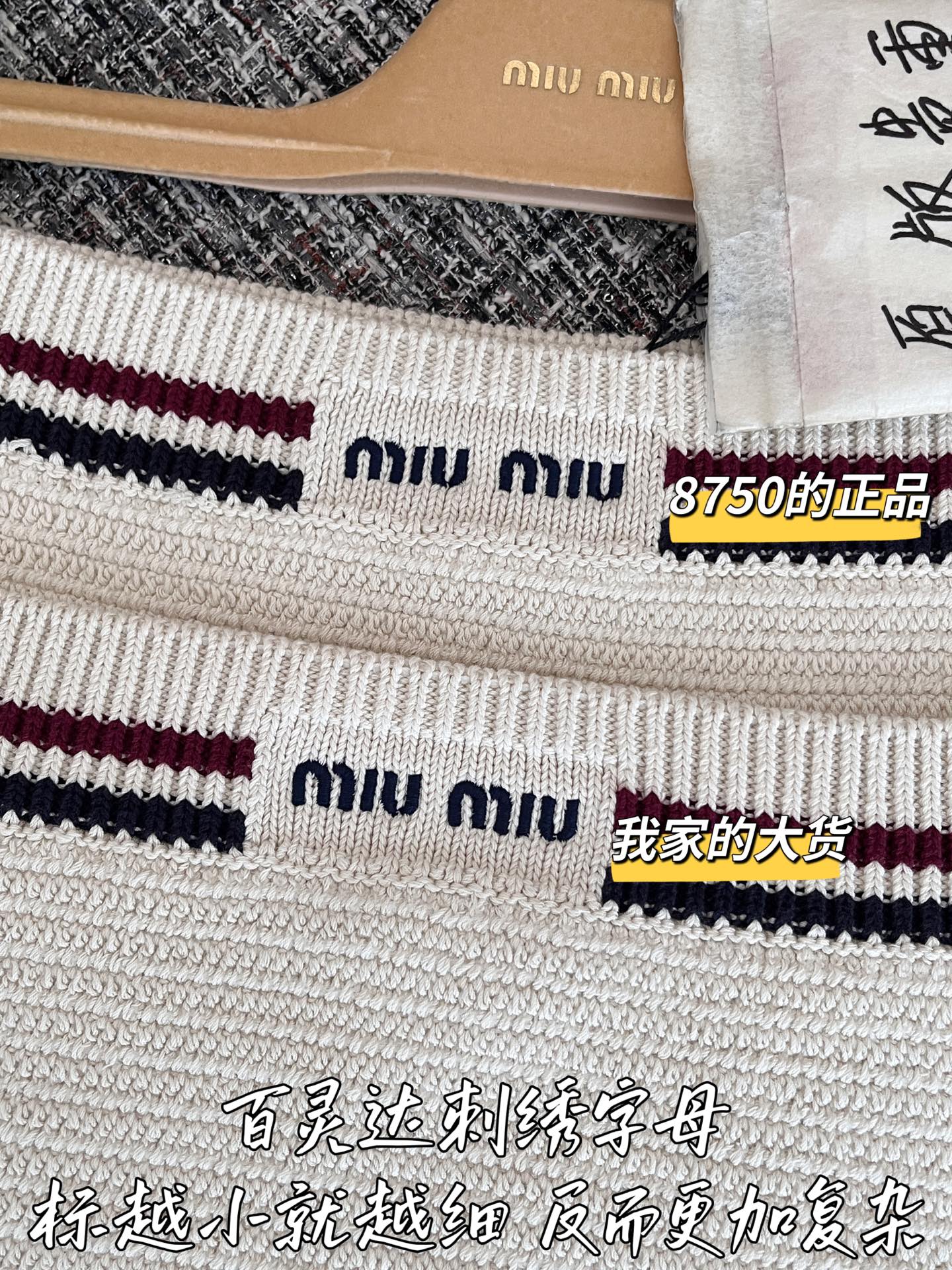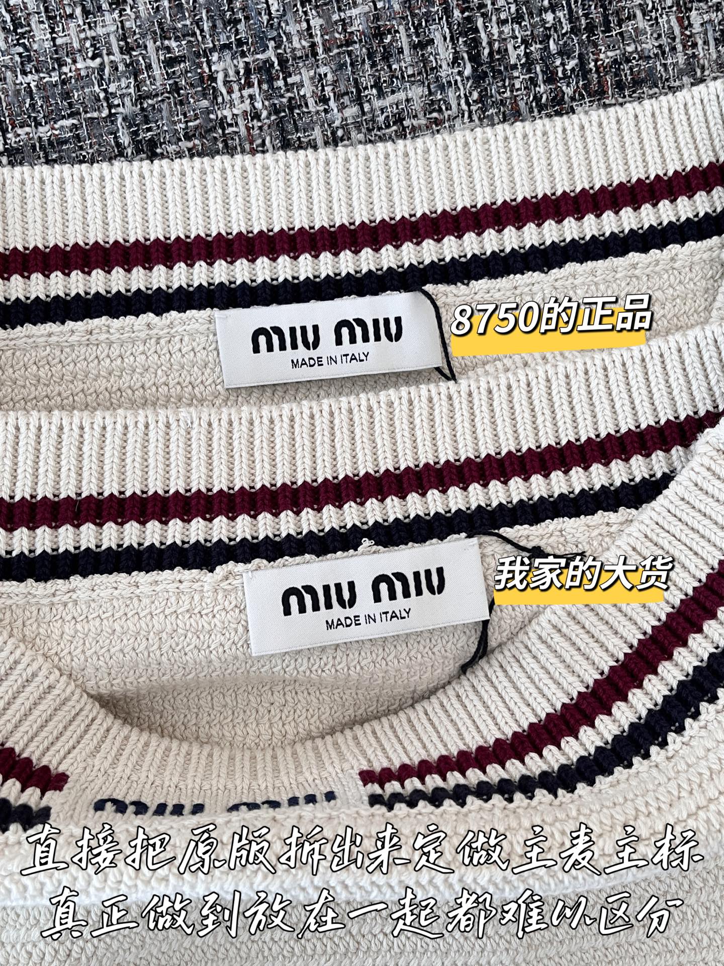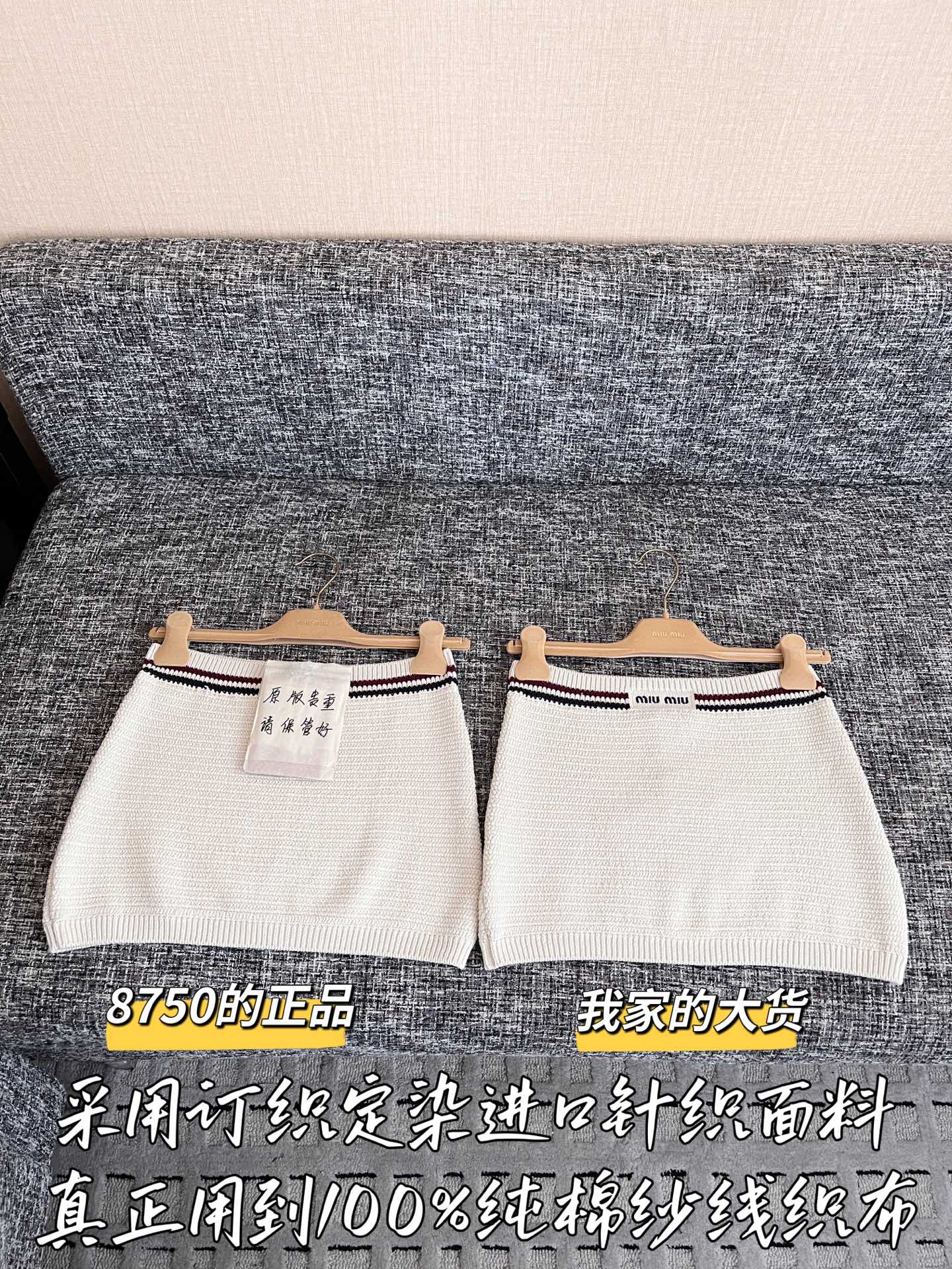 这款衣服是AAAAA 1:1 质量 (非常棒). 使用了和原版一模一样的材料. 商标部分也保持了和缪缪/Miu Miu一样. 图片拍摄是实物衣服拍摄, 您所收到的实物保证和我们图片一模一样.