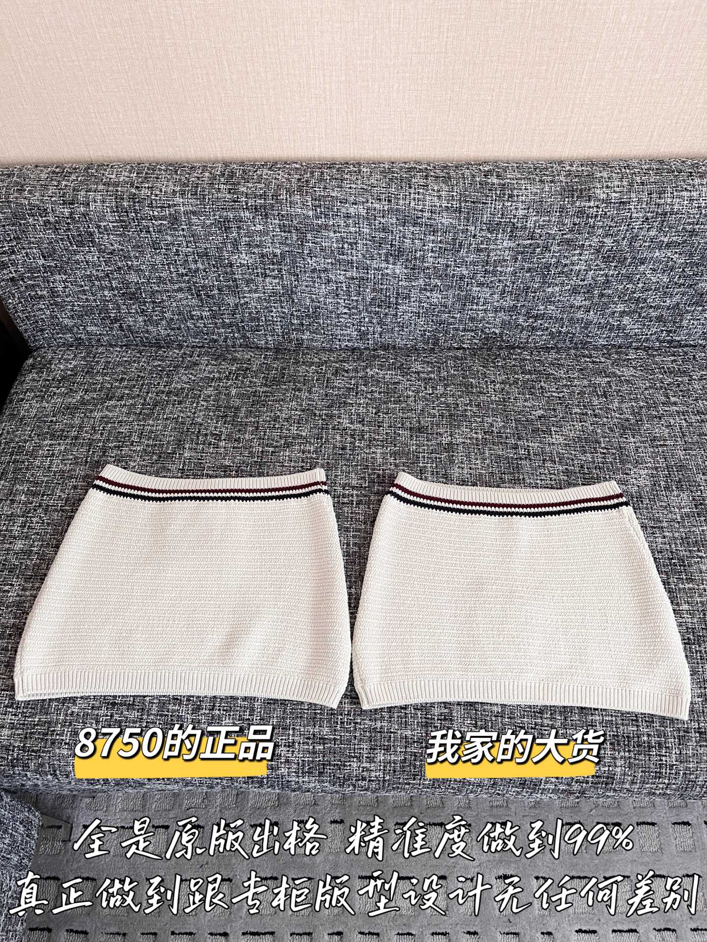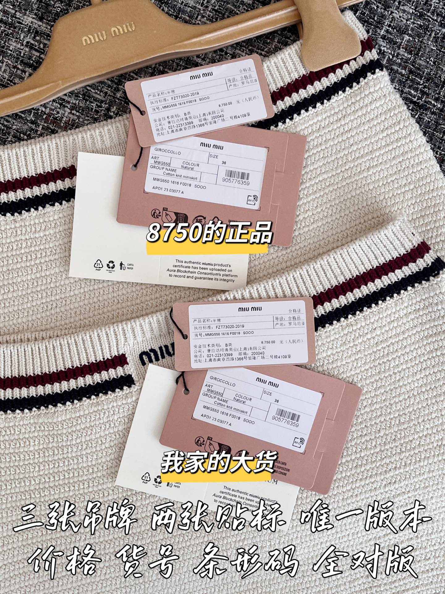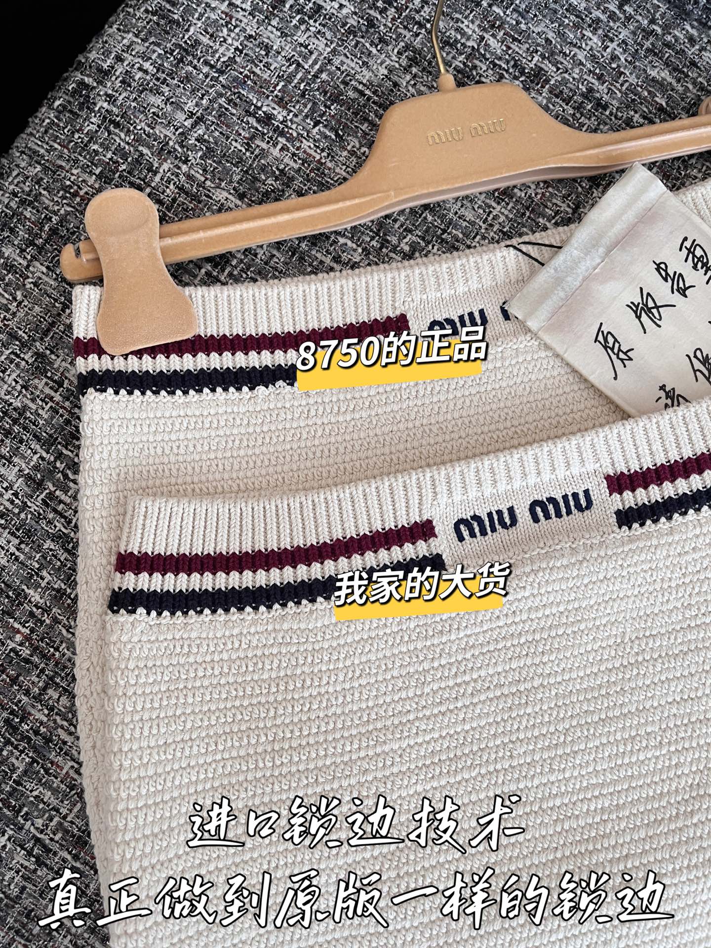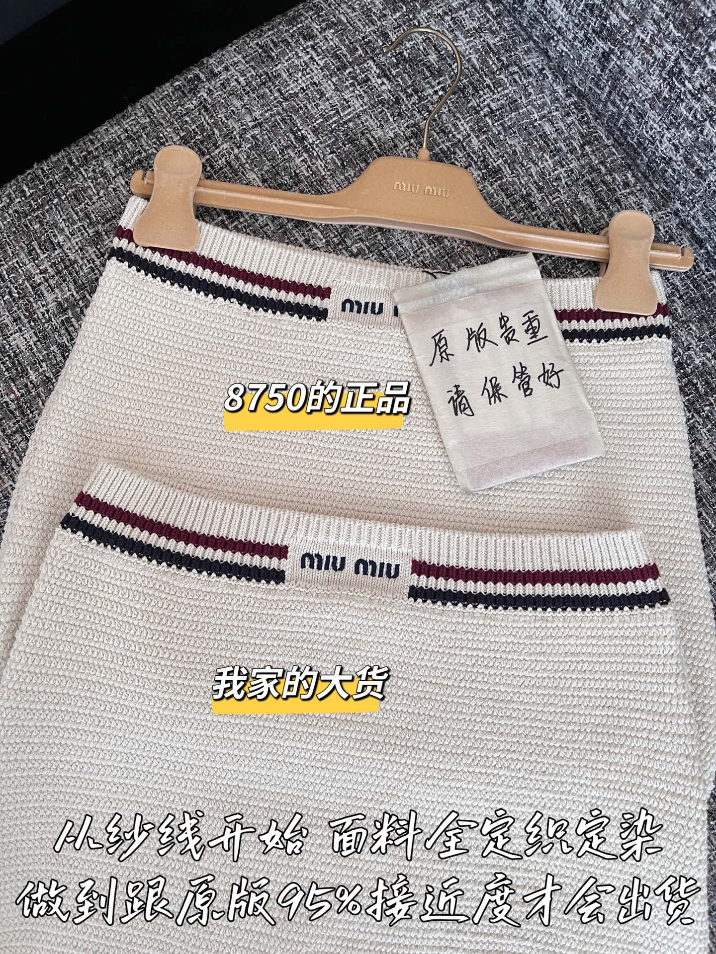这款衣服是AAAAA 1:1 质量 (非常棒). 使用了和原版一模一样的材料. 商标部分也保持了和缪缪/Miu Miu一样. 图片拍摄是实物衣服拍摄, 您所收到的实物保证和我们图片一模一样.