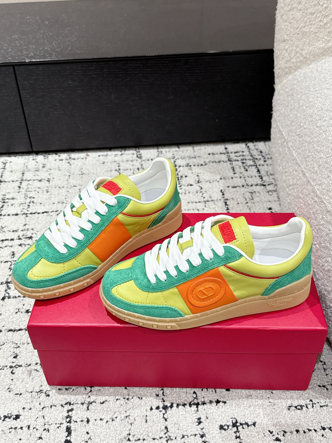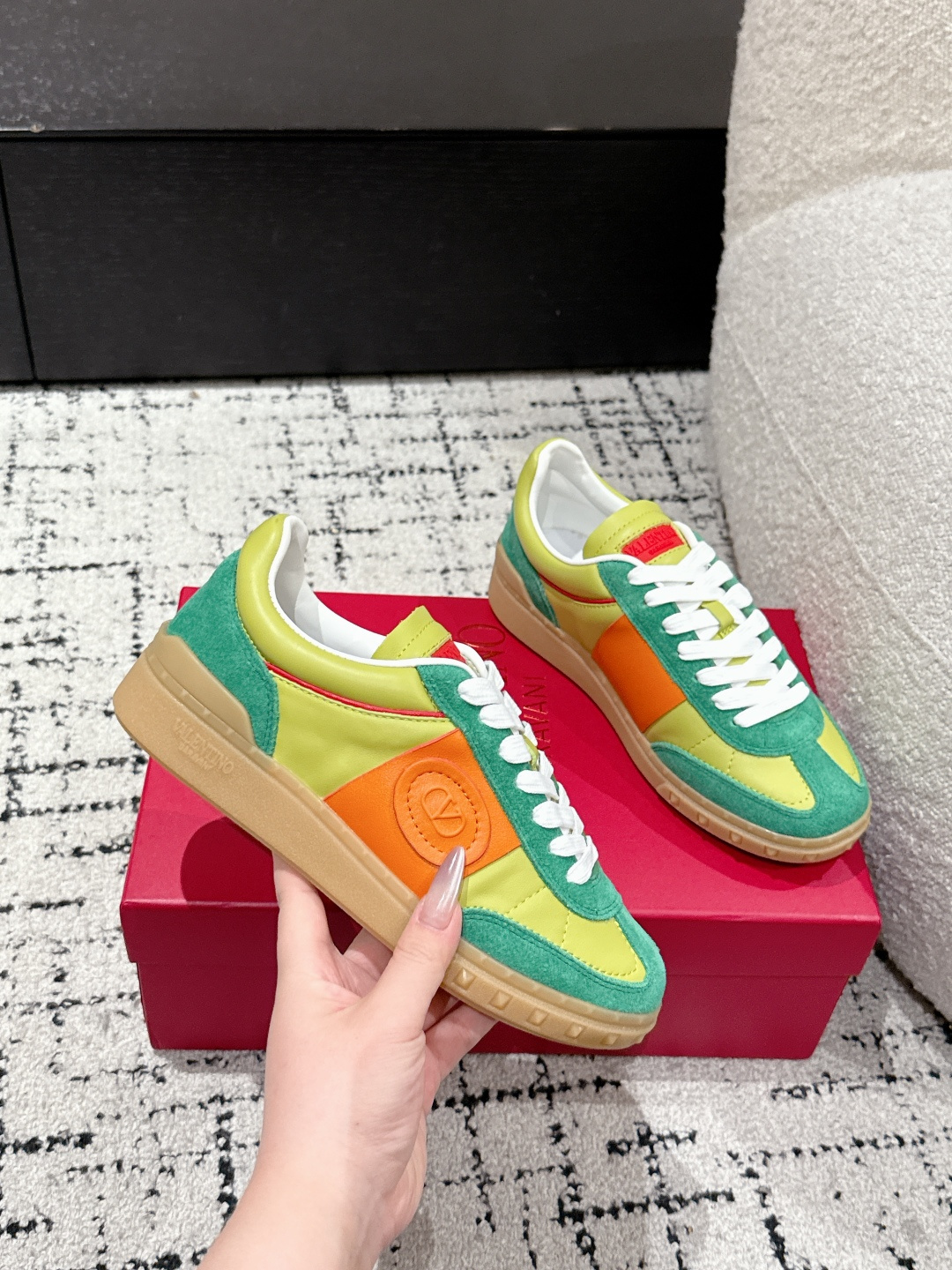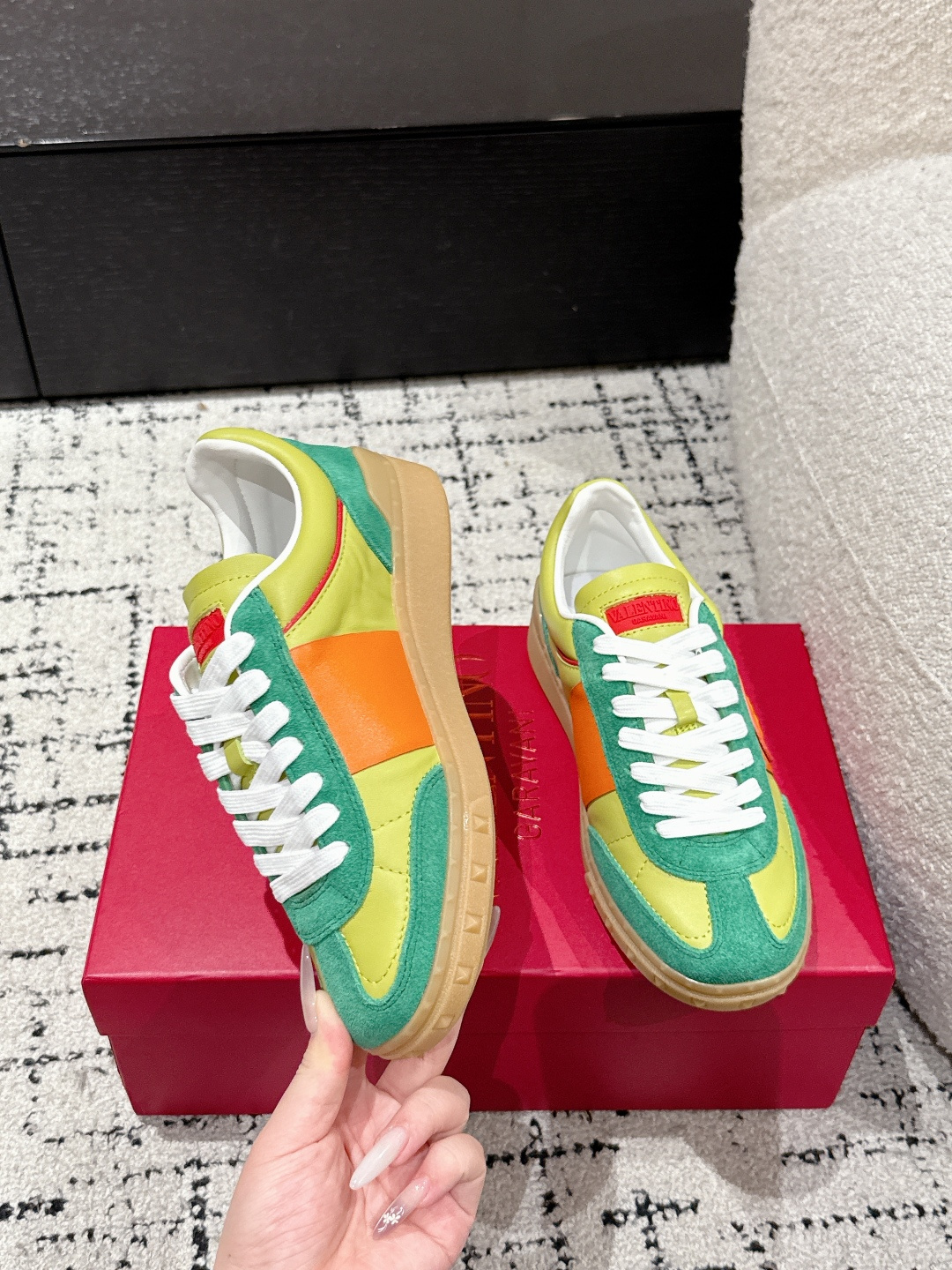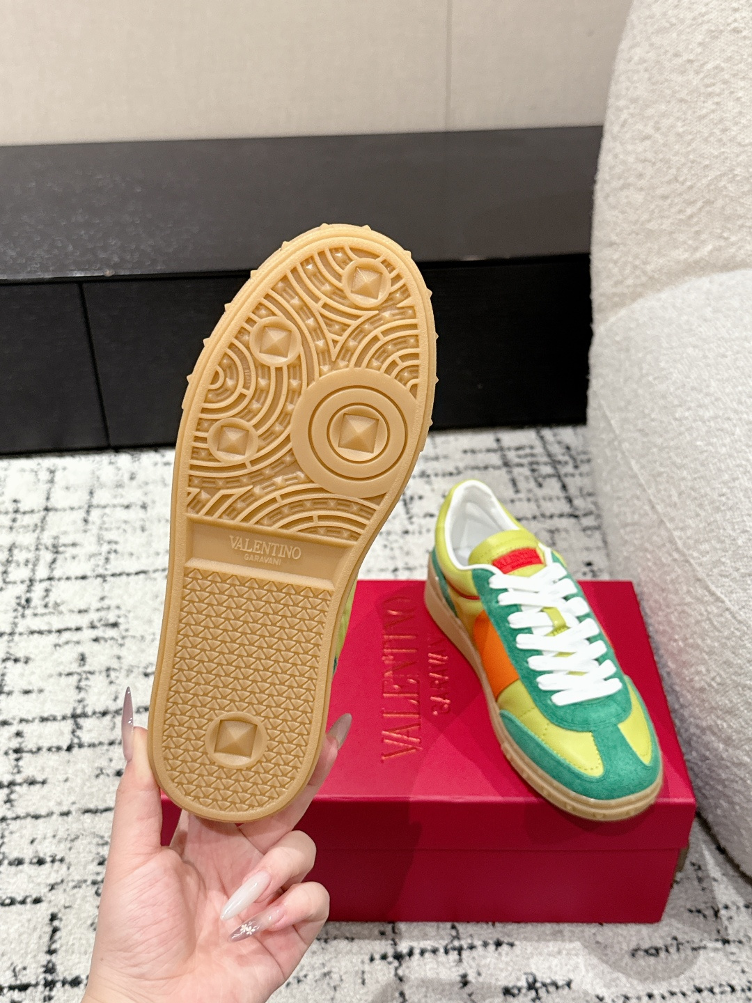 这款鞋子是AAAAA 1:1 质量 (非常棒). 使用了和原版一模一样的材料. 商标部分也保持了和华伦天奴/Valentino一样. 图片拍摄是实物鞋子拍摄, 您所收到的实物保证和我们图片一模一样.
