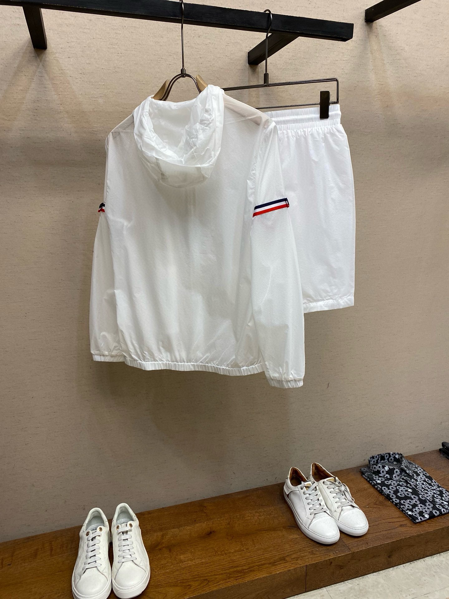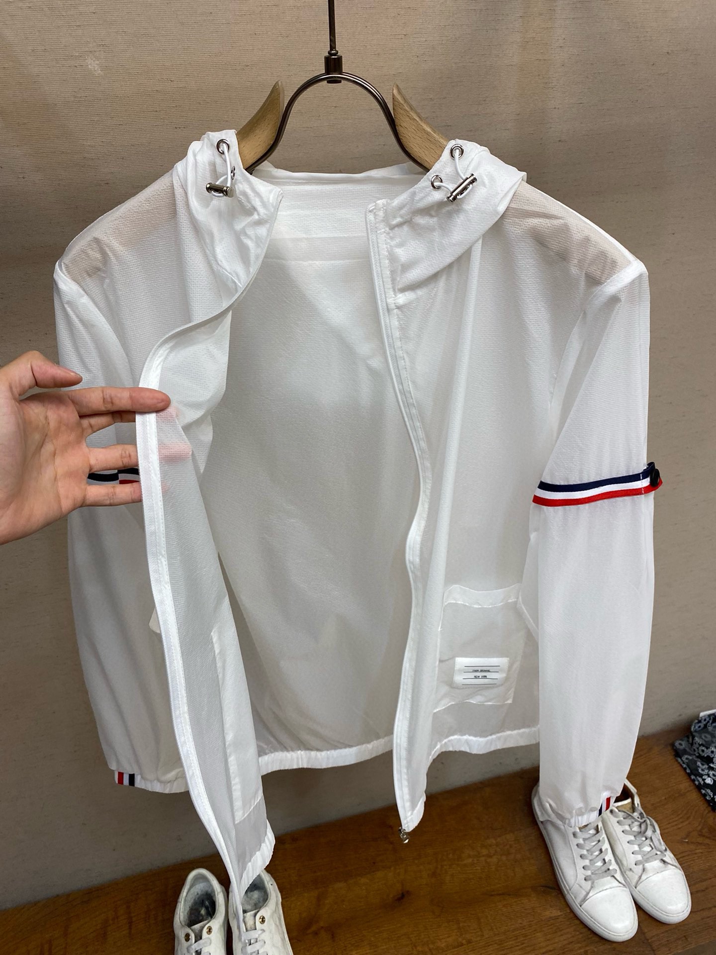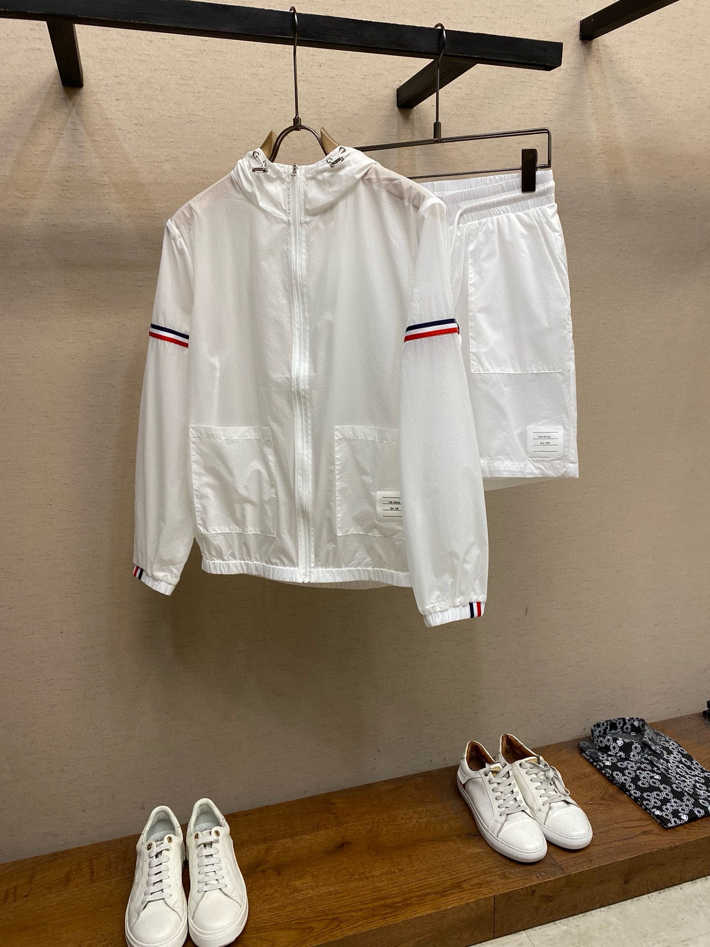 这款衣服是AAAAA 1:1 质量 (非常棒). 使用了和原版一模一样的材料. 商标部分也保持了和汤姆布朗/Thom Browne一样. 图片拍摄是实物衣服拍摄, 您所收到的实物保证和我们图片一模一样.