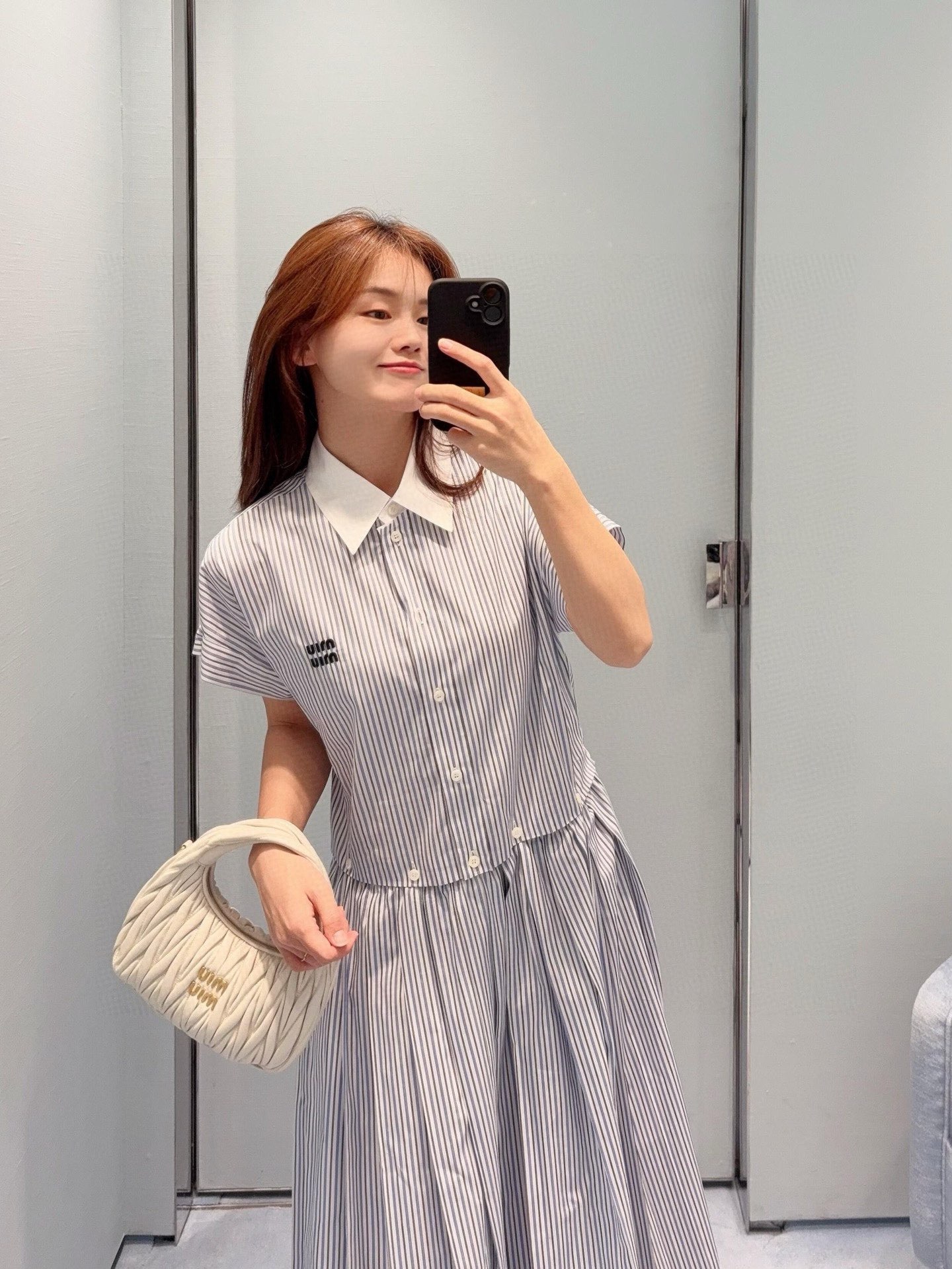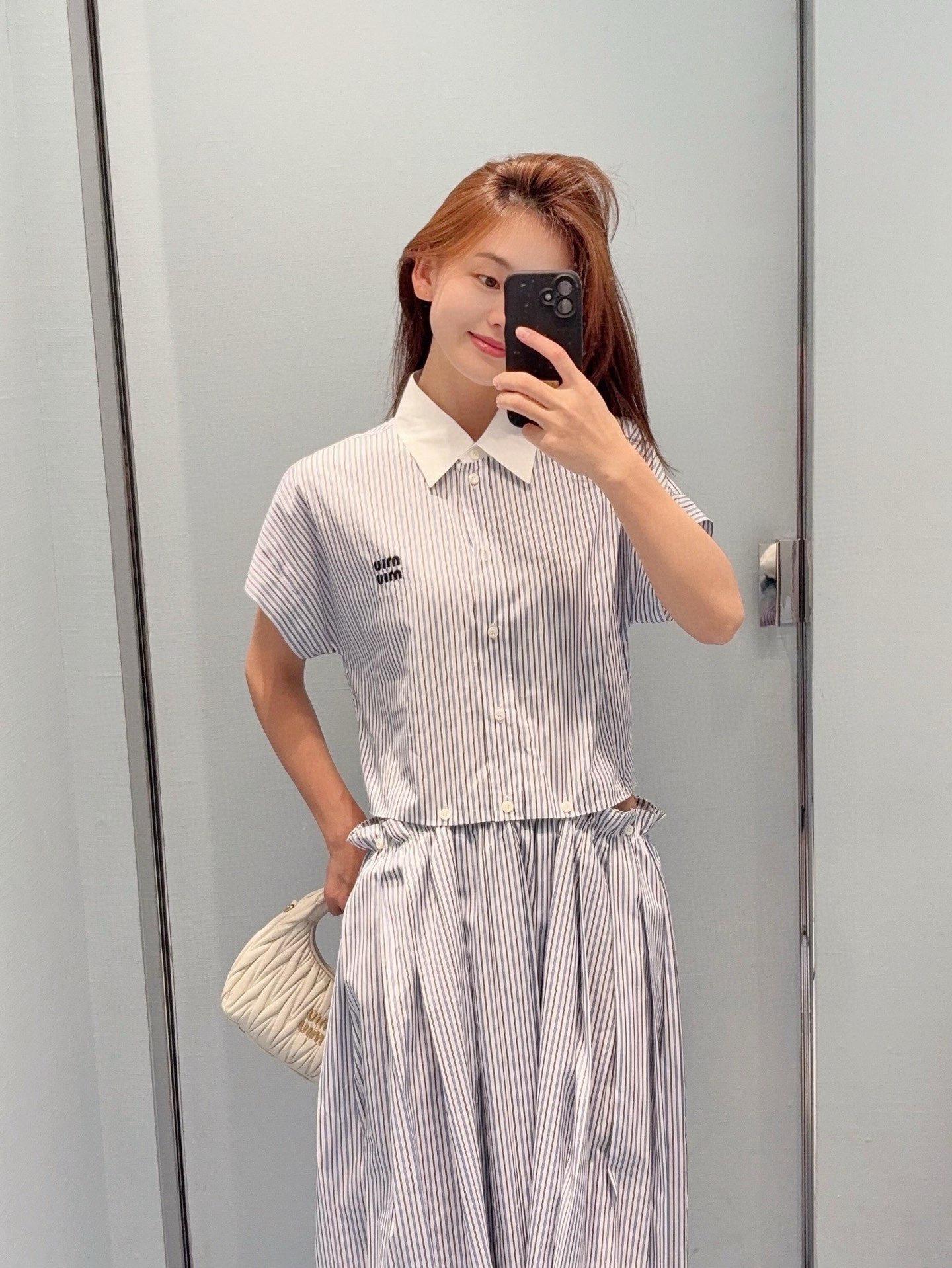 这款衣服是AAAAA 1:1 质量 (非常棒). 使用了和原版一模一样的材料. 商标部分也保持了和缪缪/Miu Miu一样. 图片拍摄是实物衣服拍摄, 您所收到的实物保证和我们图片一模一样.