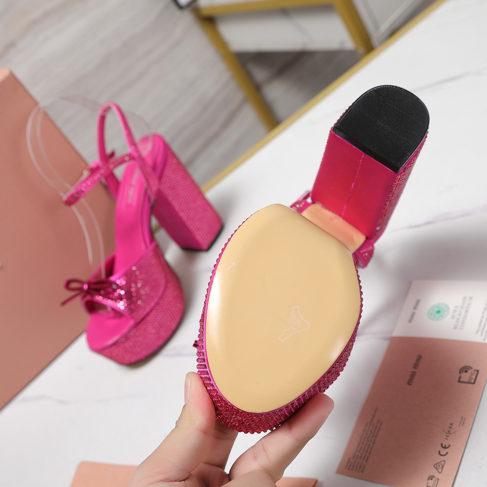这款鞋子是AAAAA 1:1 质量 (非常棒). 使用了和原版一模一样的材料. 商标部分也保持了和缪缪/Miu Miu一样. 图片拍摄是实物鞋子拍摄, 您所收到的实物保证和我们图片一模一样.