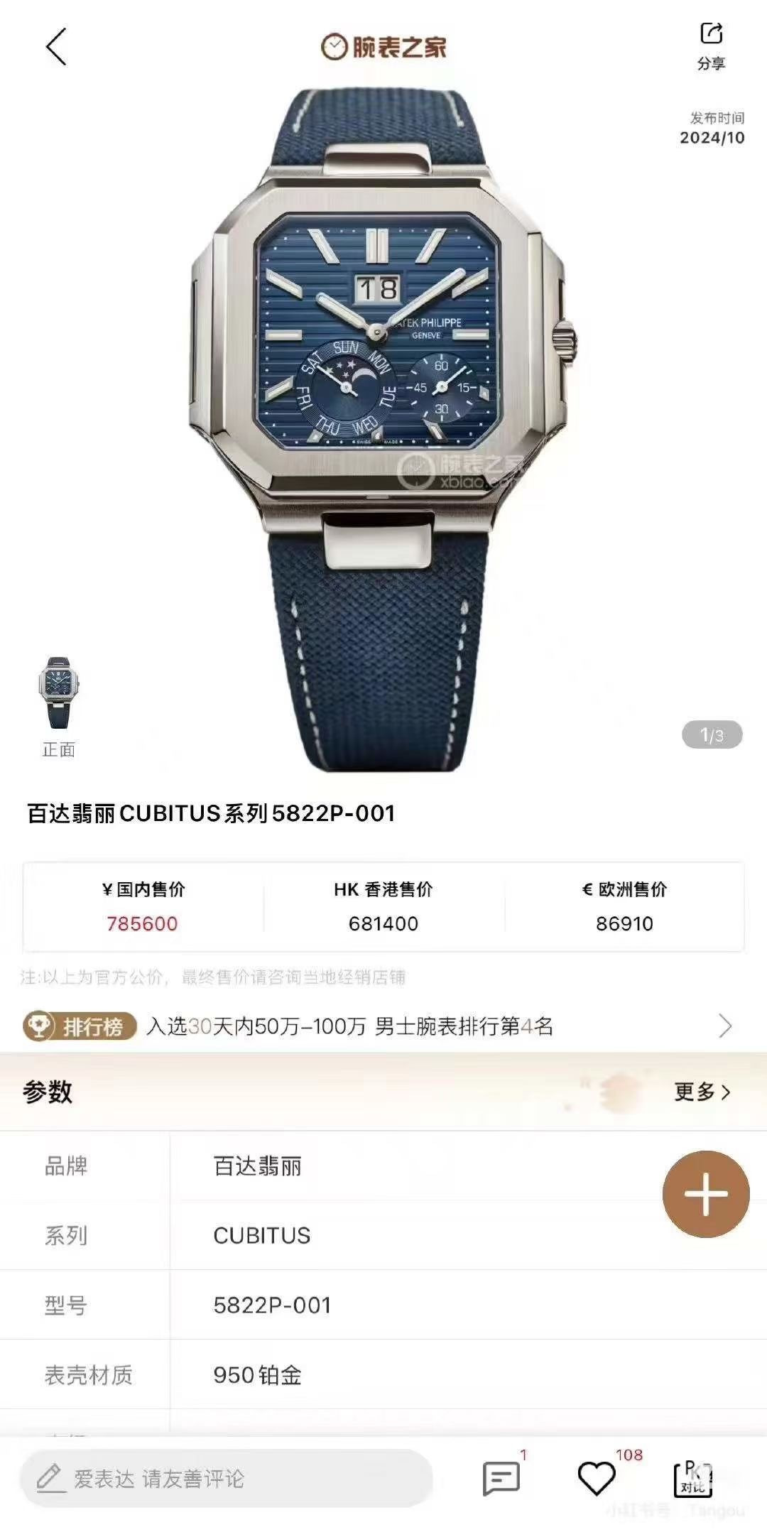这款手表是AAAAA 1:1 质量 (非常棒). 使用了和原版一模一样的材料. 商标部分也保持了和百达翡丽/Patek Philippe一样. 图片拍摄是实物手表拍摄, 您所收到的实物保证和我们图片一模一样.