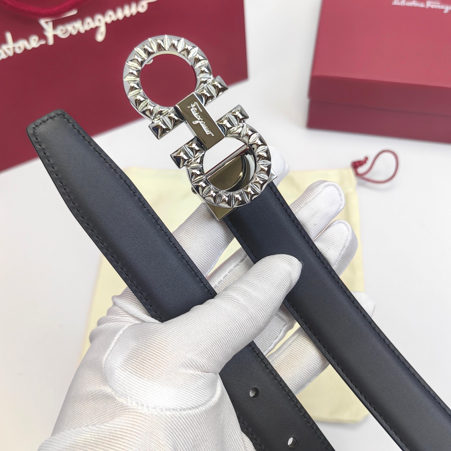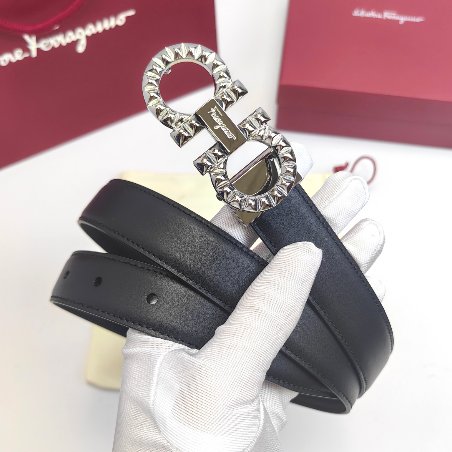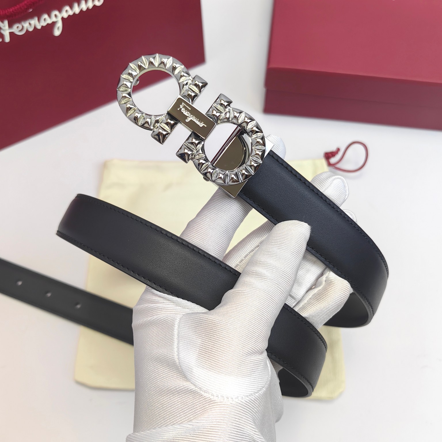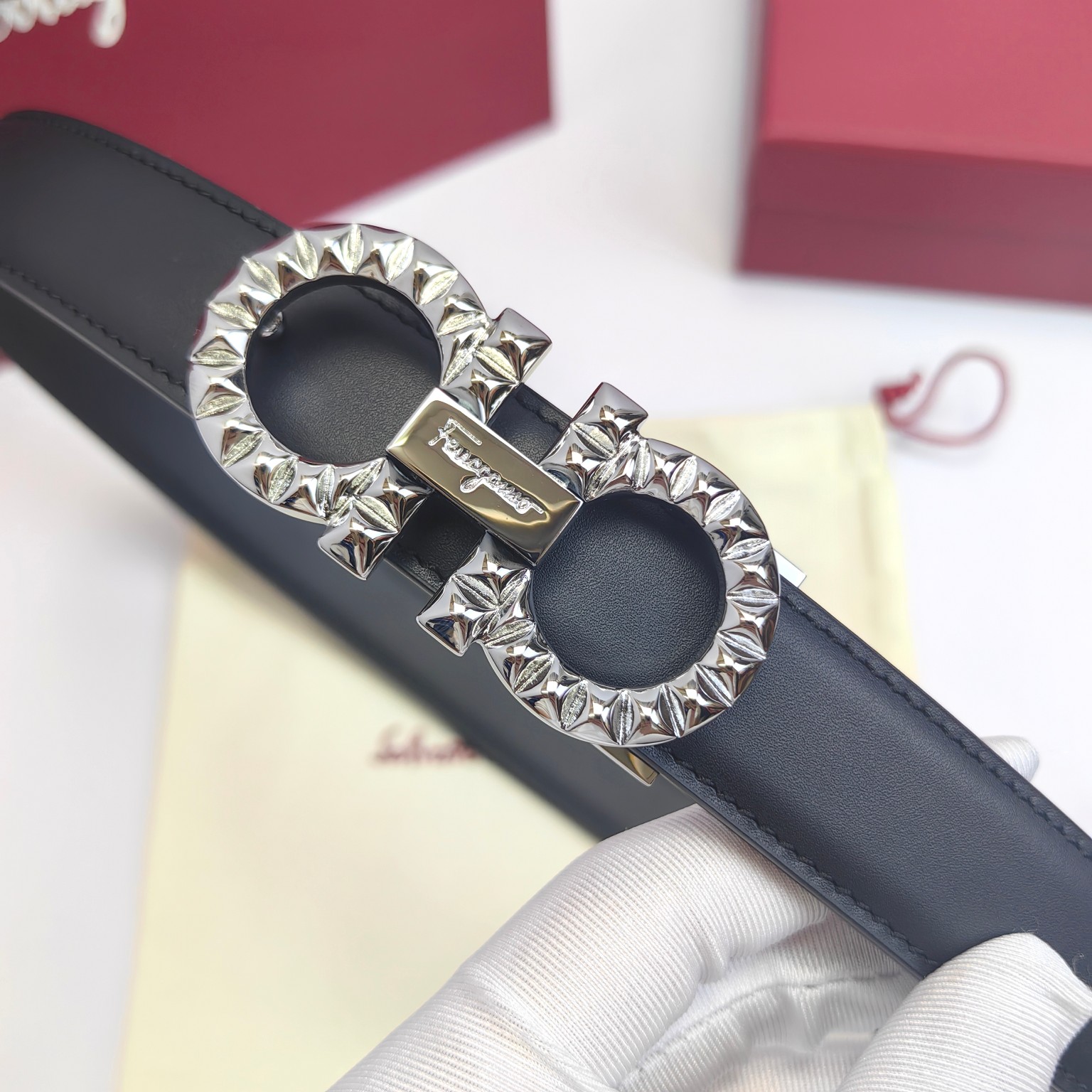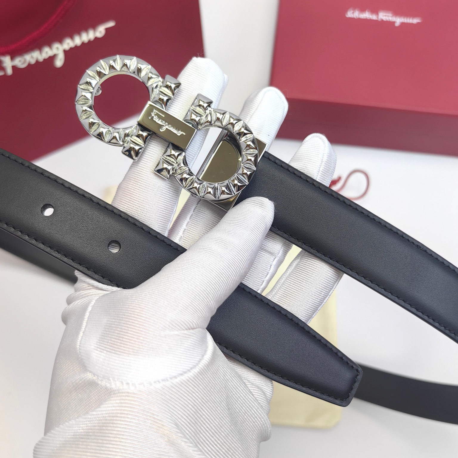 这款皮带是AAAAA 1:1 质量 (非常棒). 使用了和原版一模一样的材料. 商标部分也保持了和菲拉格慕/Salvatore Ferragamo一样. 图片拍摄是实物皮带拍摄, 您所收到的实物保证和我们图片一模一样.