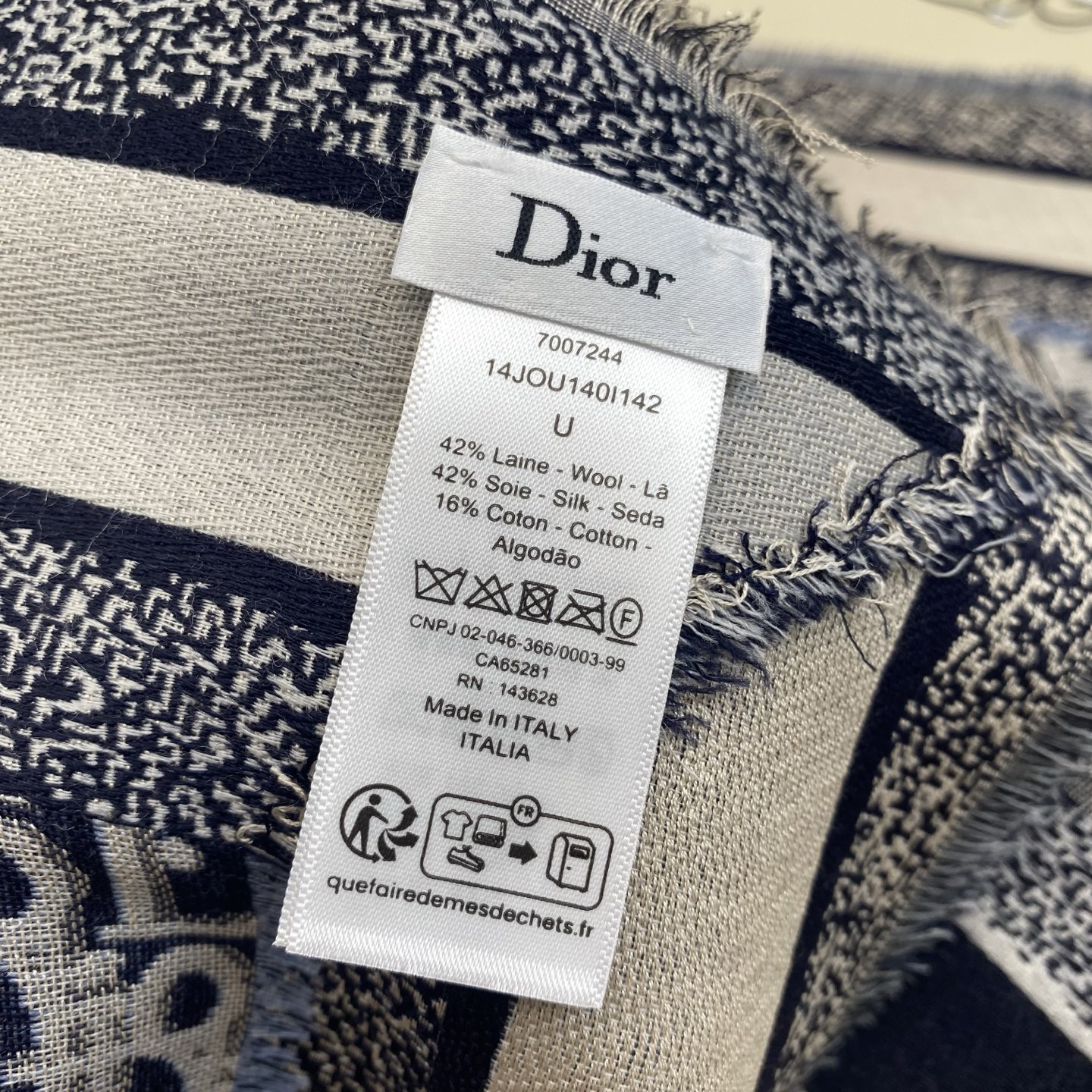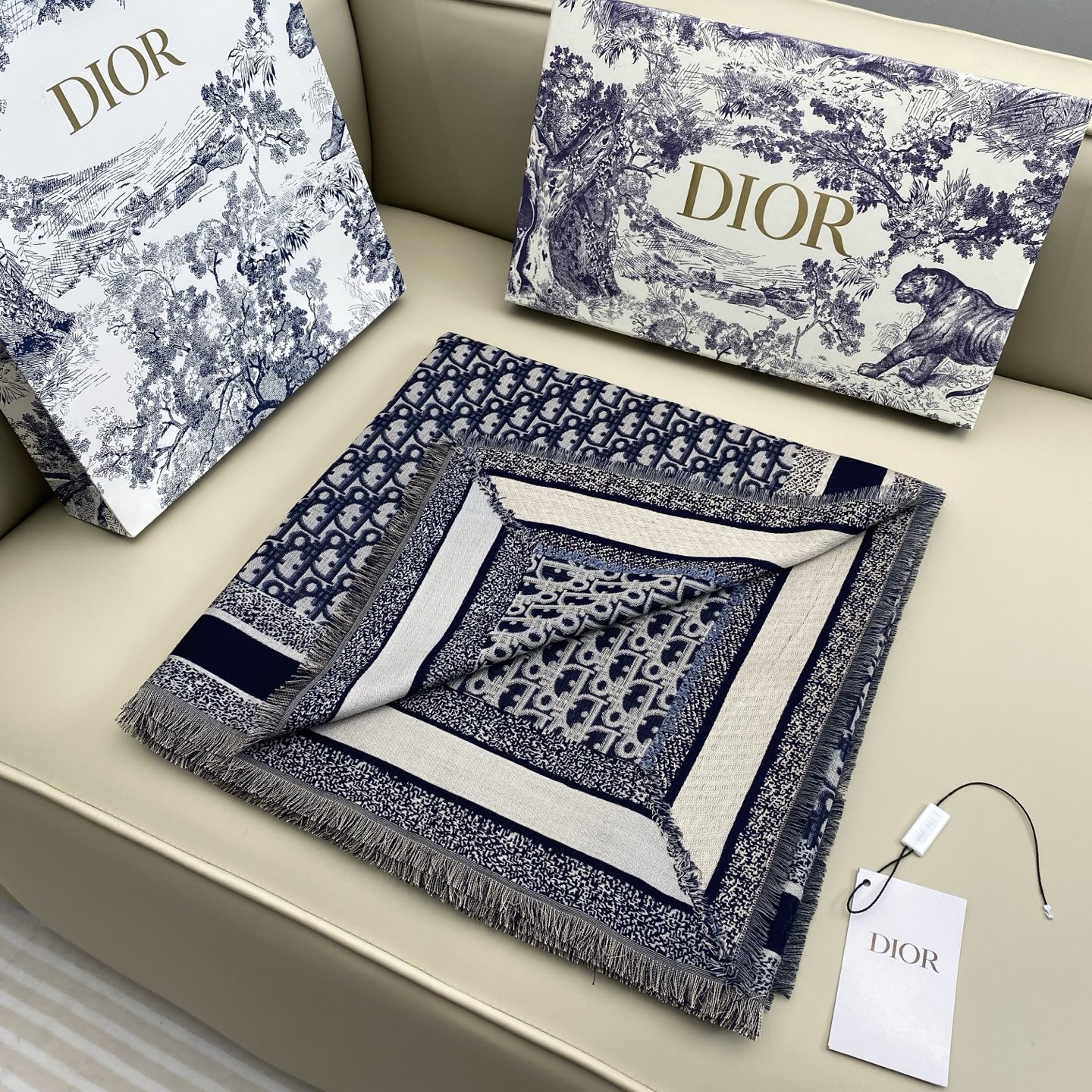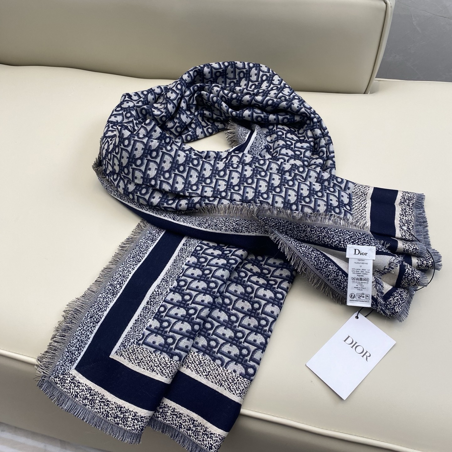这款围巾是AAAAA 1:1 质量 (非常棒). 使用了和原版一模一样的材料. 商标部分也保持了和迪奥/Dior一样. 图片拍摄是实物围巾拍摄, 您所收到的实物保证和我们图片一模一样.