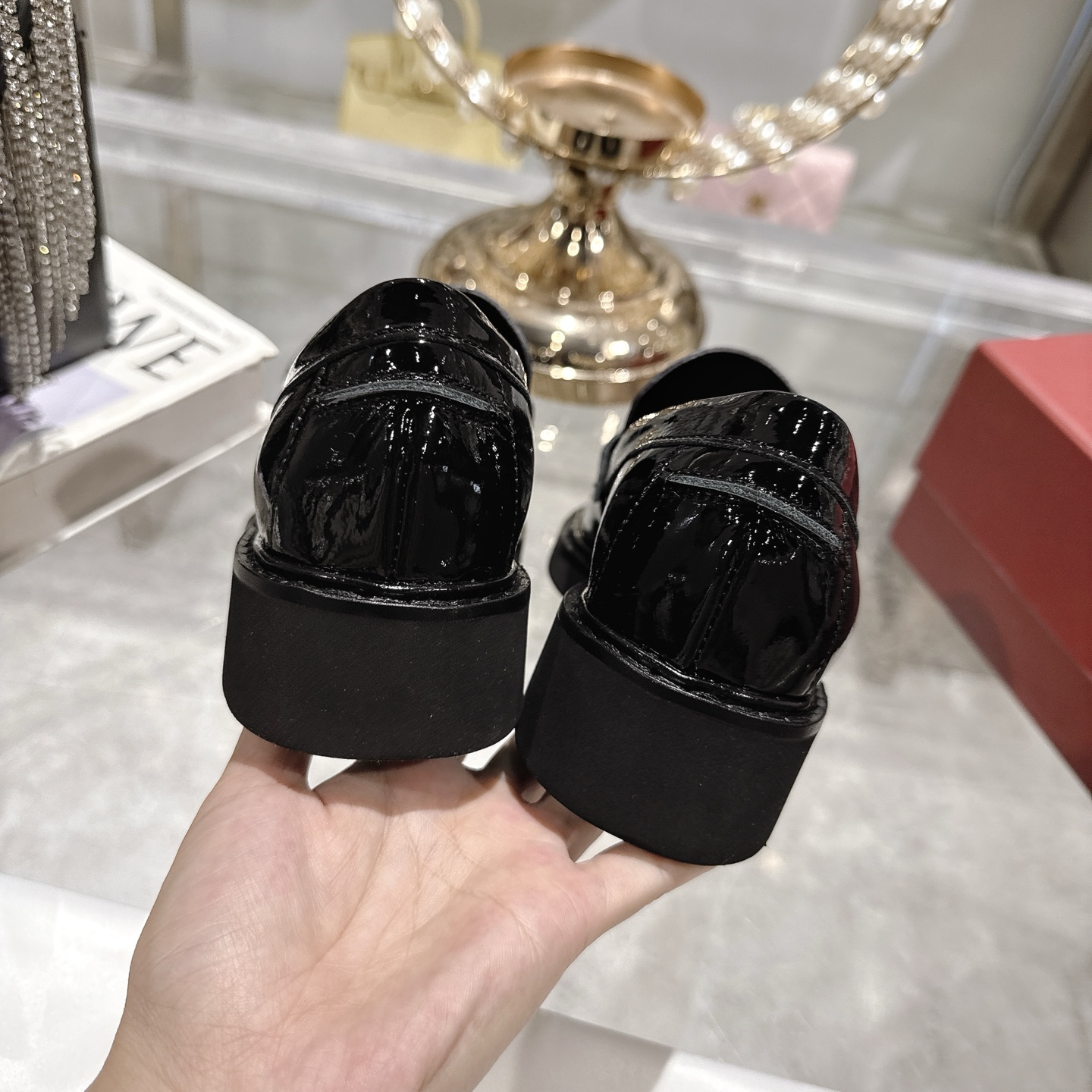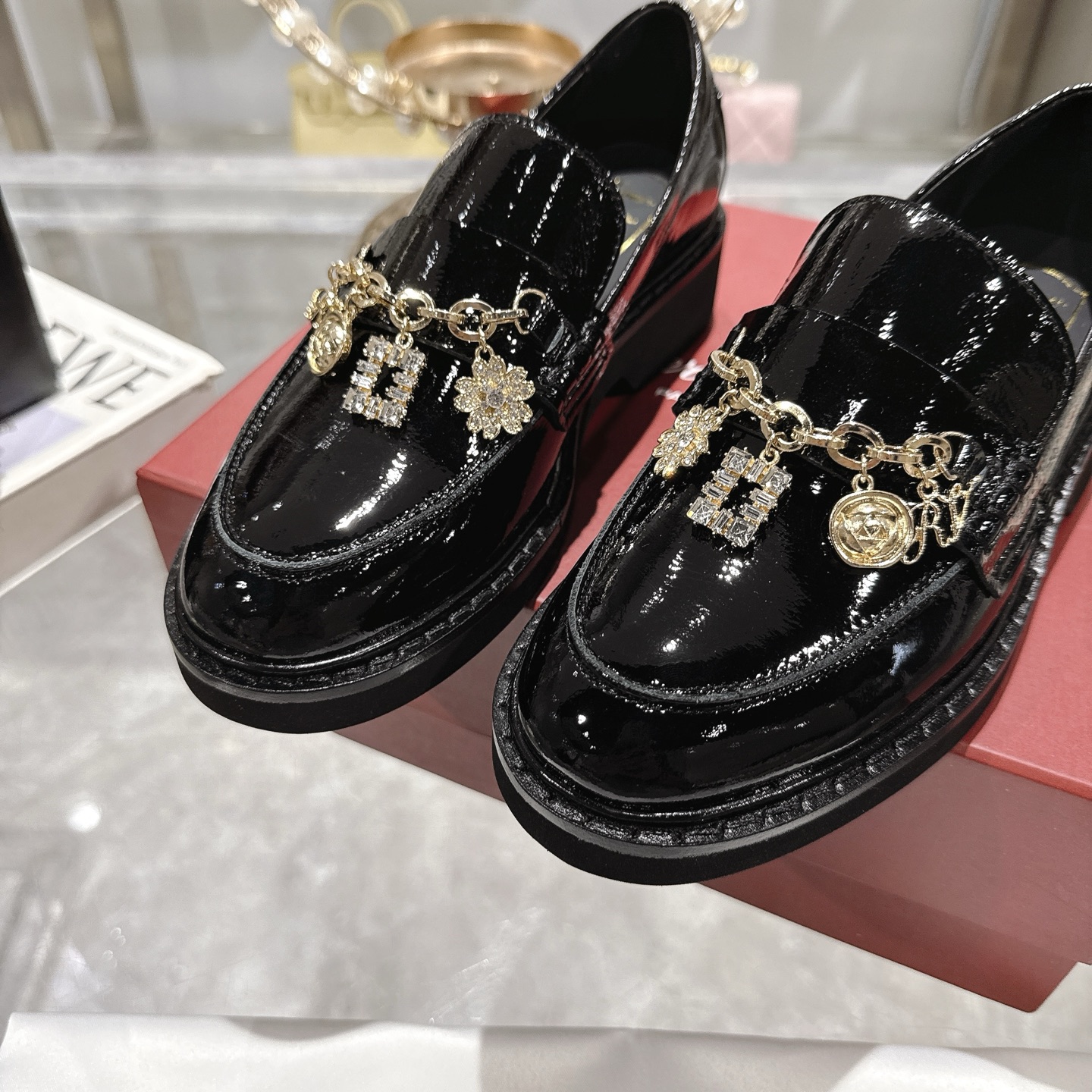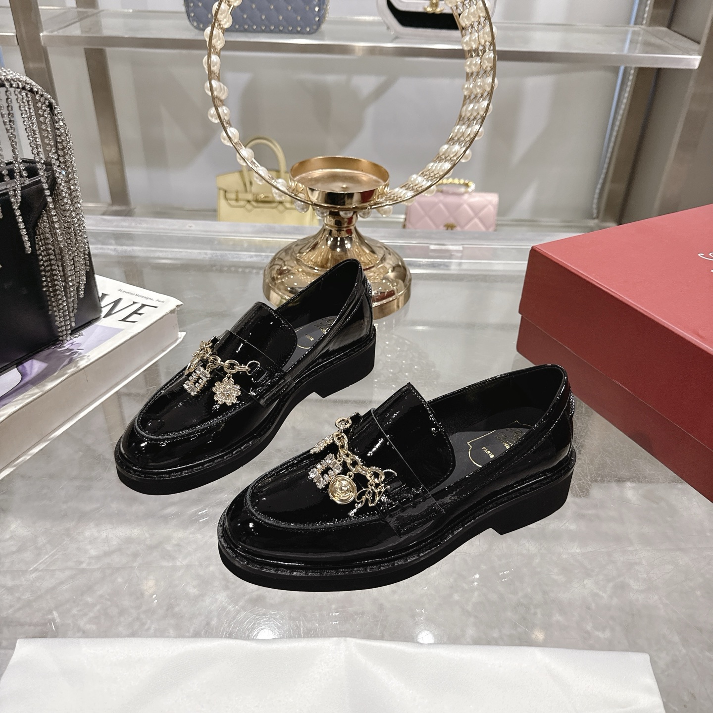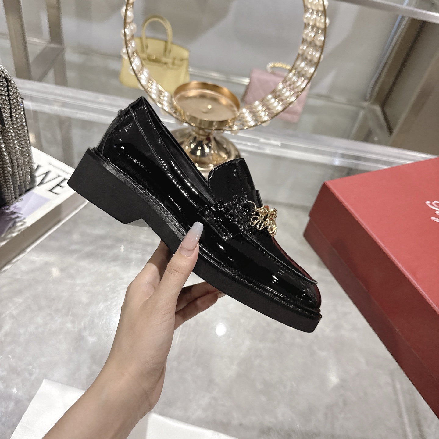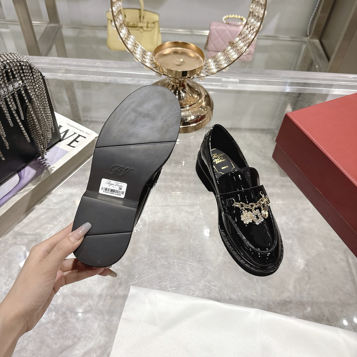 这款鞋子是AAAAA 1:1 质量 (非常棒). 使用了和原版一模一样的材料. 商标部分也保持了和罗杰维维耶/Roger Vivier一样. 图片拍摄是实物鞋子拍摄, 您所收到的实物保证和我们图片一模一样.