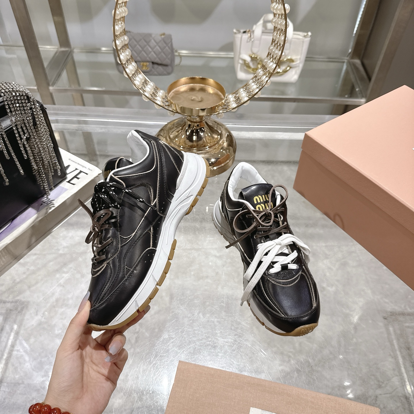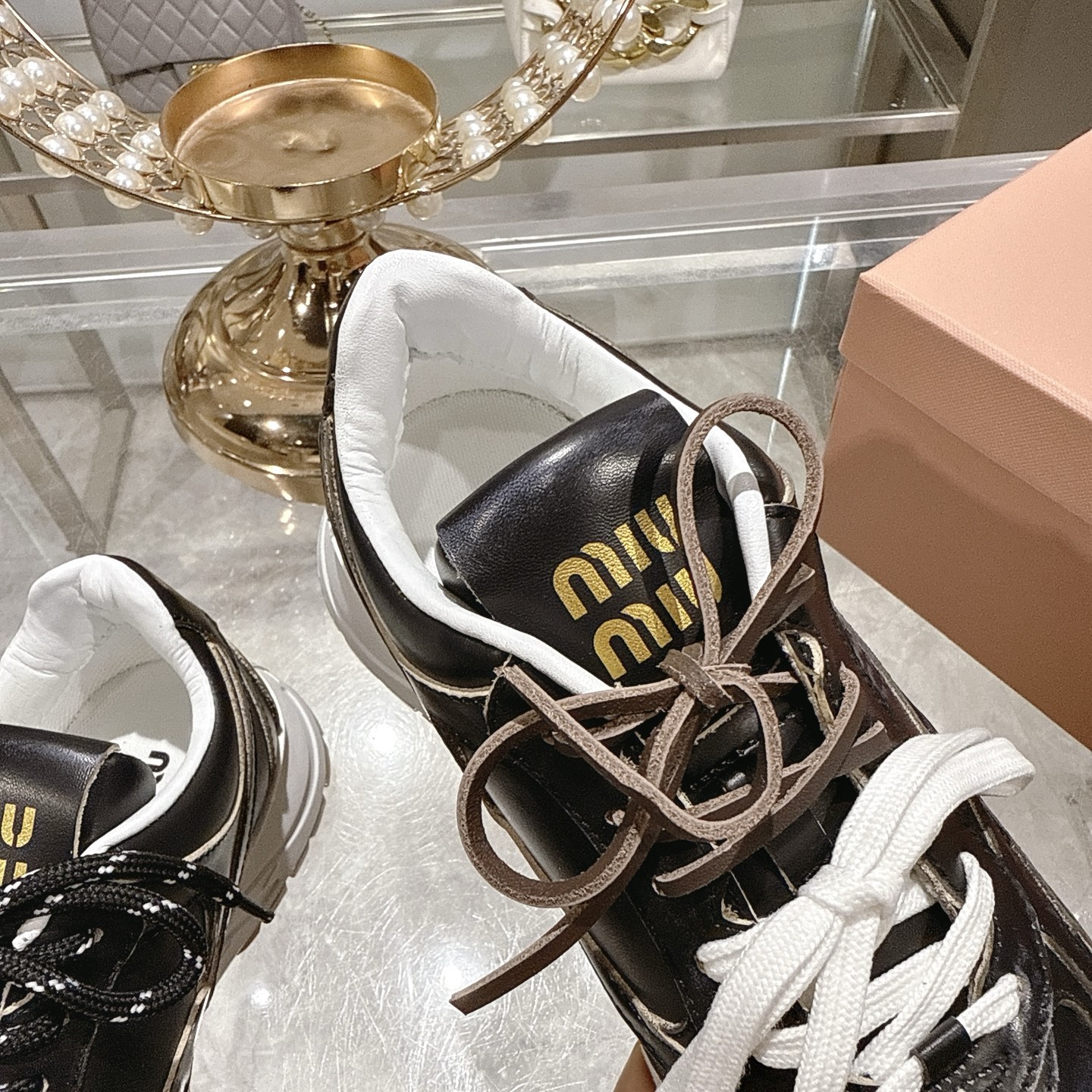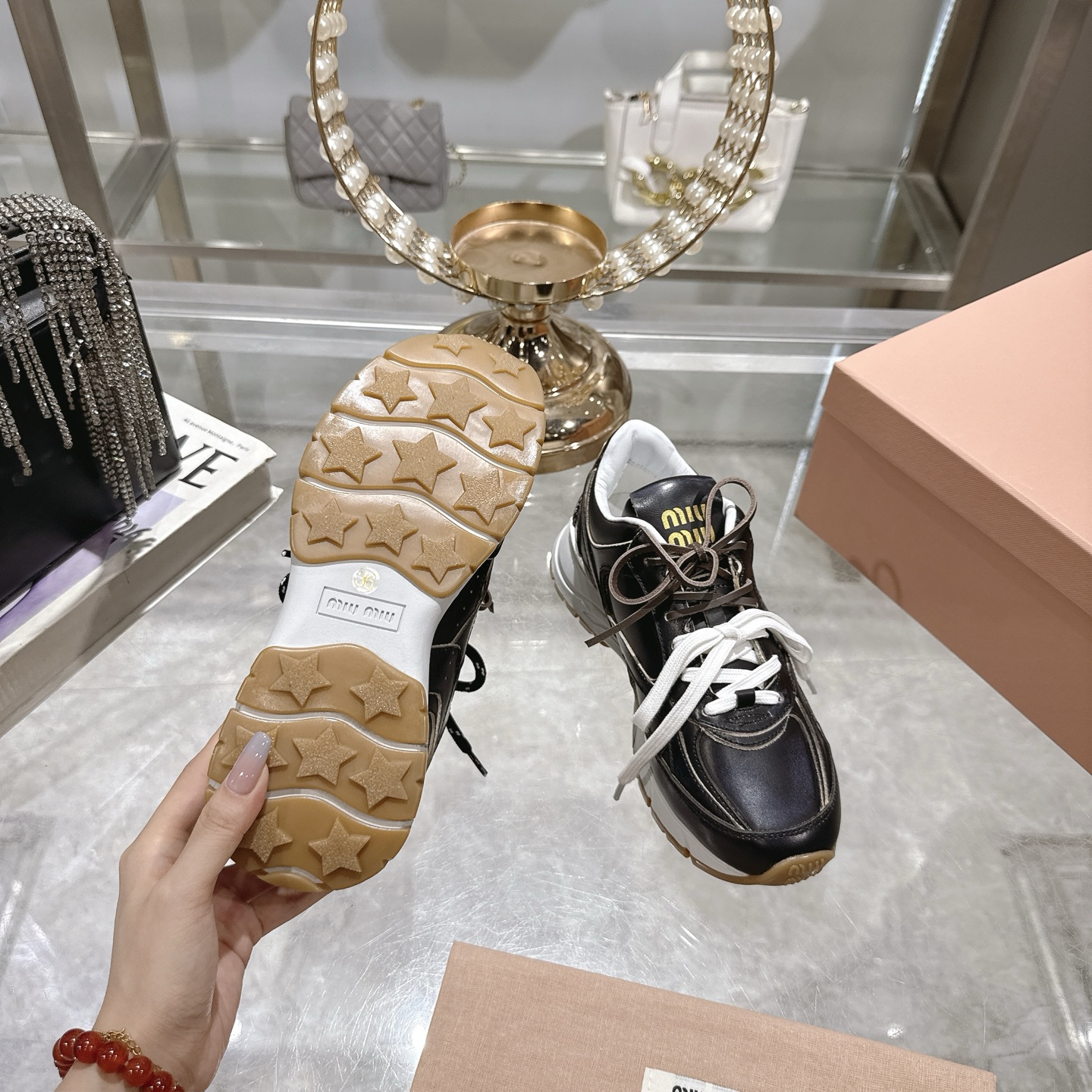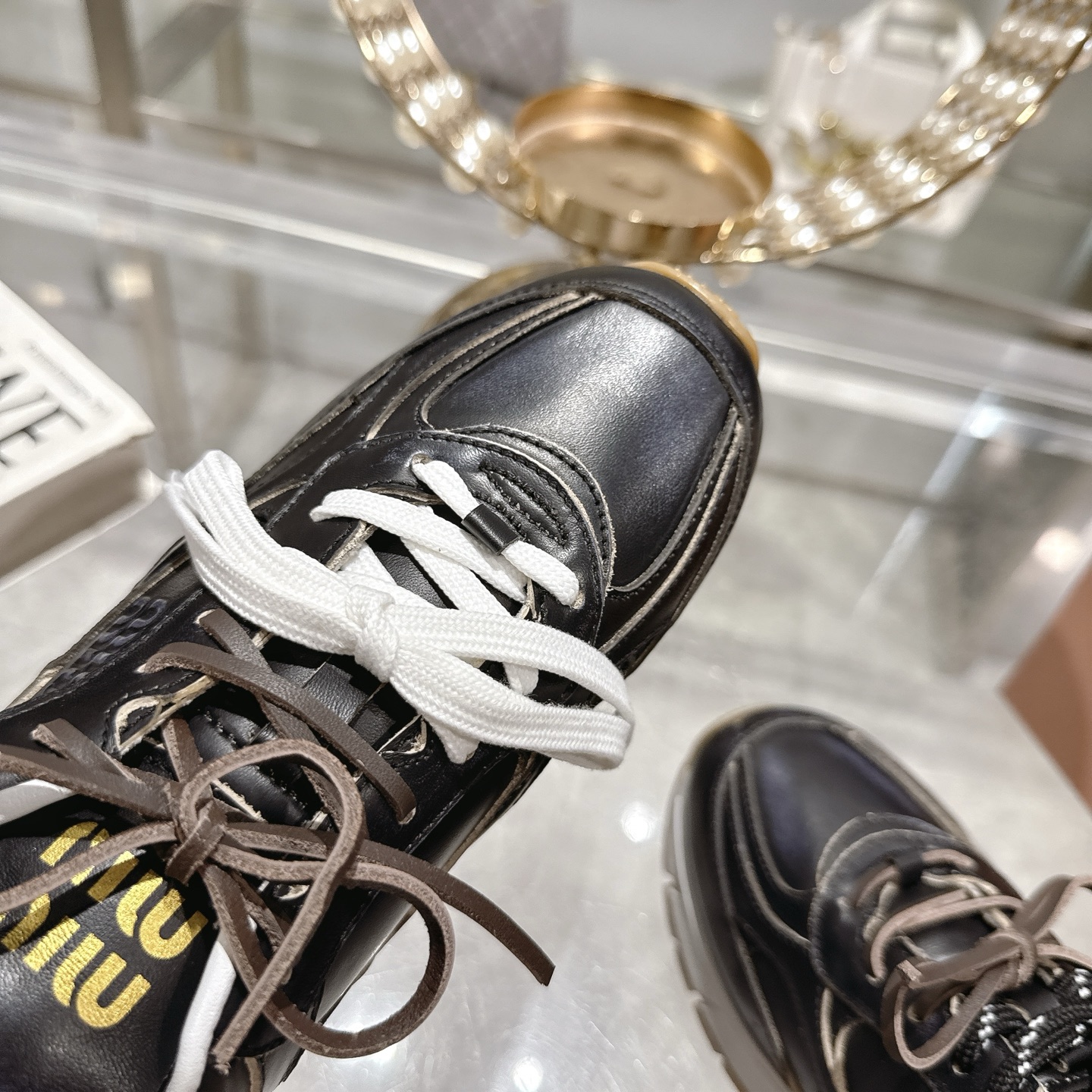 这款鞋子是AAAAA 1:1 质量 (非常棒). 使用了和原版一模一样的材料. 商标部分也保持了和缪缪/Miu Miu一样. 图片拍摄是实物鞋子拍摄, 您所收到的实物保证和我们图片一模一样.
