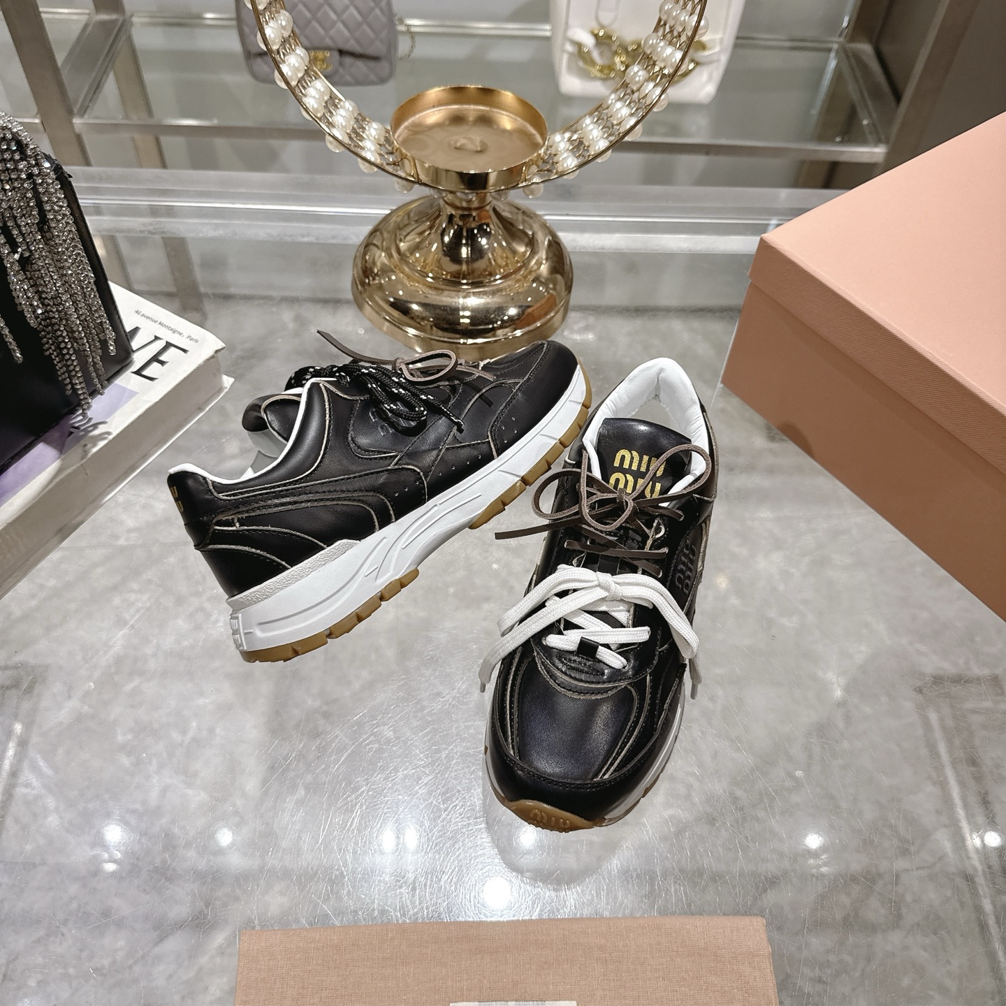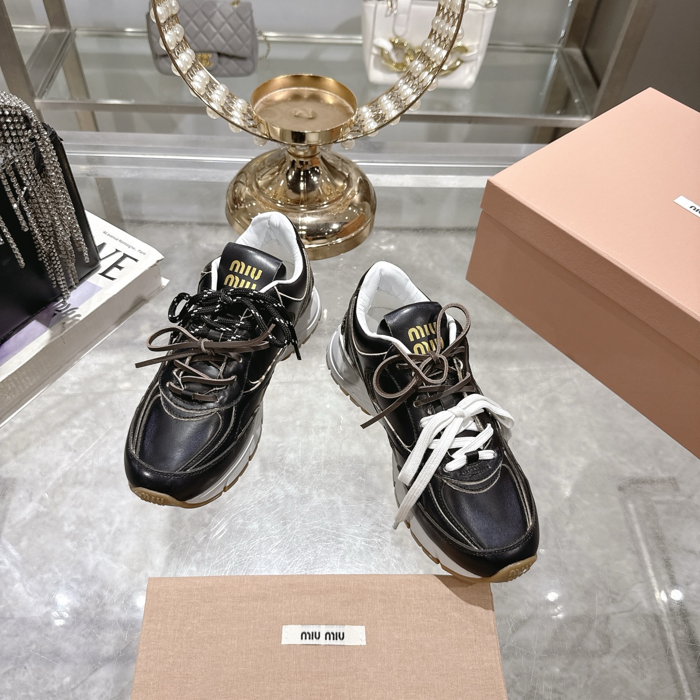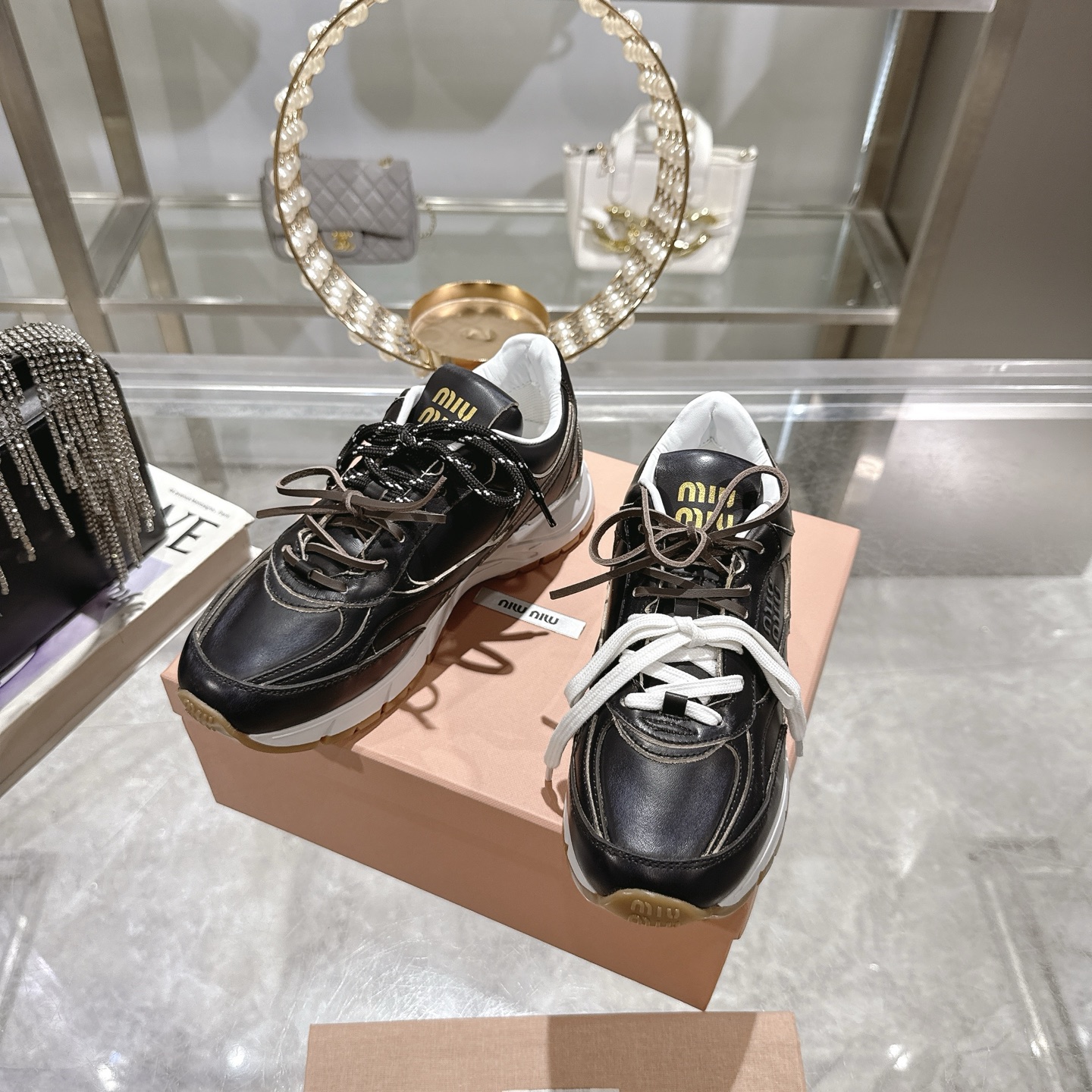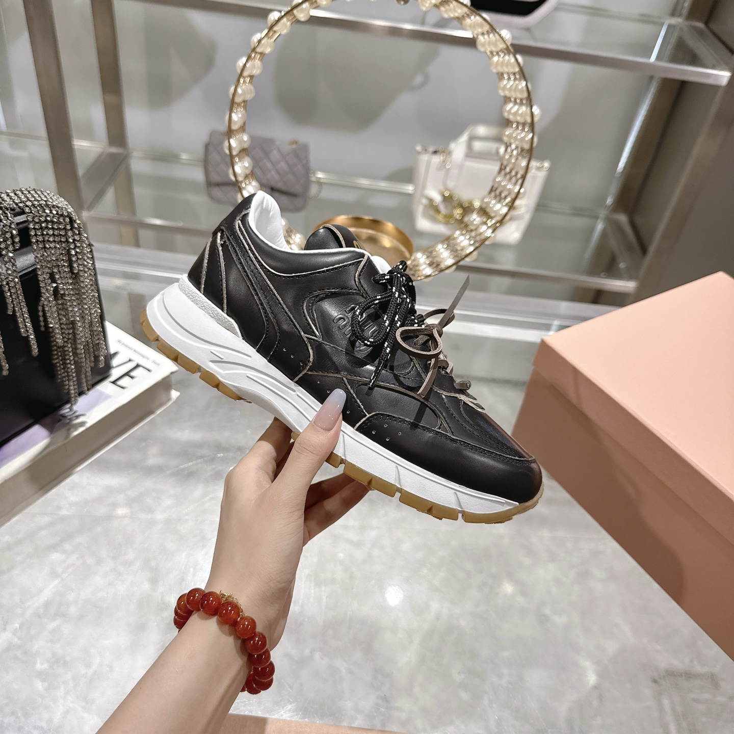 这款鞋子是AAAAA 1:1 质量 (非常棒). 使用了和原版一模一样的材料. 商标部分也保持了和缪缪/Miu Miu一样. 图片拍摄是实物鞋子拍摄, 您所收到的实物保证和我们图片一模一样.