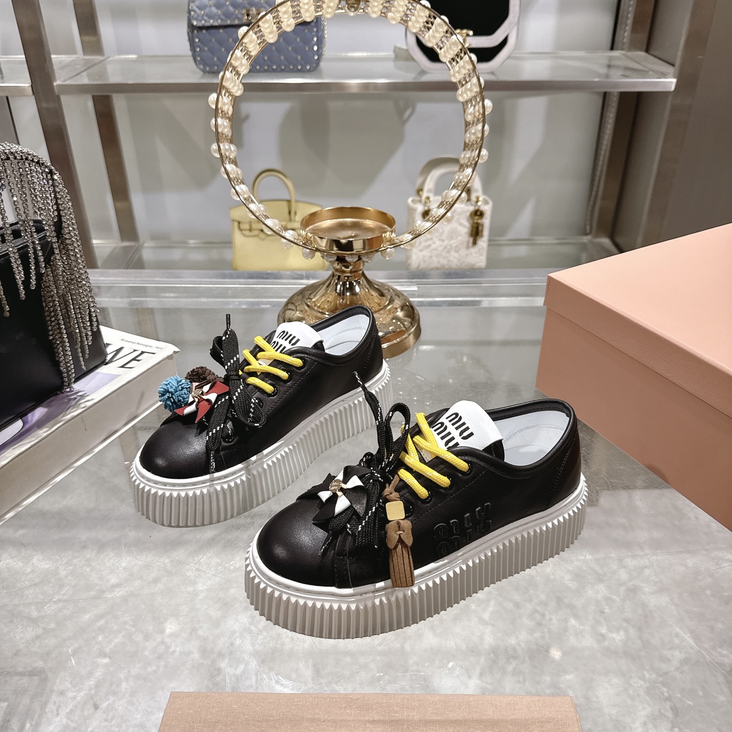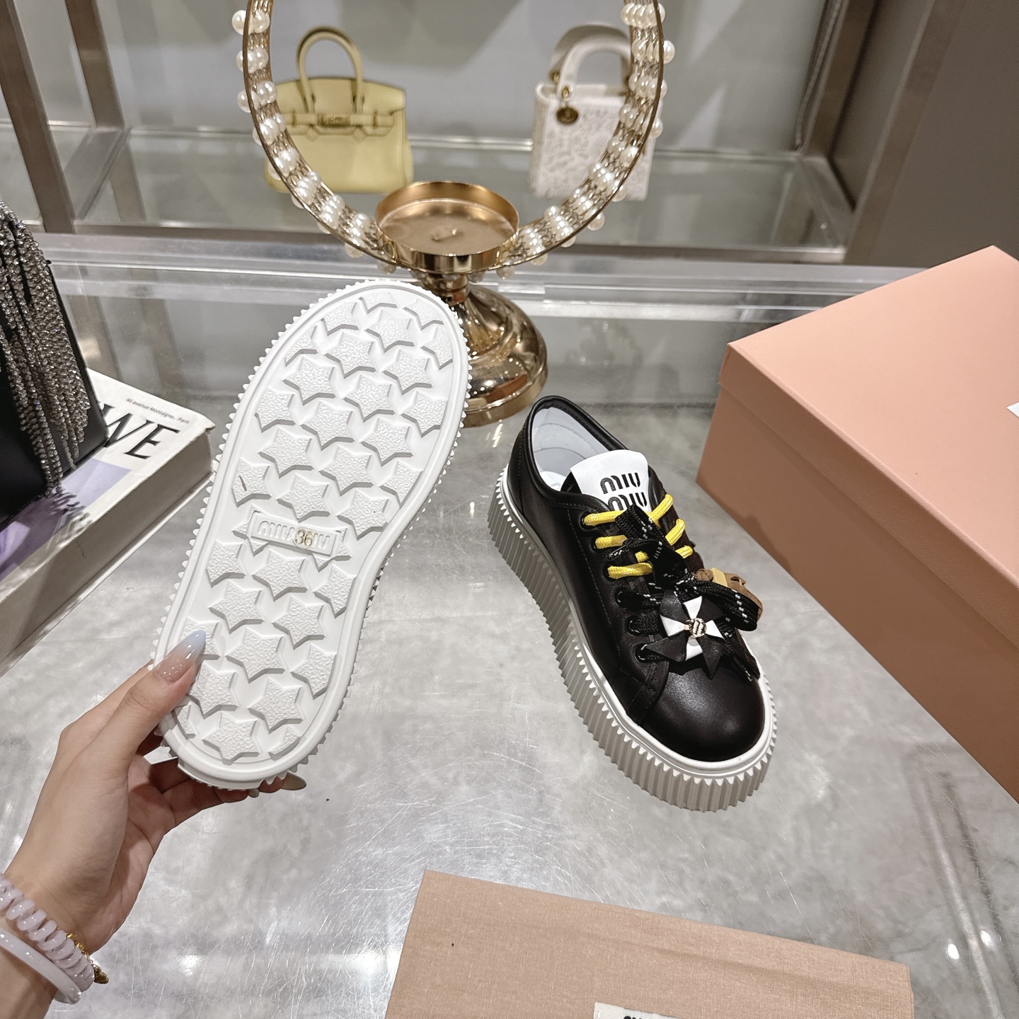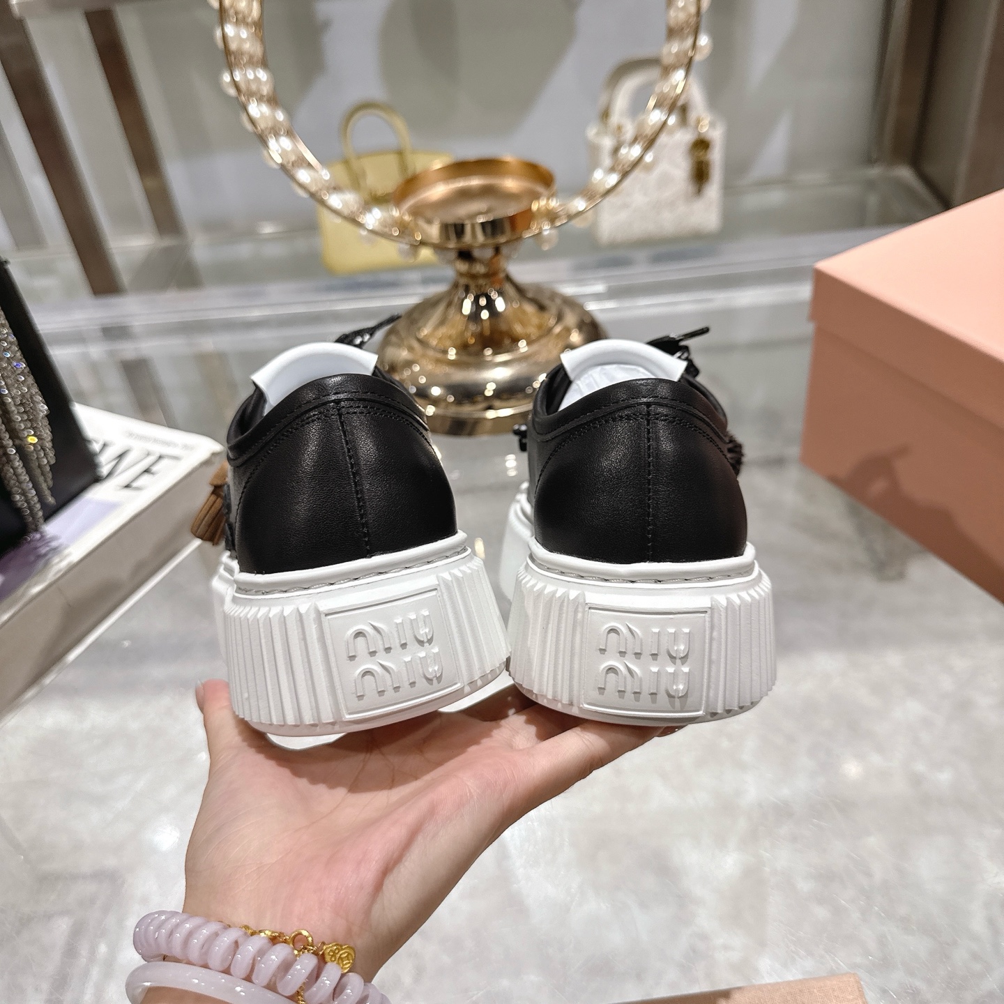 这款鞋子是AAAAA 1:1 质量 (非常棒). 使用了和原版一模一样的材料. 商标部分也保持了和缪缪/Miu Miu一样. 图片拍摄是实物鞋子拍摄, 您所收到的实物保证和我们图片一模一样.