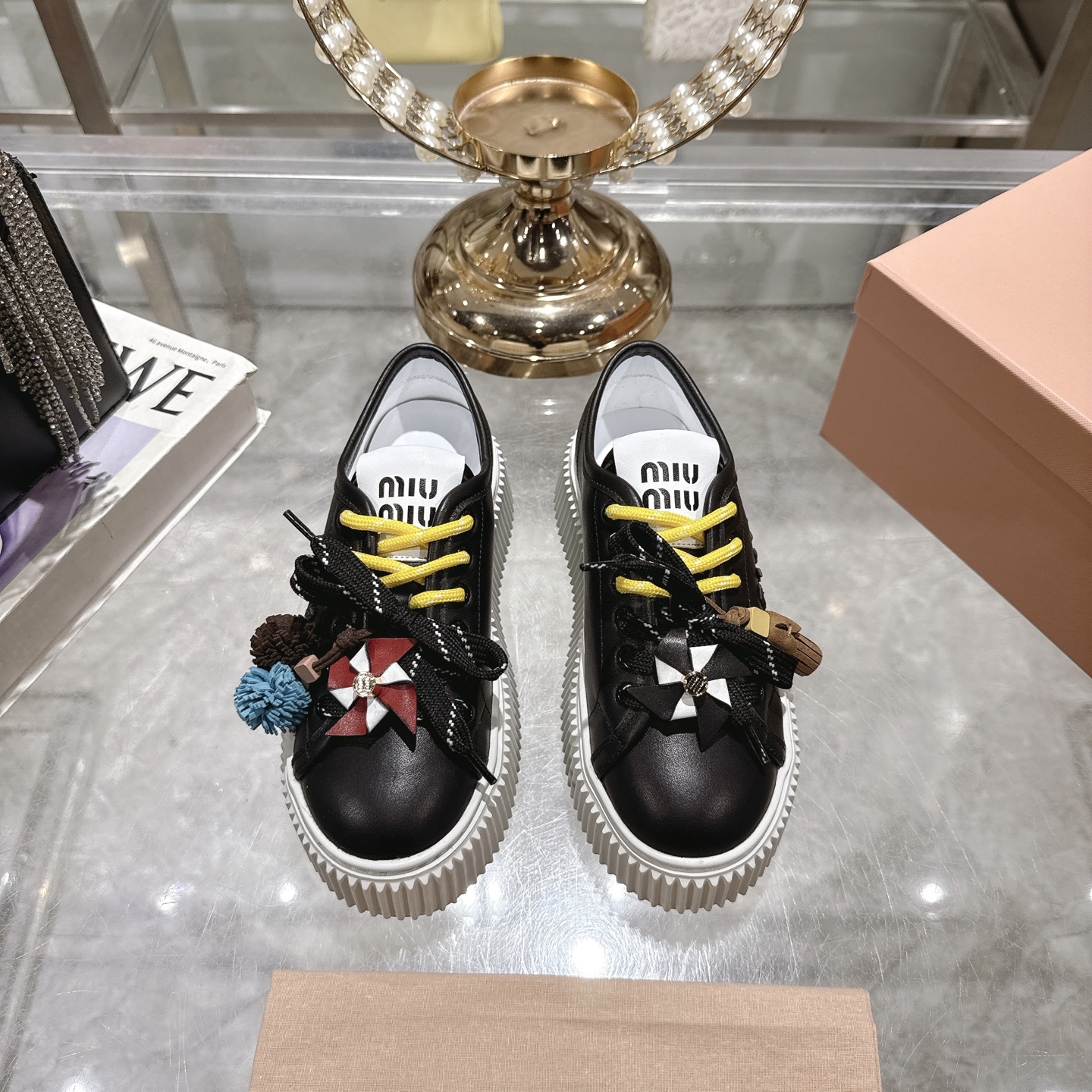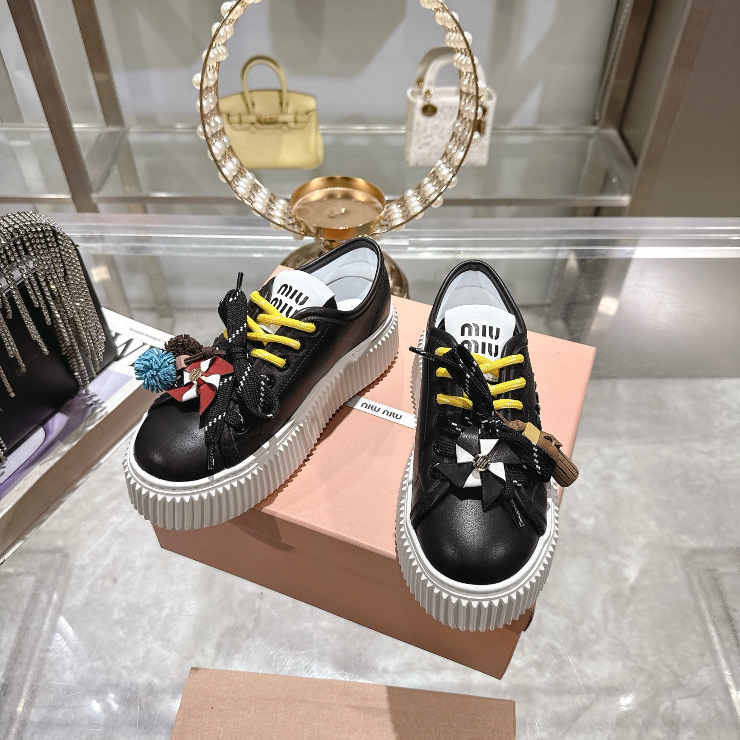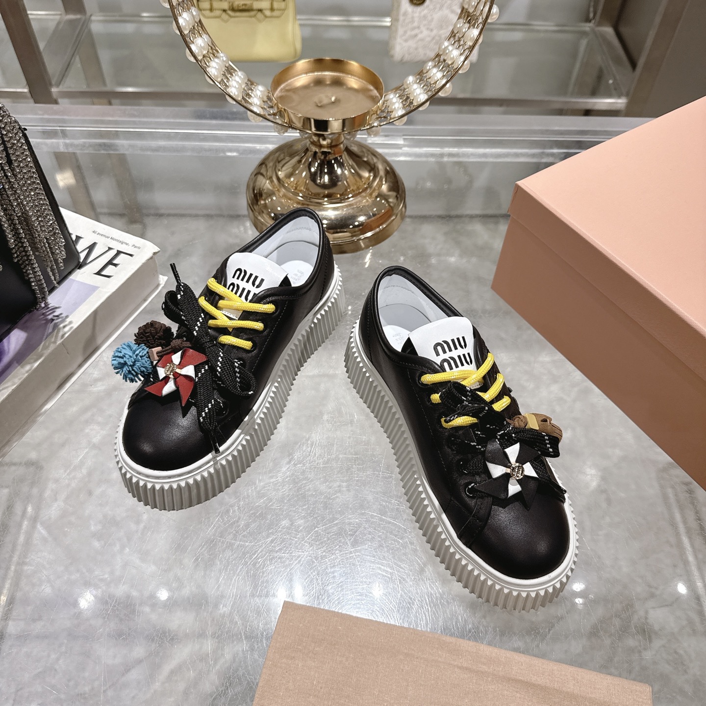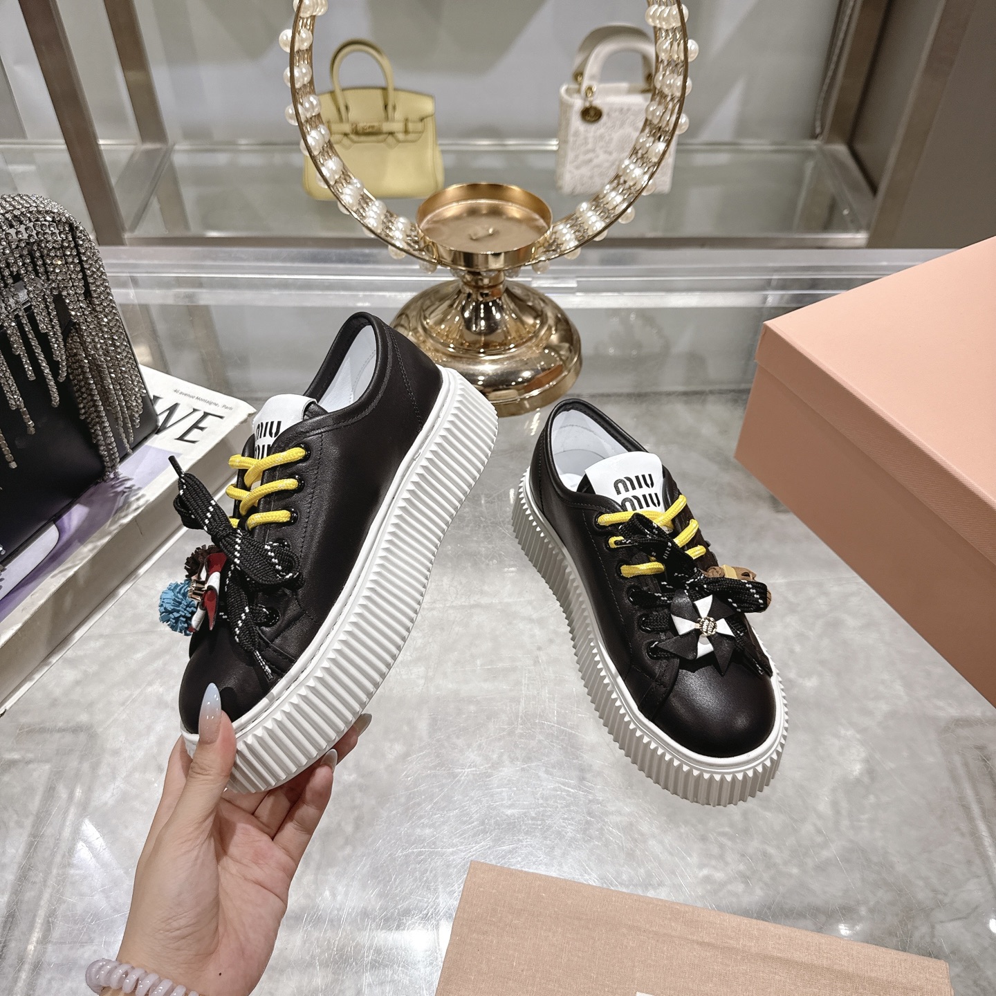 这款鞋子是AAAAA 1:1 质量 (非常棒). 使用了和原版一模一样的材料. 商标部分也保持了和缪缪/Miu Miu一样. 图片拍摄是实物鞋子拍摄, 您所收到的实物保证和我们图片一模一样.
