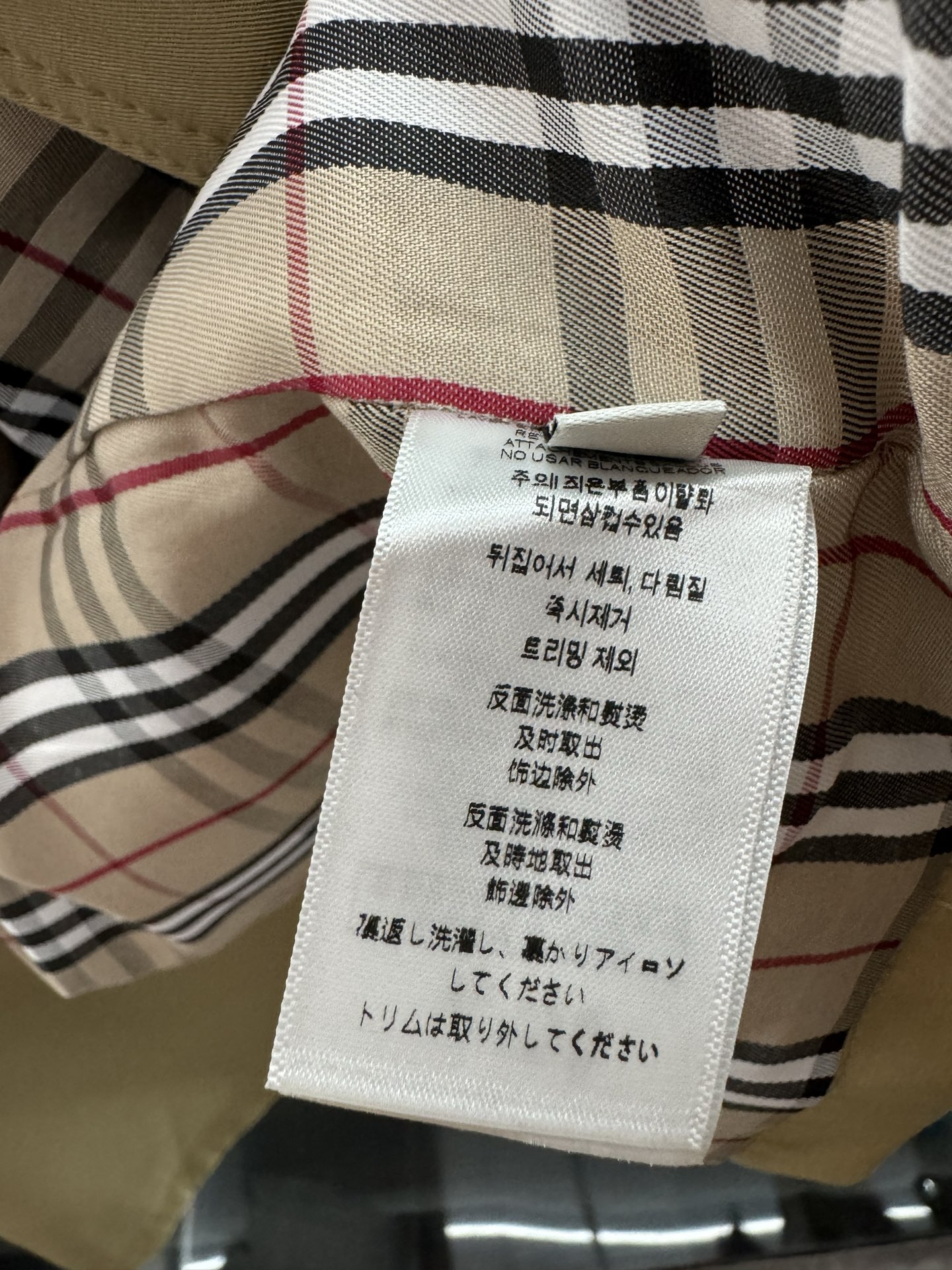 这款衣服是AAAAA 1:1 质量 (非常棒). 使用了和原版一模一样的材料. 商标部分也保持了和巴宝莉/Burberry一样. 图片拍摄是实物衣服拍摄, 您所收到的实物保证和我们图片一模一样.