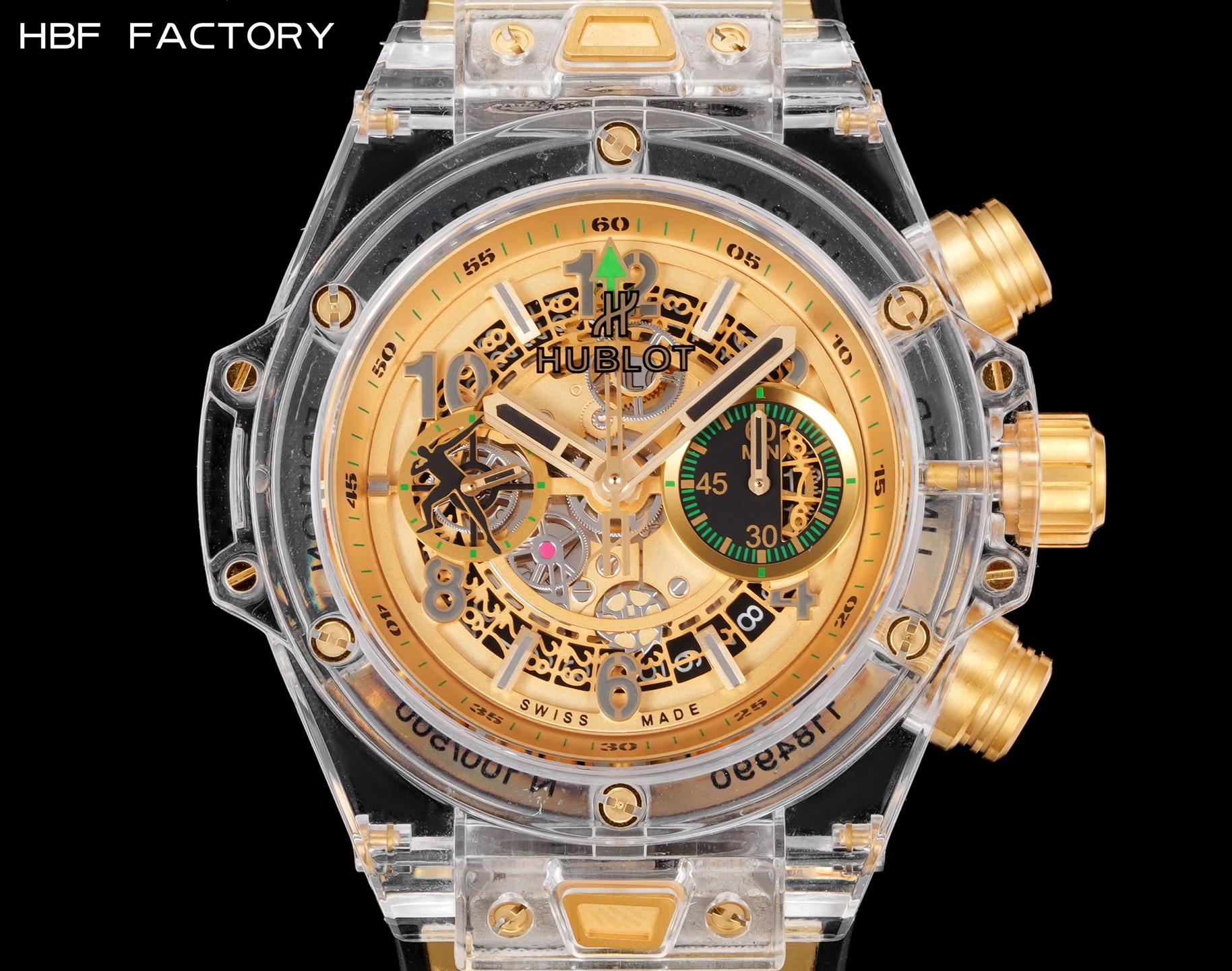 这款手表是AAAAA 1:1 质量 (非常棒). 使用了和原版一模一样的材料. 商标部分也保持了和Hublot一样. 图片拍摄是实物手表拍摄, 您所收到的实物保证和我们图片一模一样.