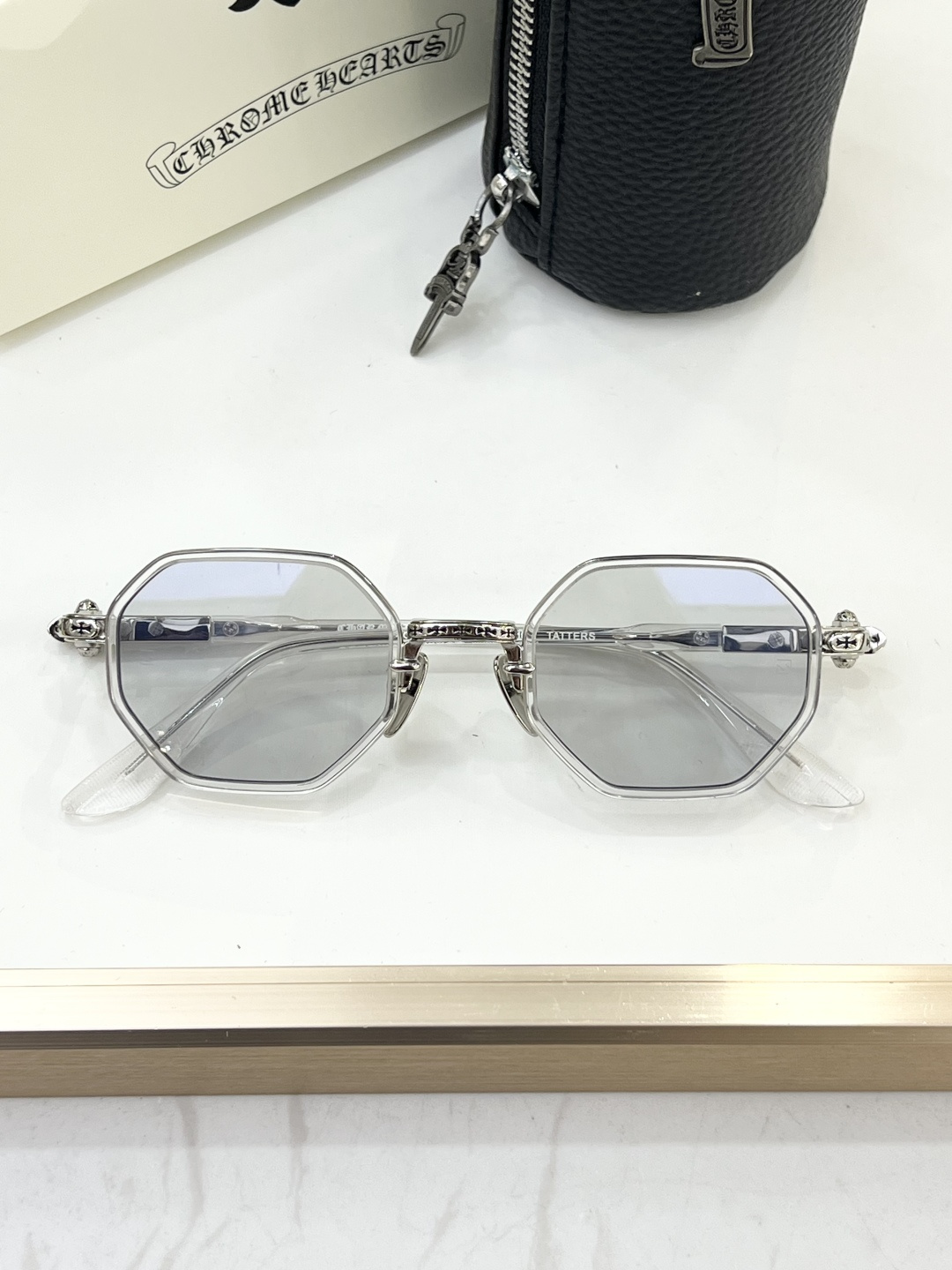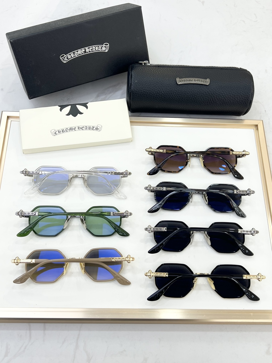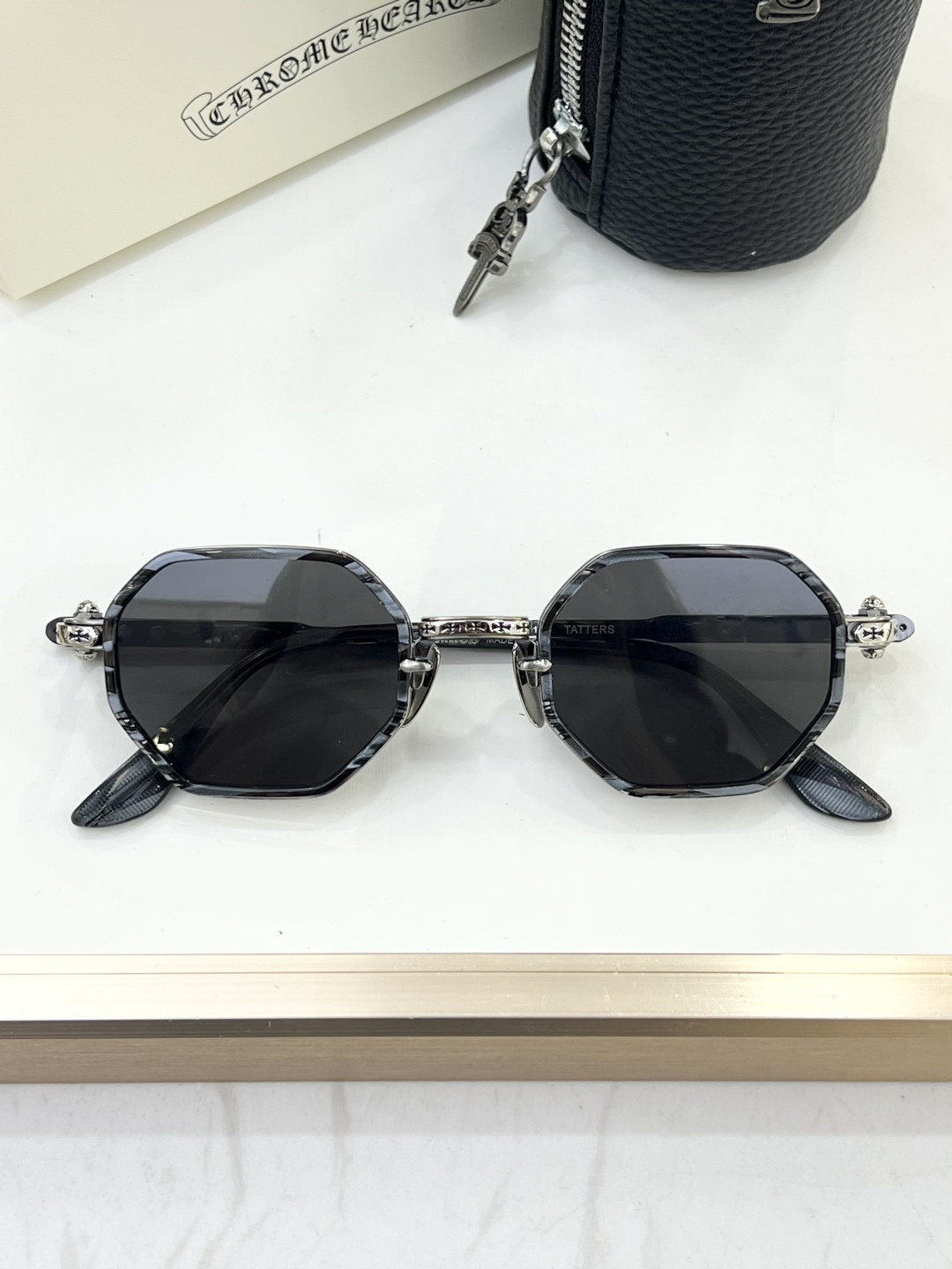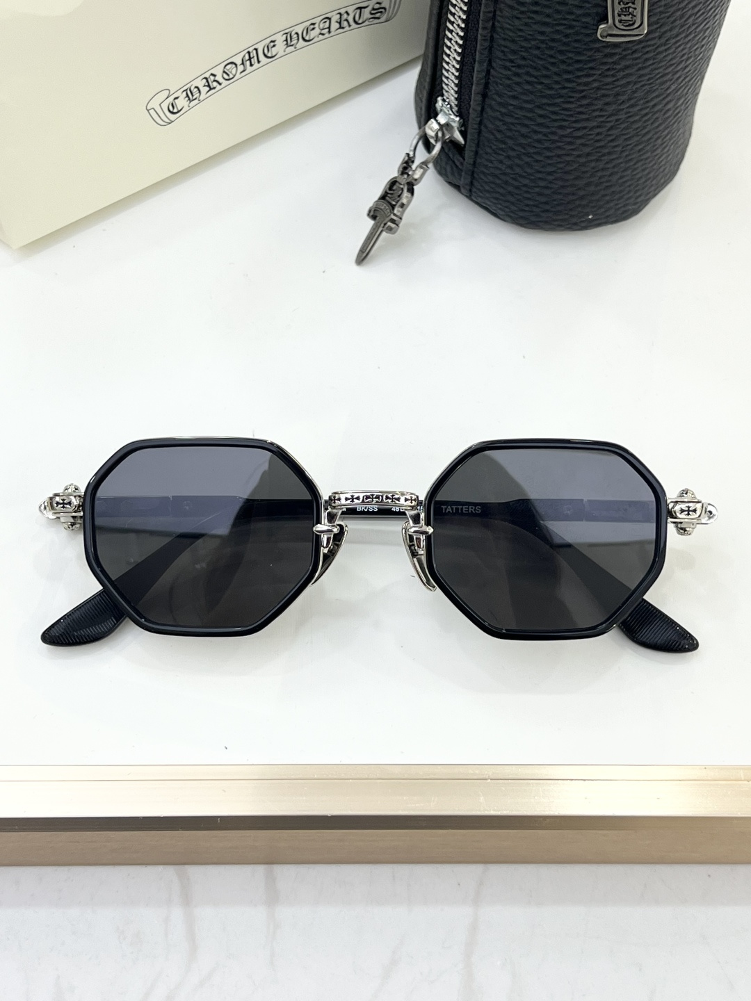 这款太阳眼镜是AAAAA 1:1 质量 (非常棒). 使用了和原版一模一样的材料. 商标部分也保持了和克罗心/Chrome Hearts一样. 图片拍摄是实物太阳眼镜拍摄, 您所收到的实物保证和我们图片一模一样.