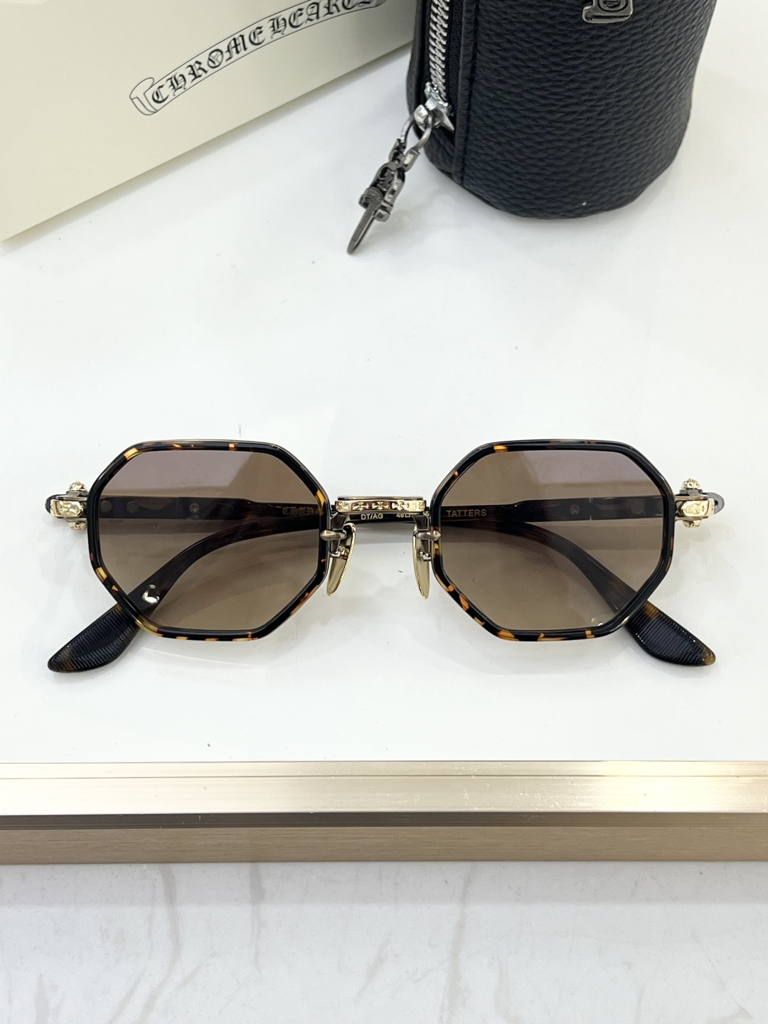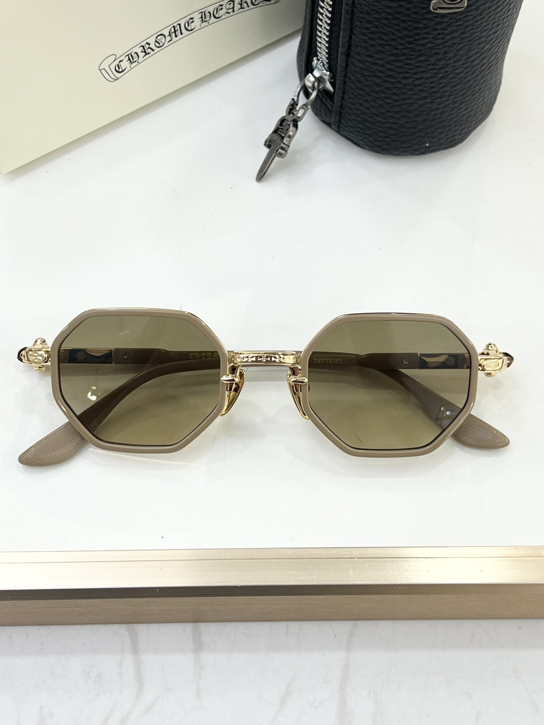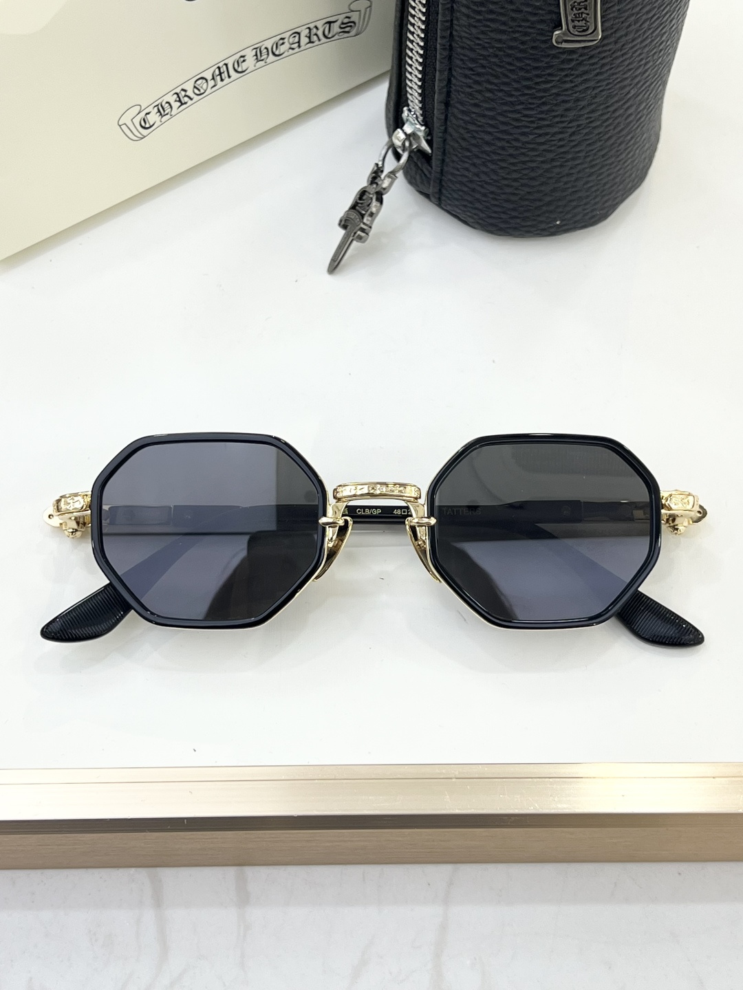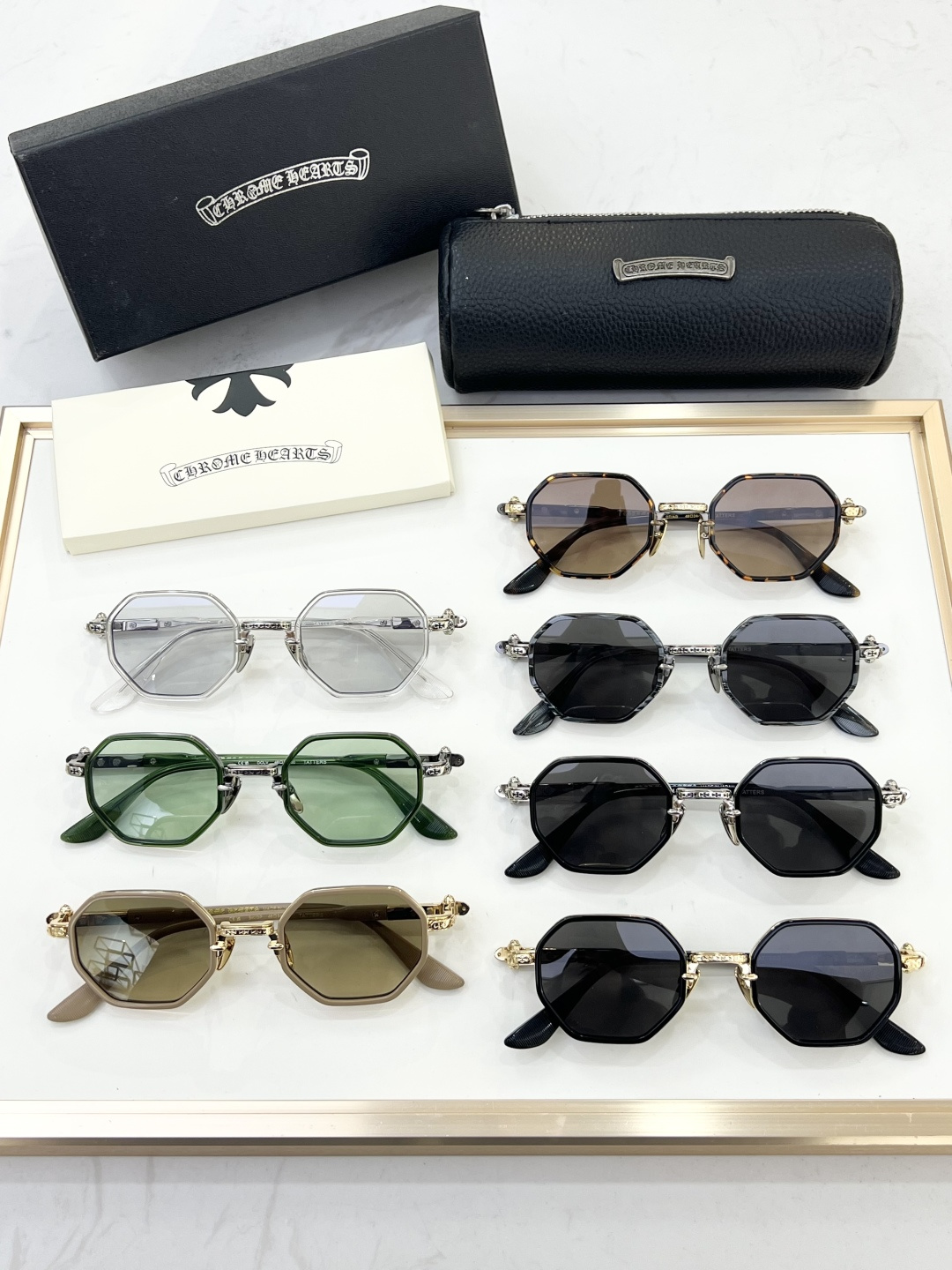 这款太阳眼镜是AAAAA 1:1 质量 (非常棒). 使用了和原版一模一样的材料. 商标部分也保持了和克罗心/Chrome Hearts一样. 图片拍摄是实物太阳眼镜拍摄, 您所收到的实物保证和我们图片一模一样.