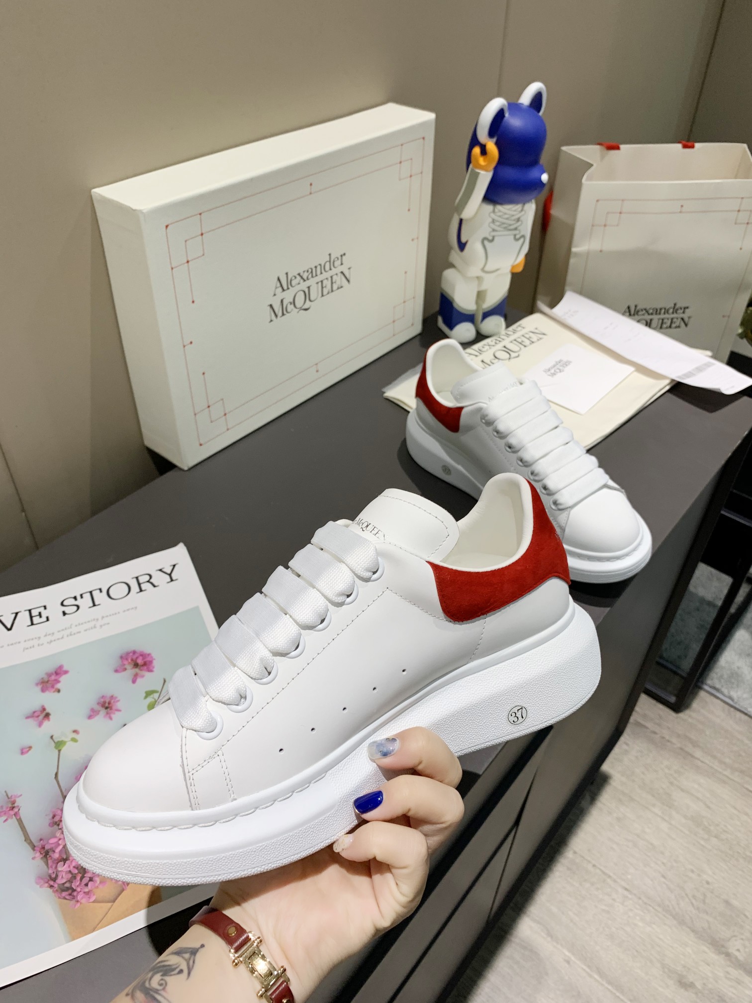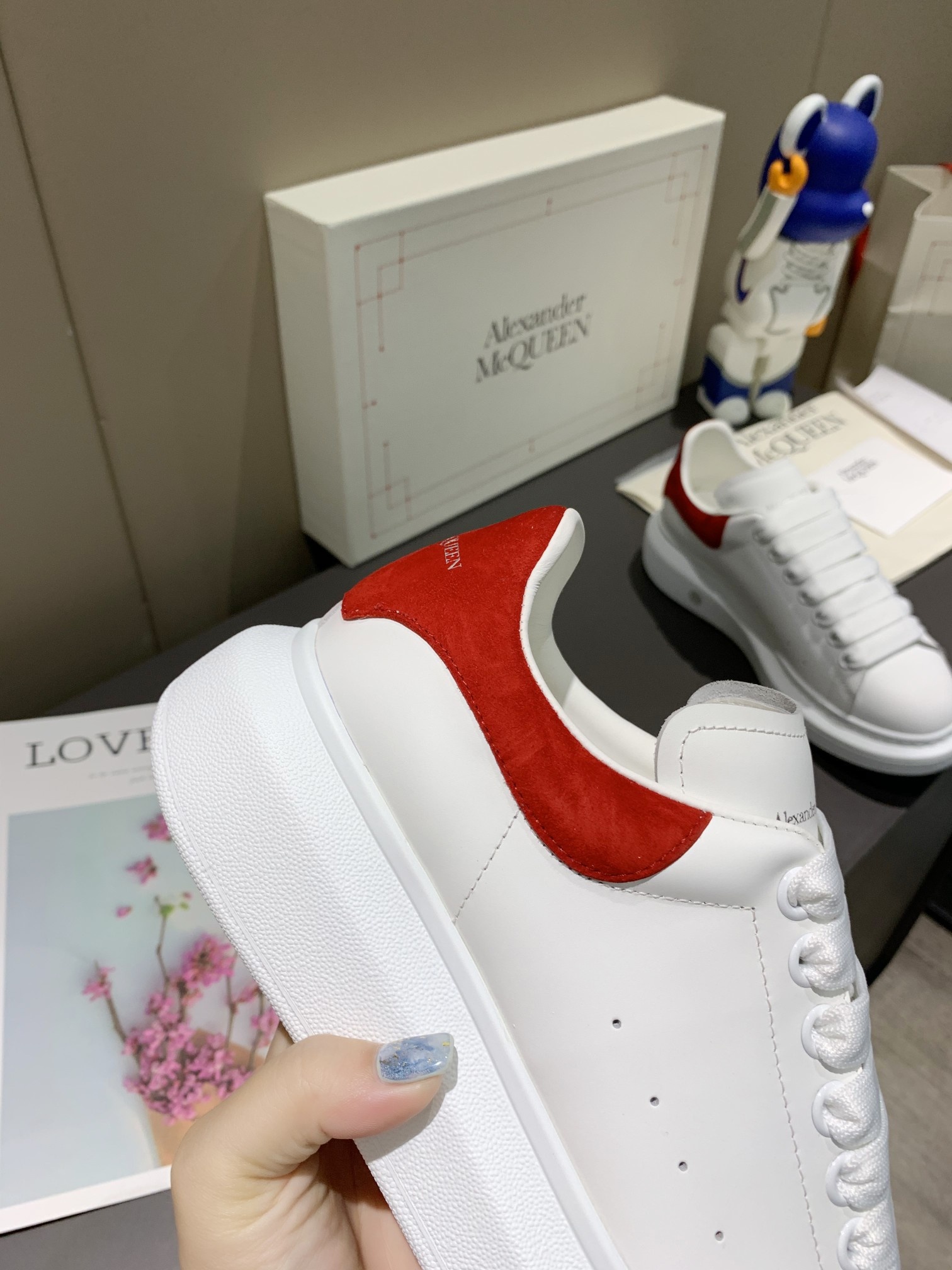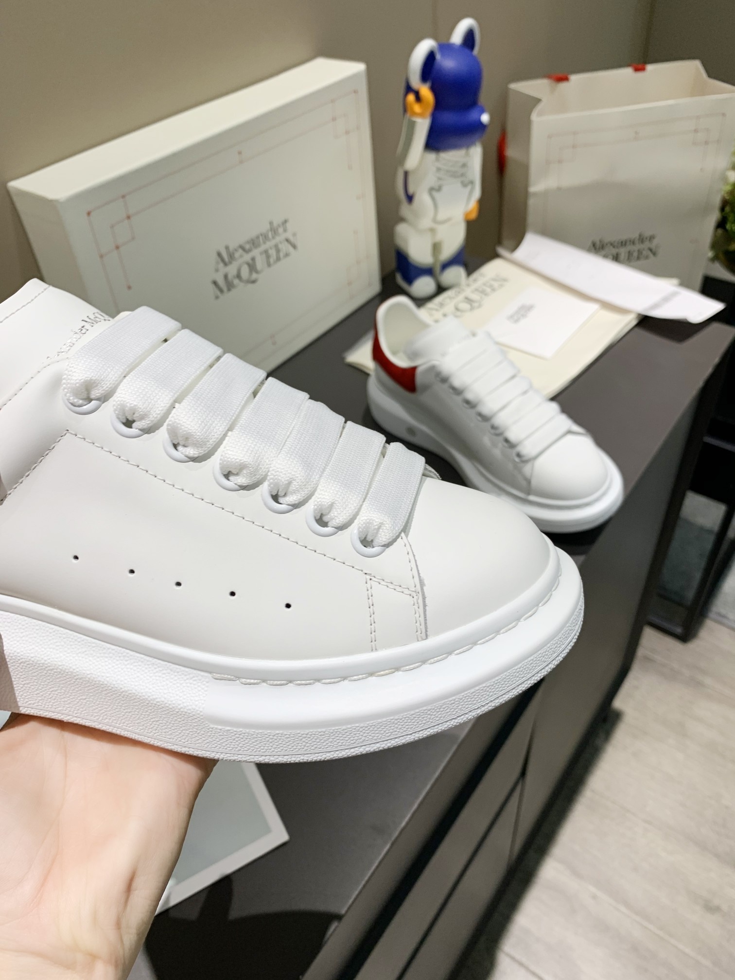 这款鞋子是AAAAA 1:1 质量 (非常棒). 使用了和原版一模一样的材料. 商标部分也保持了和亚历山大·麦昆/McQueen一样. 图片拍摄是实物鞋子拍摄, 您所收到的实物保证和我们图片一模一样.