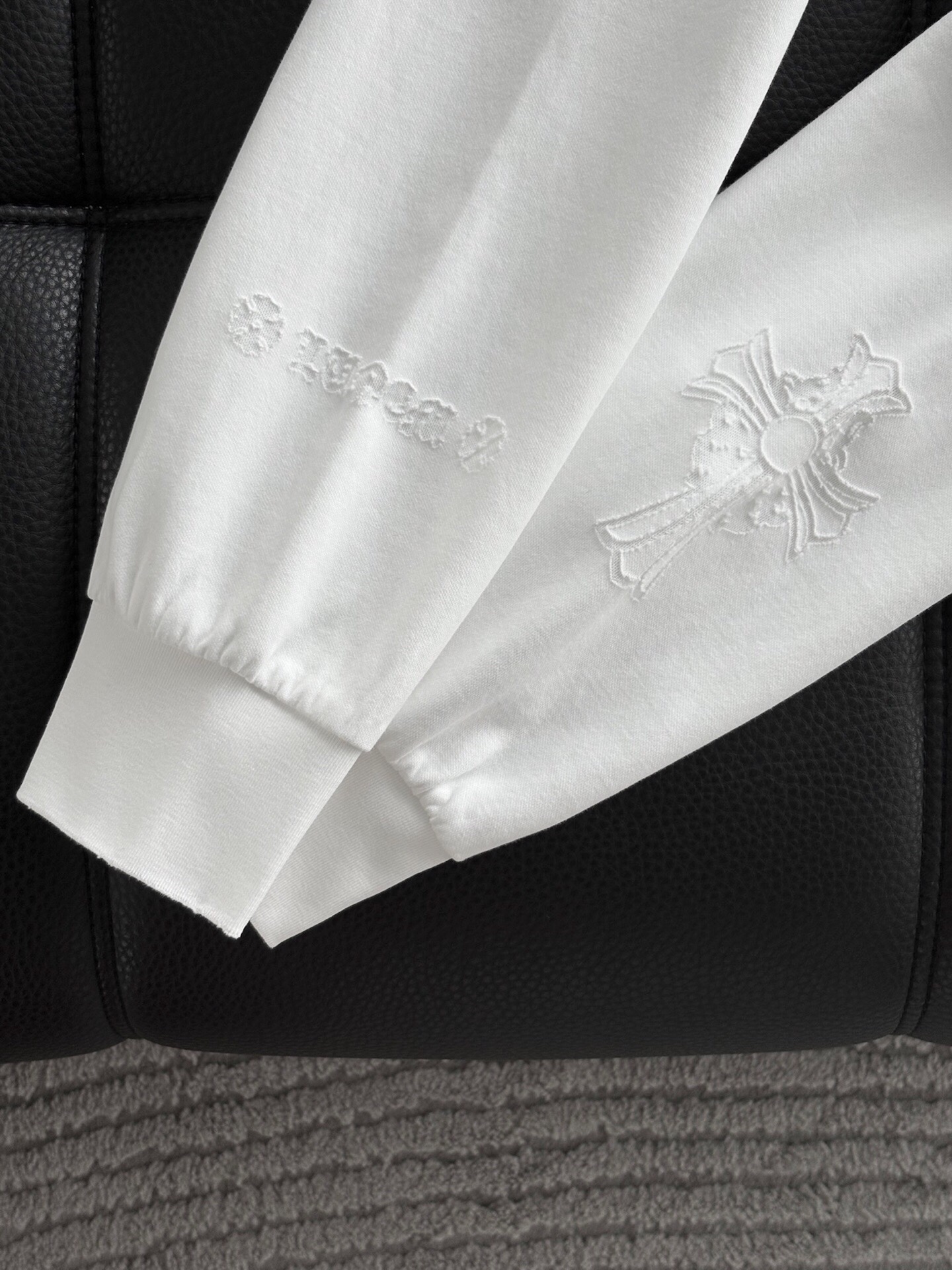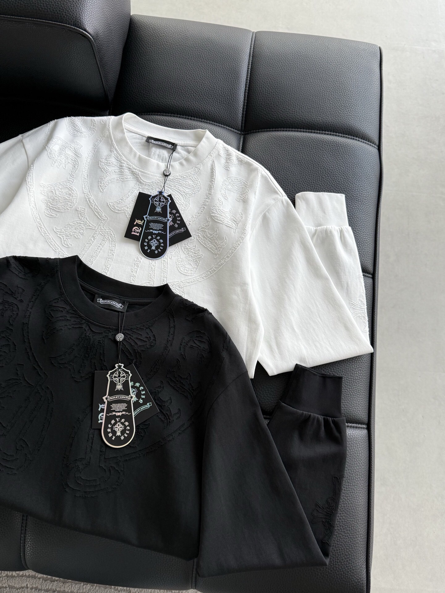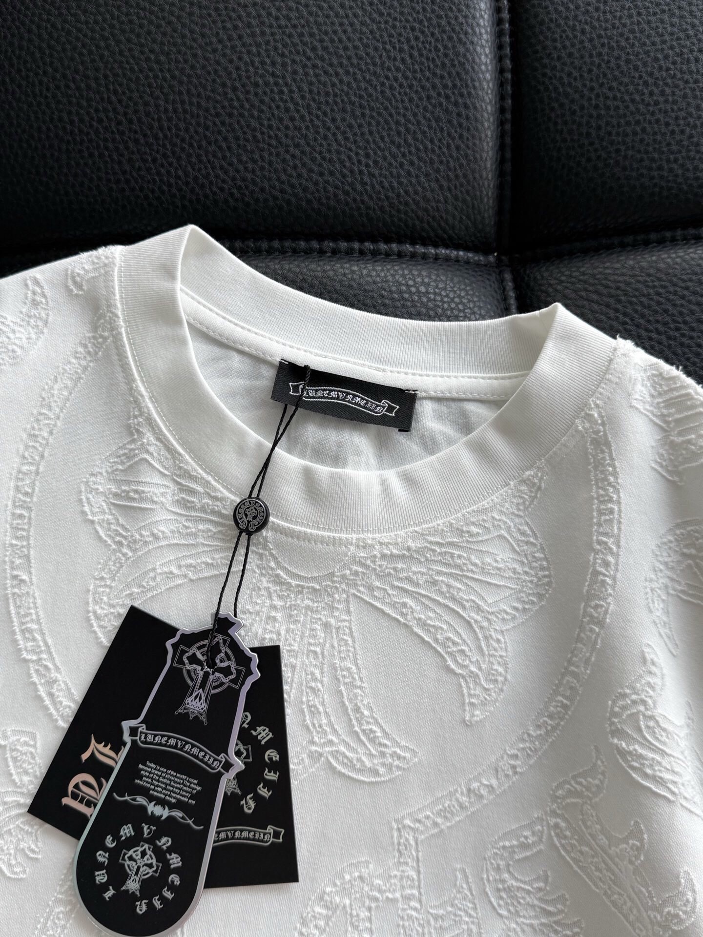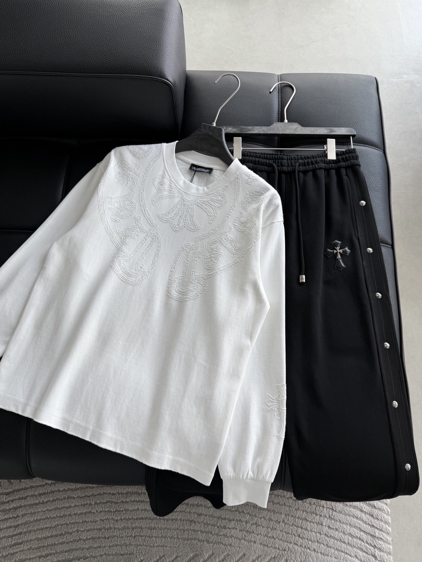 这款衣服是AAAAA 1:1 质量 (非常棒). 使用了和原版一模一样的材料. 商标部分也保持了和克罗心/Chrome Hearts一样. 图片拍摄是实物衣服拍摄, 您所收到的实物保证和我们图片一模一样.