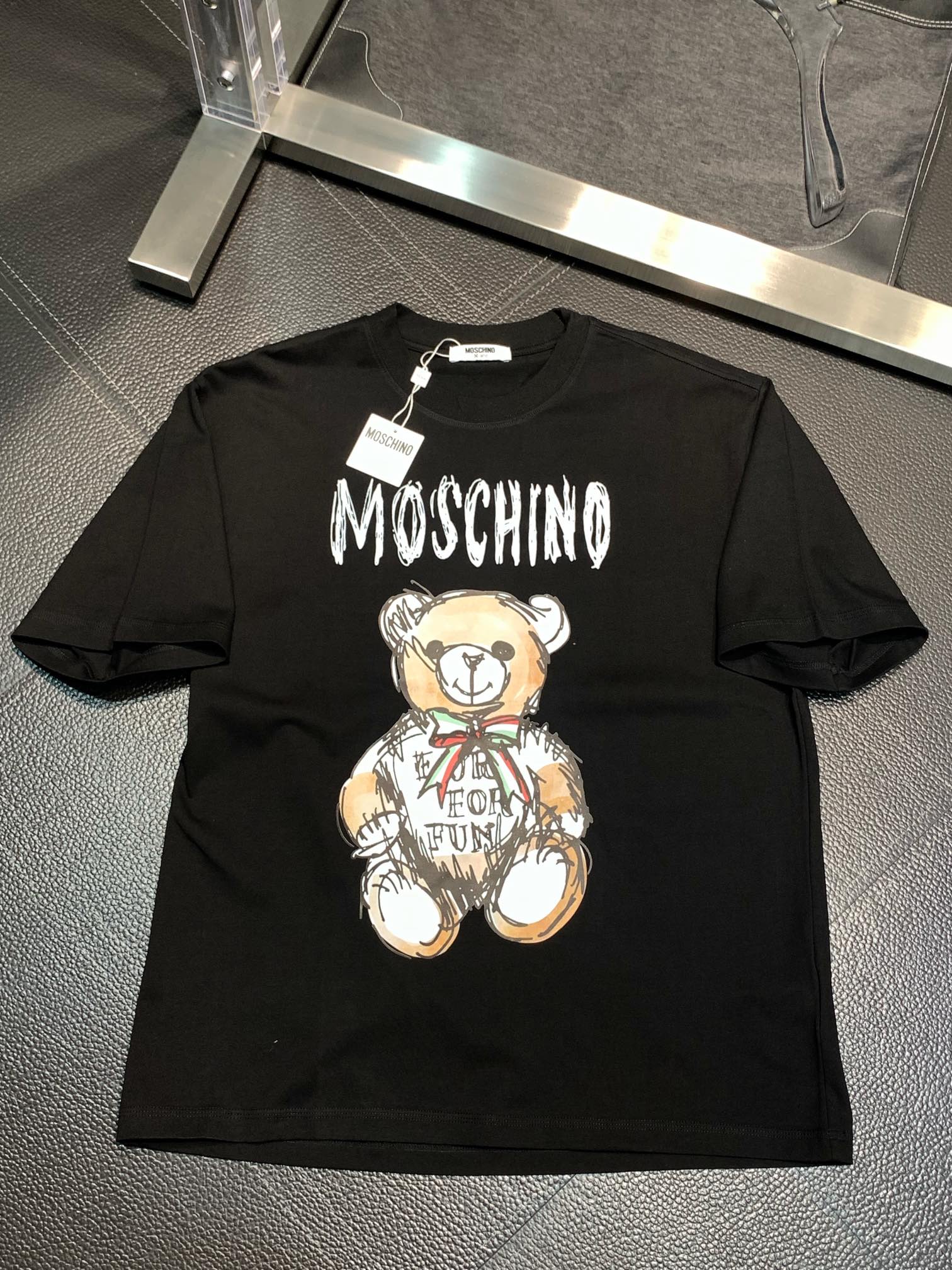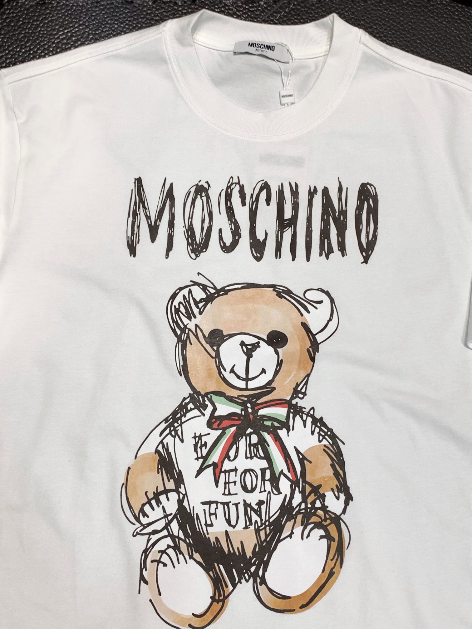 这款衣服是AAAAA 1:1 质量 (非常棒). 使用了和原版一模一样的材料. 商标部分也保持了和莫斯基诺/Moschino一样. 图片拍摄是实物衣服拍摄, 您所收到的实物保证和我们图片一模一样.