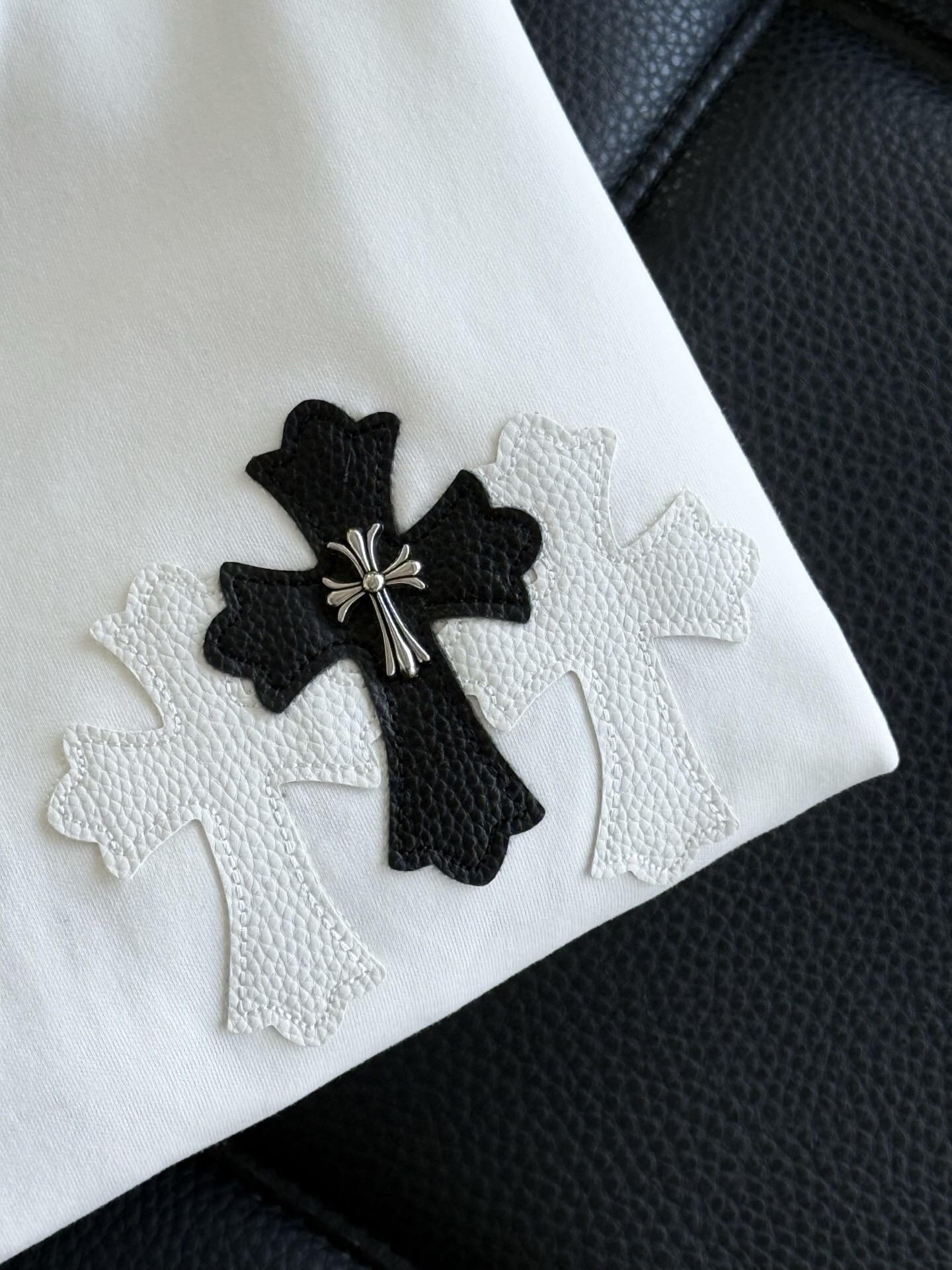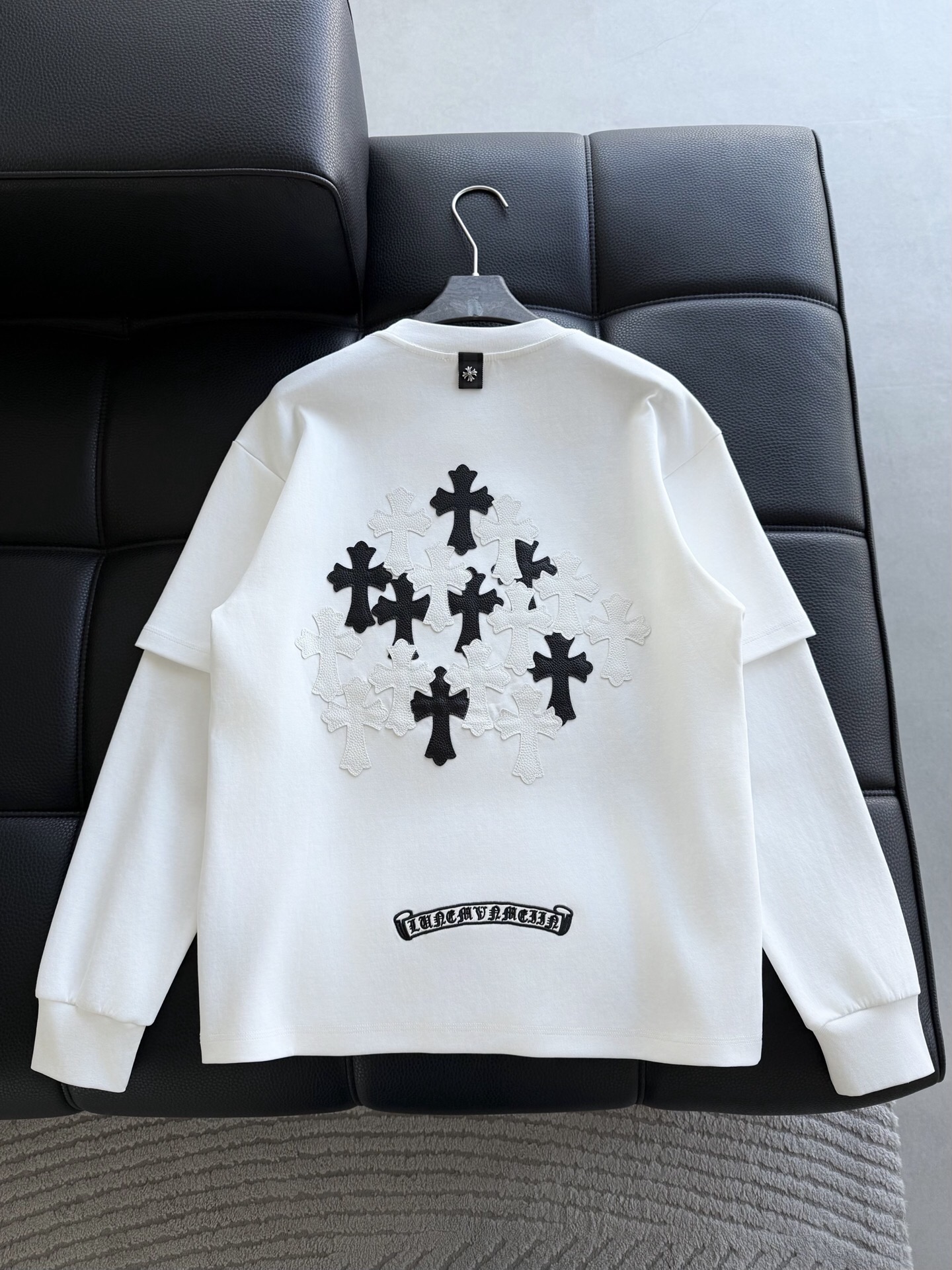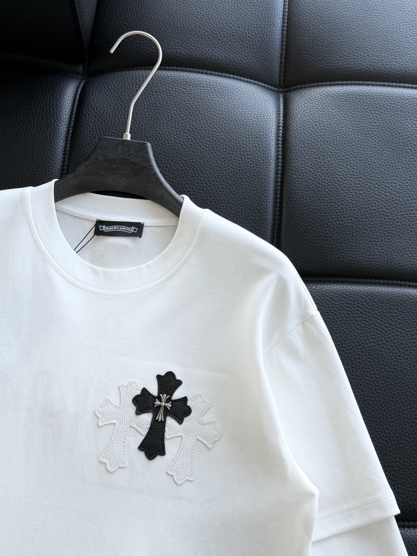这款衣服是AAAAA 1:1 质量 (非常棒). 使用了和原版一模一样的材料. 商标部分也保持了和克罗心/Chrome Hearts一样. 图片拍摄是实物衣服拍摄, 您所收到的实物保证和我们图片一模一样.
