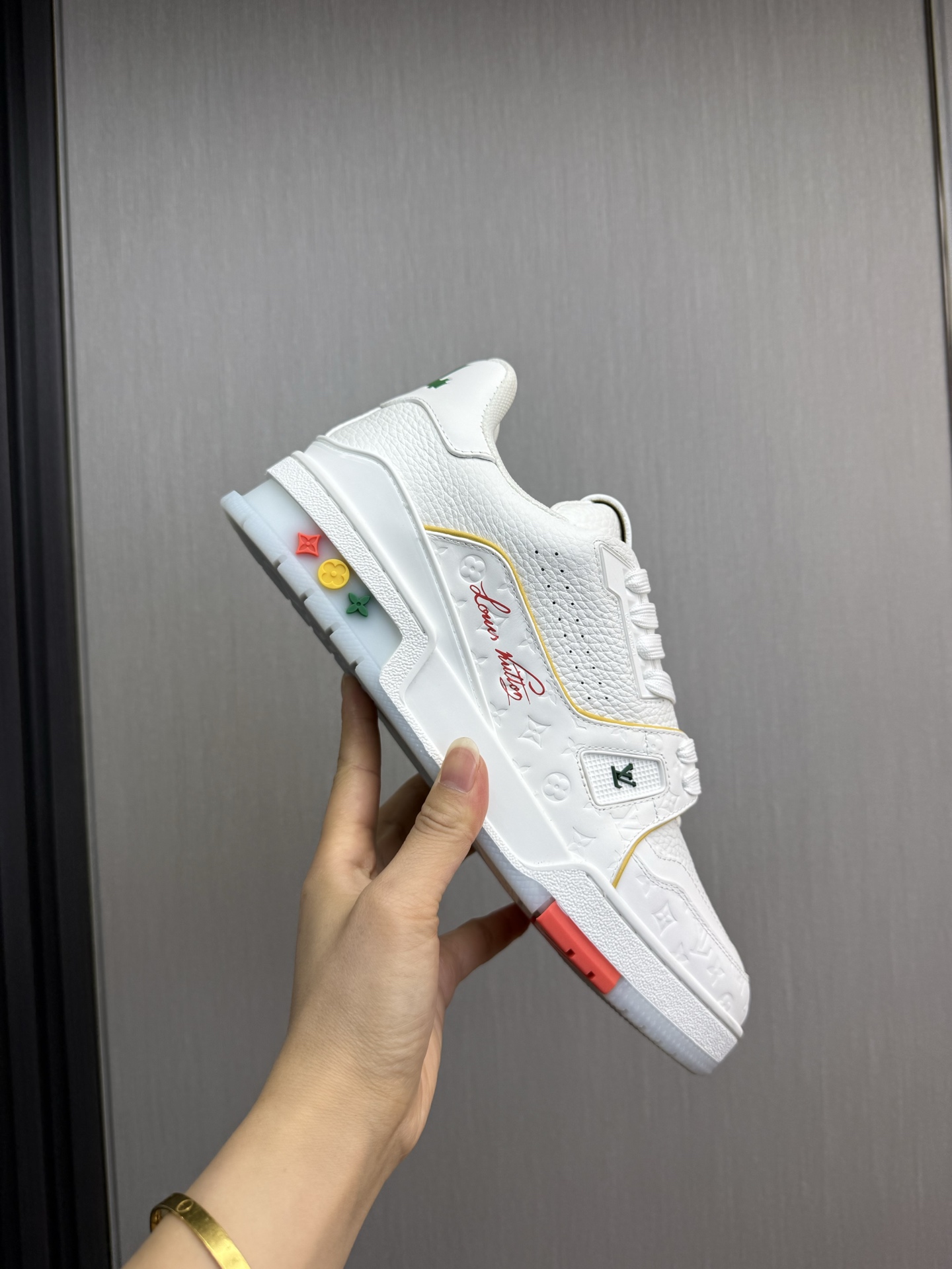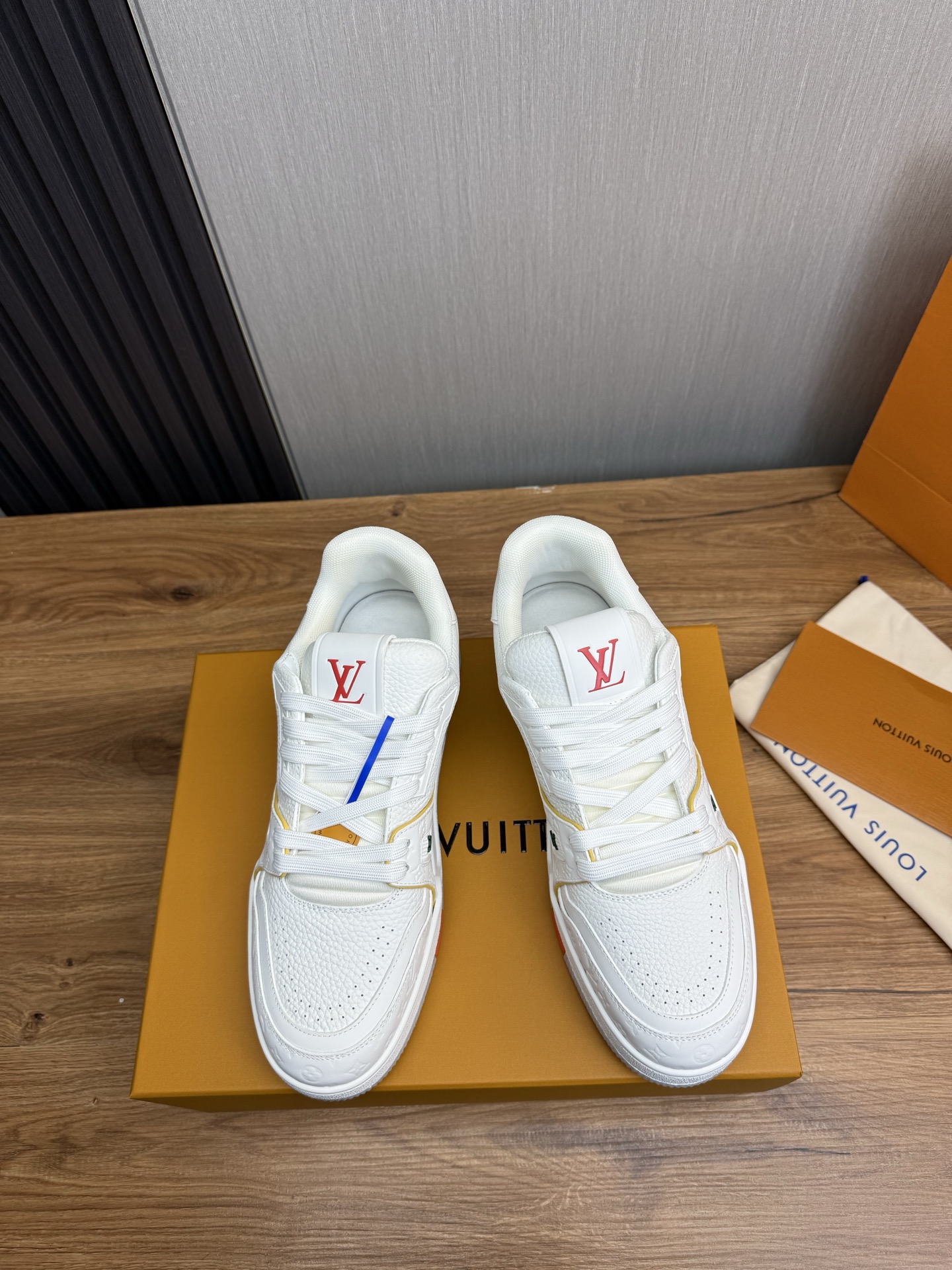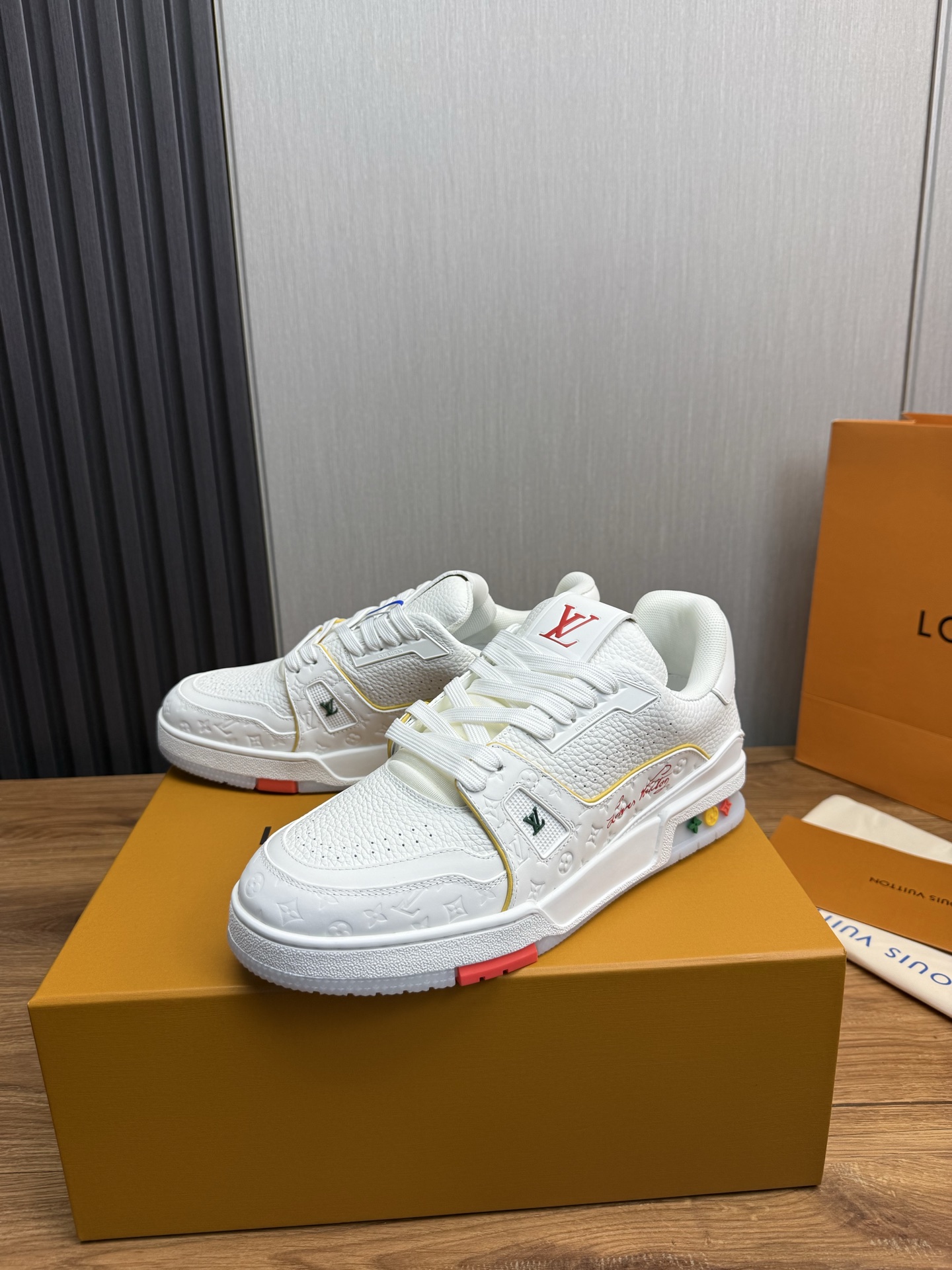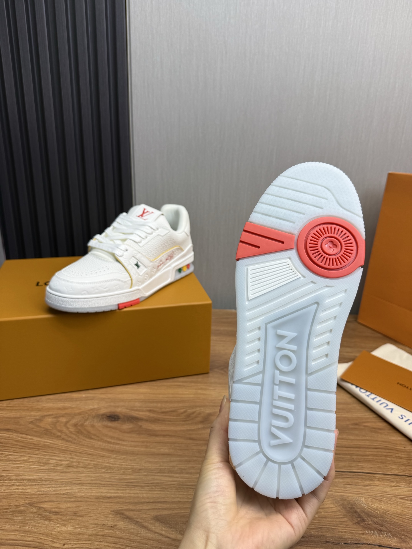 这款鞋子是AAAAA 1:1 质量 (非常棒). 使用了和原版一模一样的材料. 商标部分也保持了和路易威登/Louis Vuitton一样. 图片拍摄是实物鞋子拍摄, 您所收到的实物保证和我们图片一模一样.