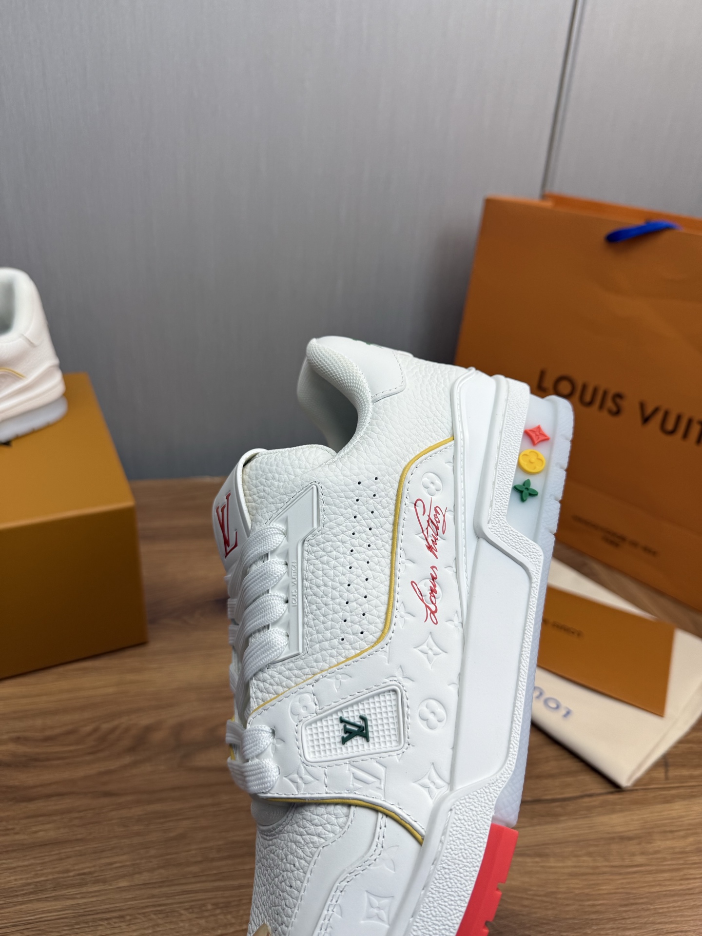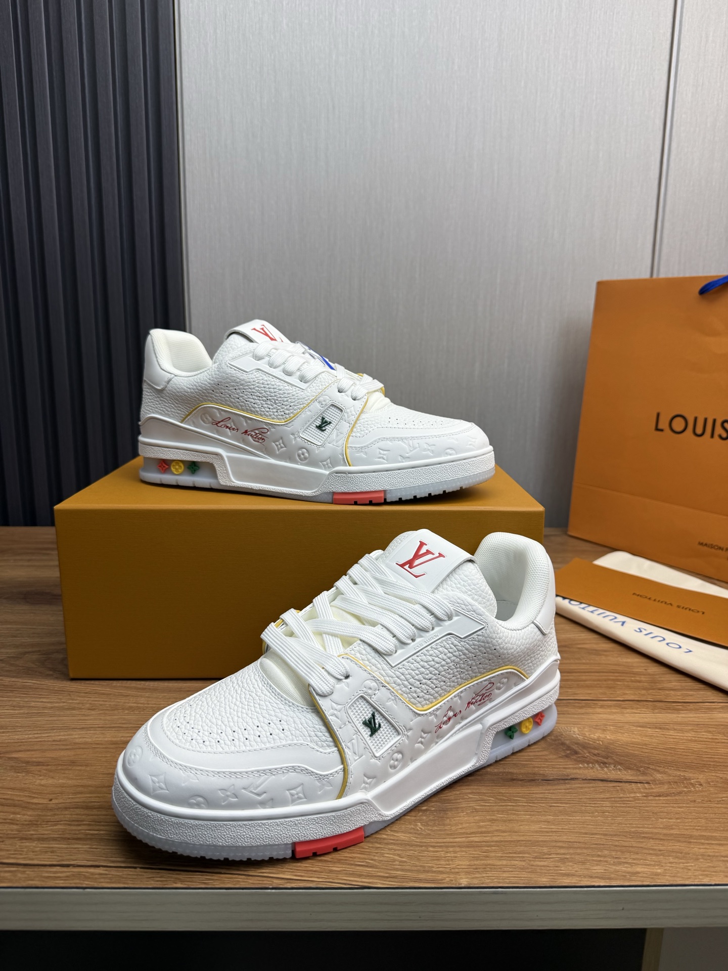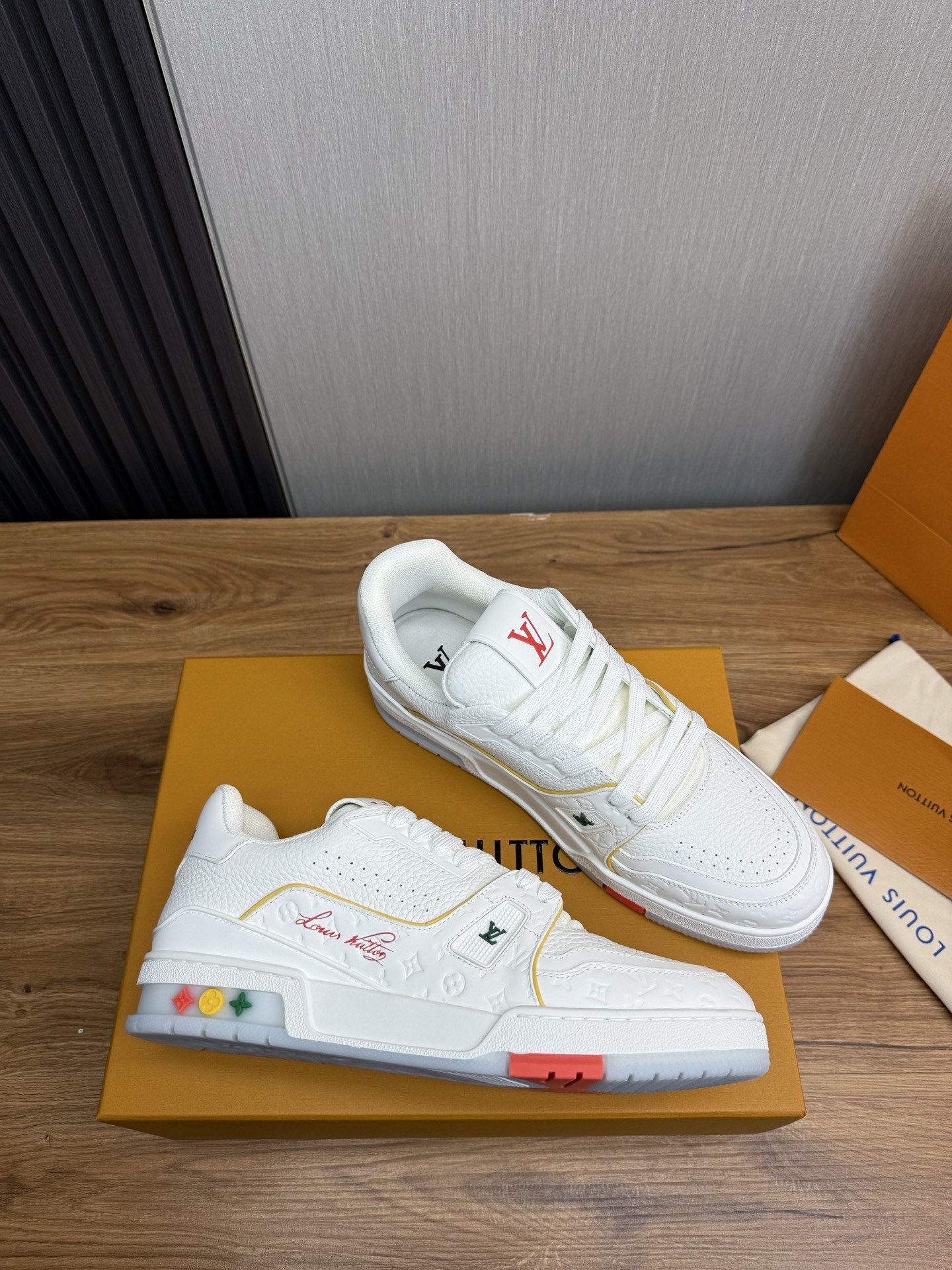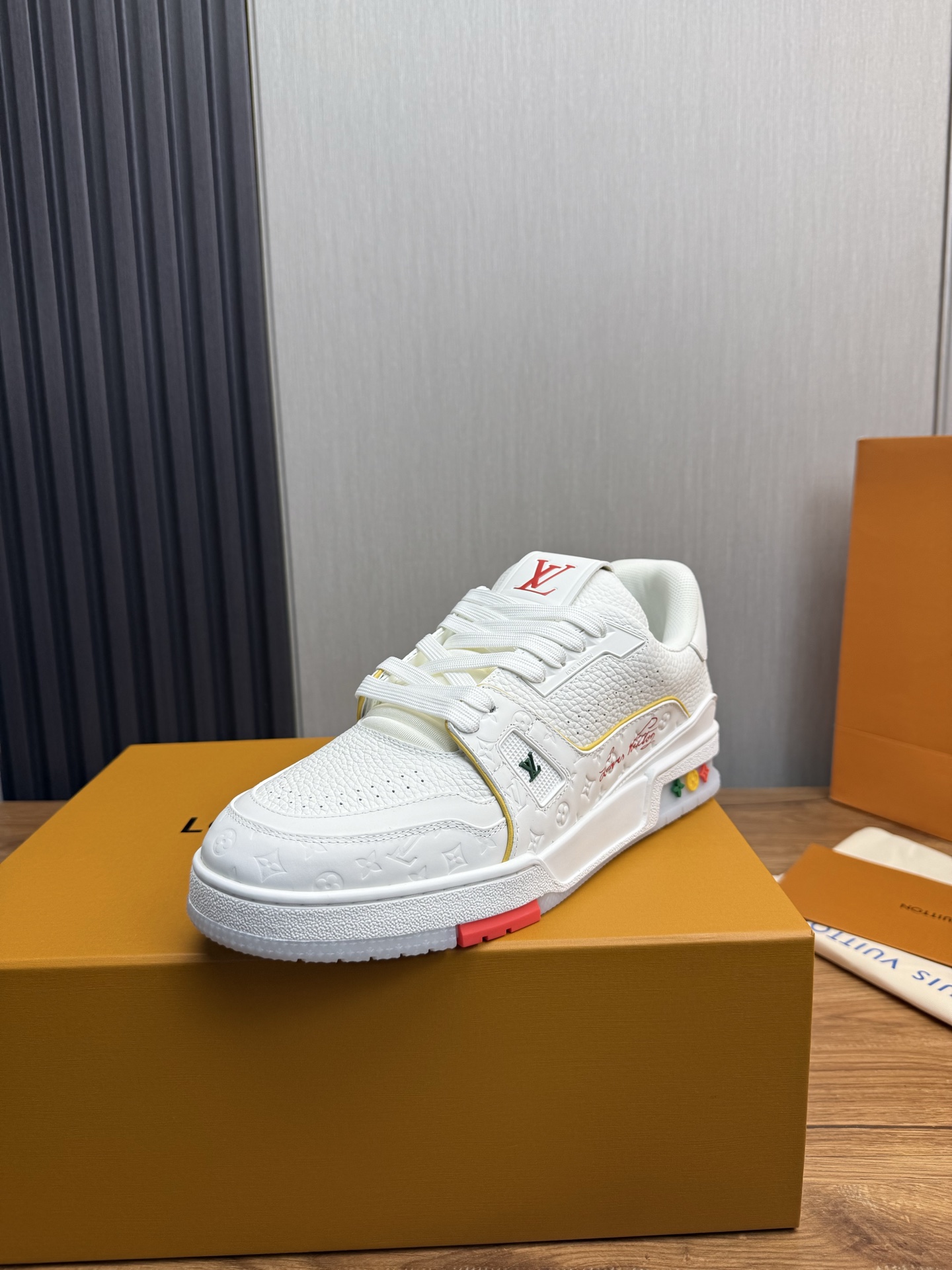 这款鞋子是AAAAA 1:1 质量 (非常棒). 使用了和原版一模一样的材料. 商标部分也保持了和路易威登/Louis Vuitton一样. 图片拍摄是实物鞋子拍摄, 您所收到的实物保证和我们图片一模一样.