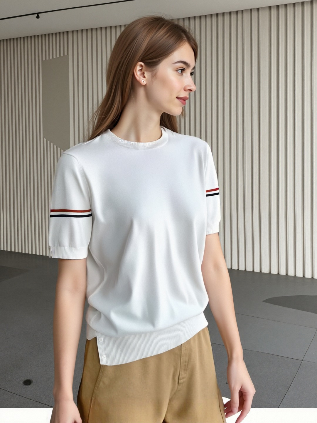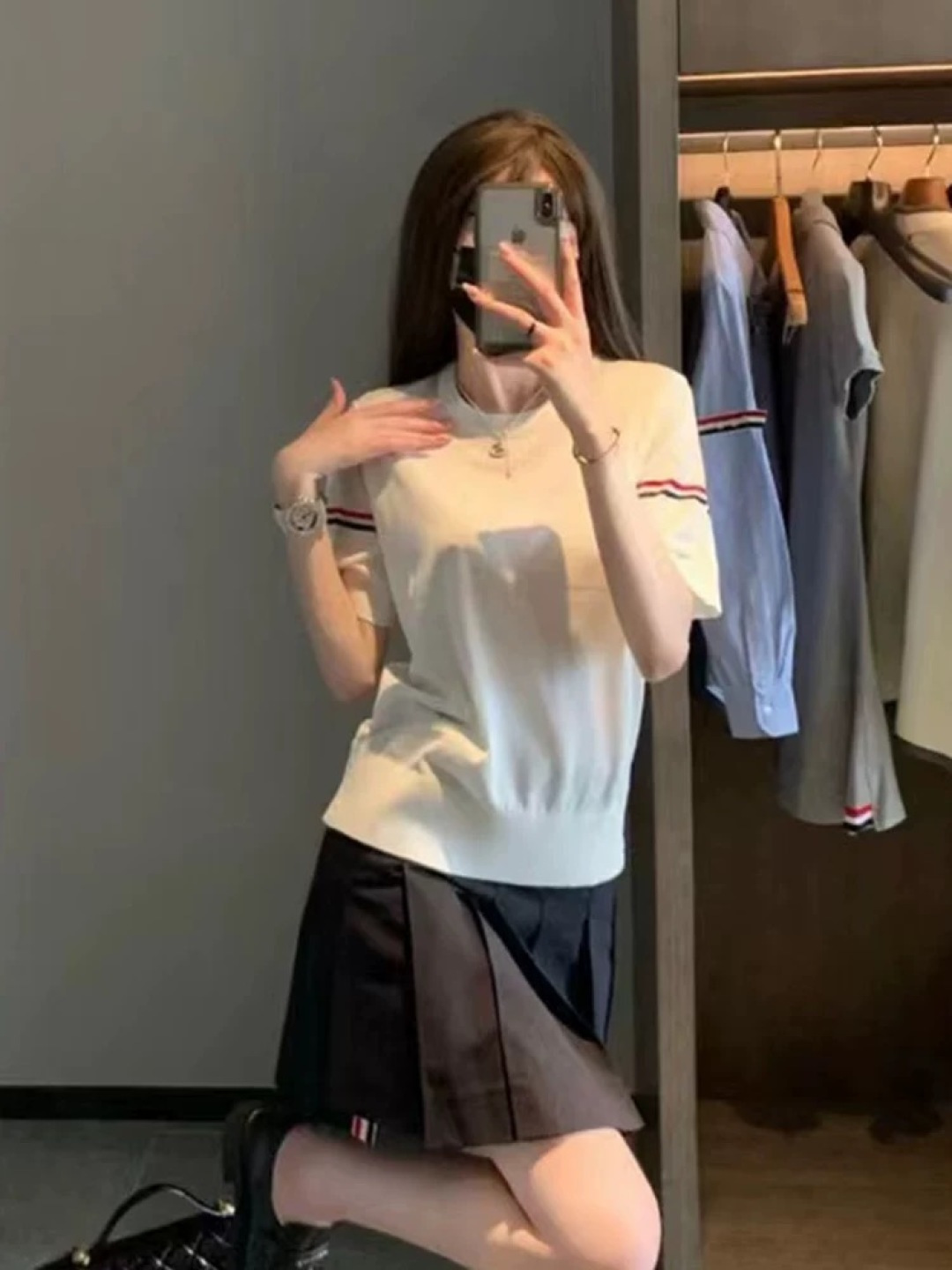 这款衣服是AAAAA 1:1 质量 (非常棒). 使用了和原版一模一样的材料. 商标部分也保持了和汤姆布朗/Thom Browne一样. 图片拍摄是实物衣服拍摄, 您所收到的实物保证和我们图片一模一样.