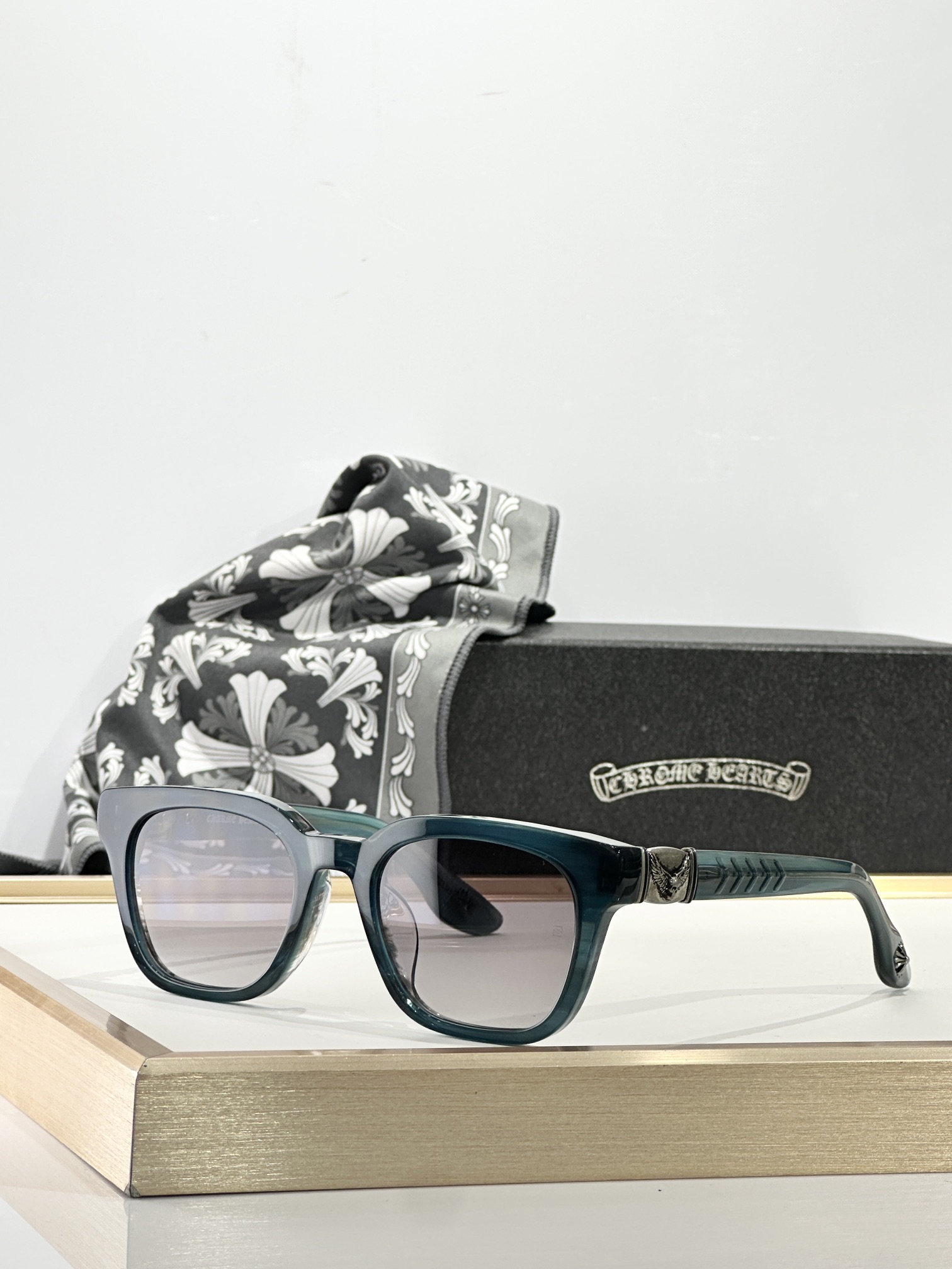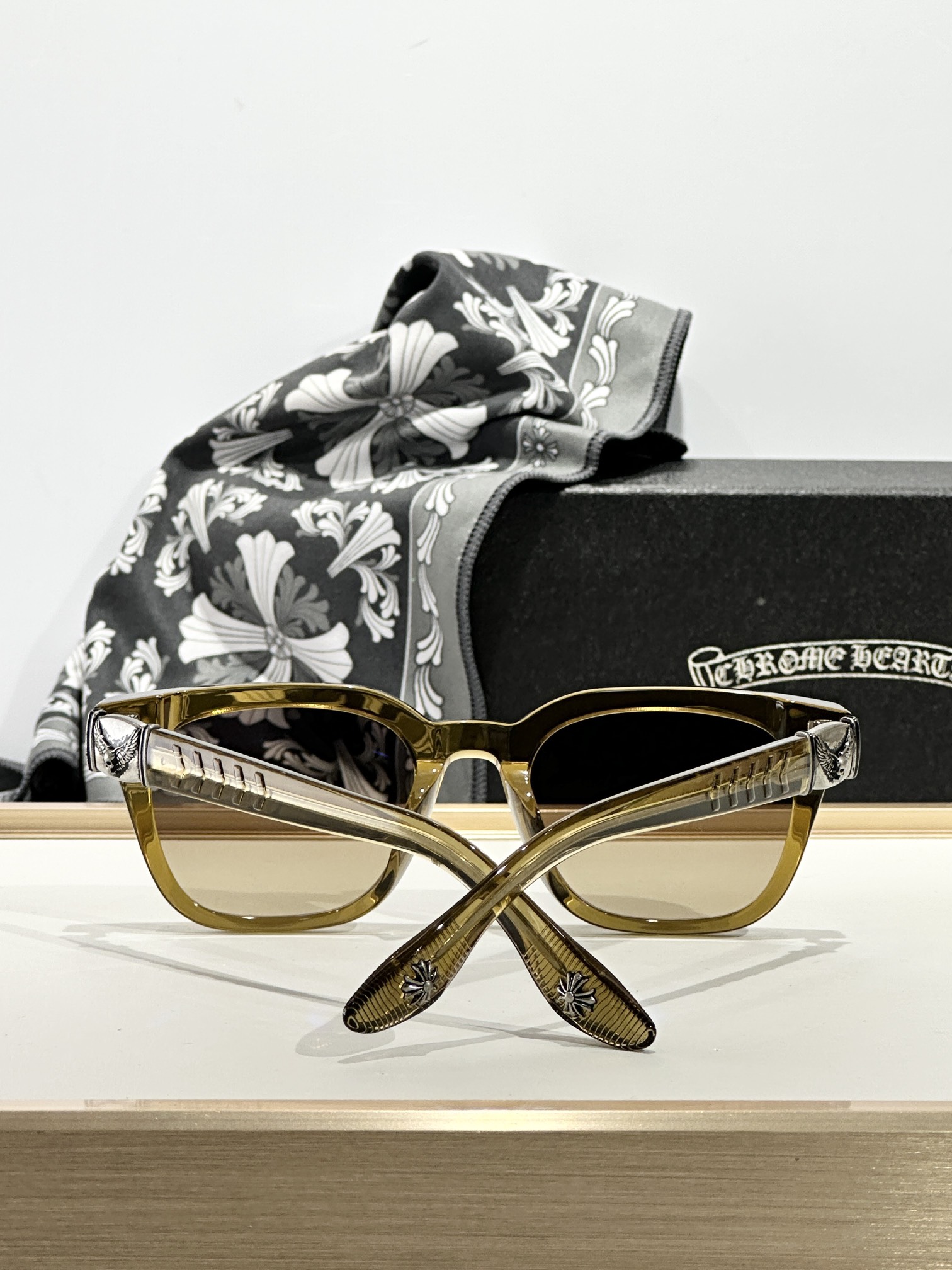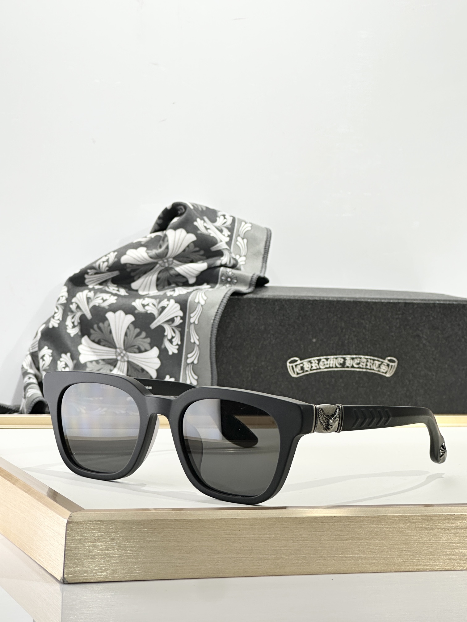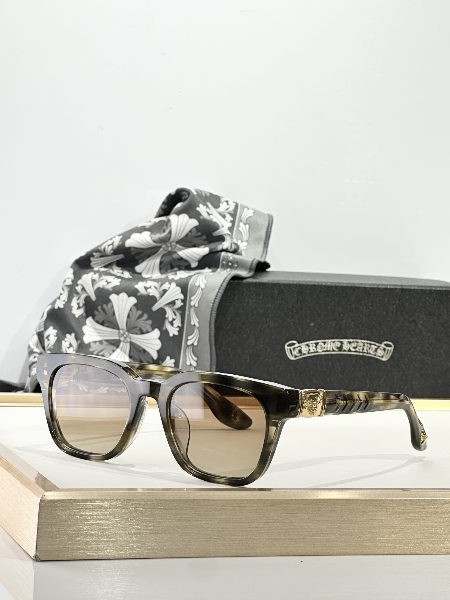 这款太阳眼镜是AAAAA 1:1 质量 (非常棒). 使用了和原版一模一样的材料. 商标部分也保持了和克罗心/Chrome Hearts一样. 图片拍摄是实物太阳眼镜拍摄, 您所收到的实物保证和我们图片一模一样.