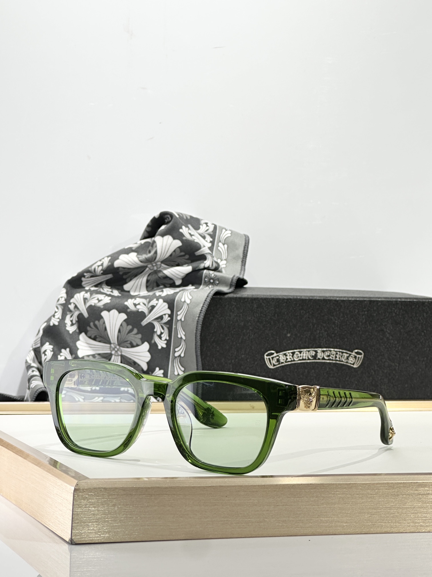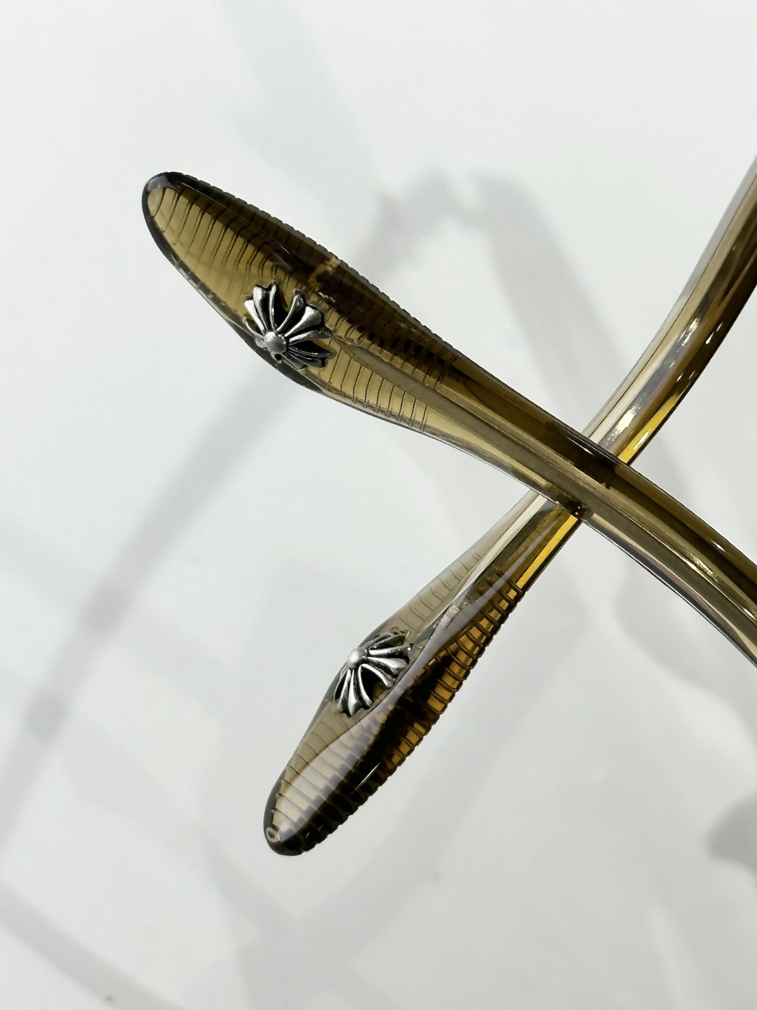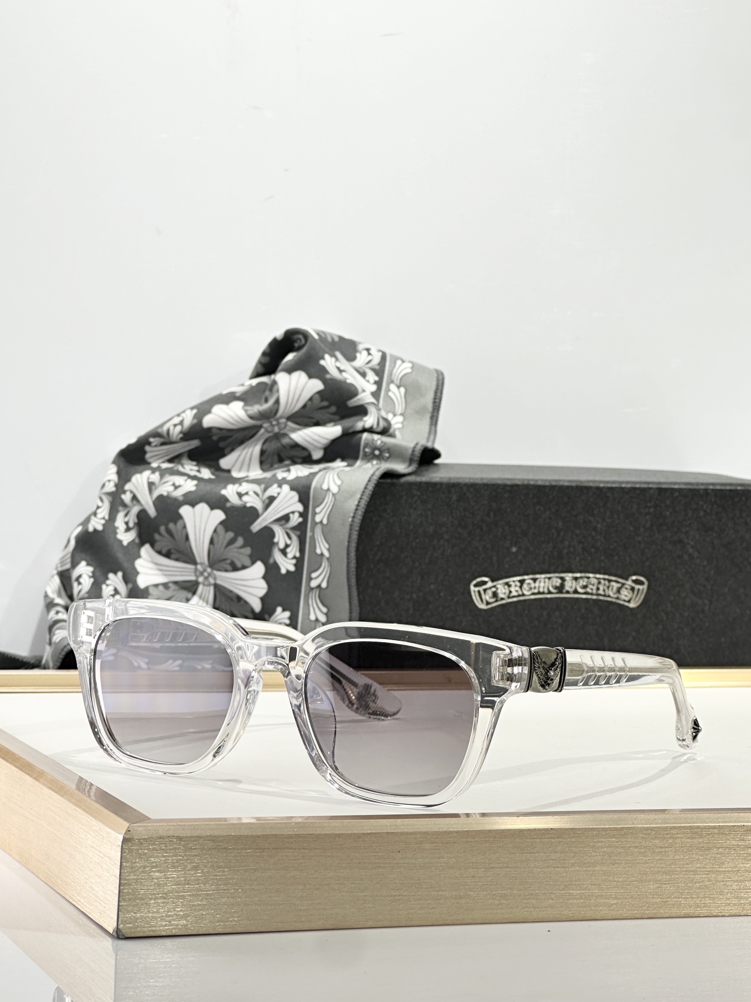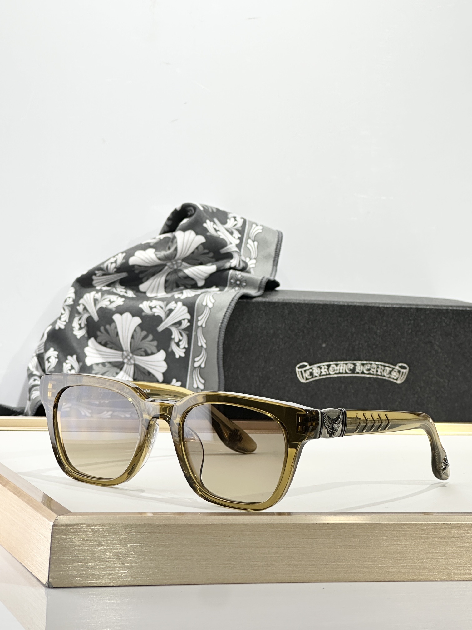 这款太阳眼镜是AAAAA 1:1 质量 (非常棒). 使用了和原版一模一样的材料. 商标部分也保持了和克罗心/Chrome Hearts一样. 图片拍摄是实物太阳眼镜拍摄, 您所收到的实物保证和我们图片一模一样.