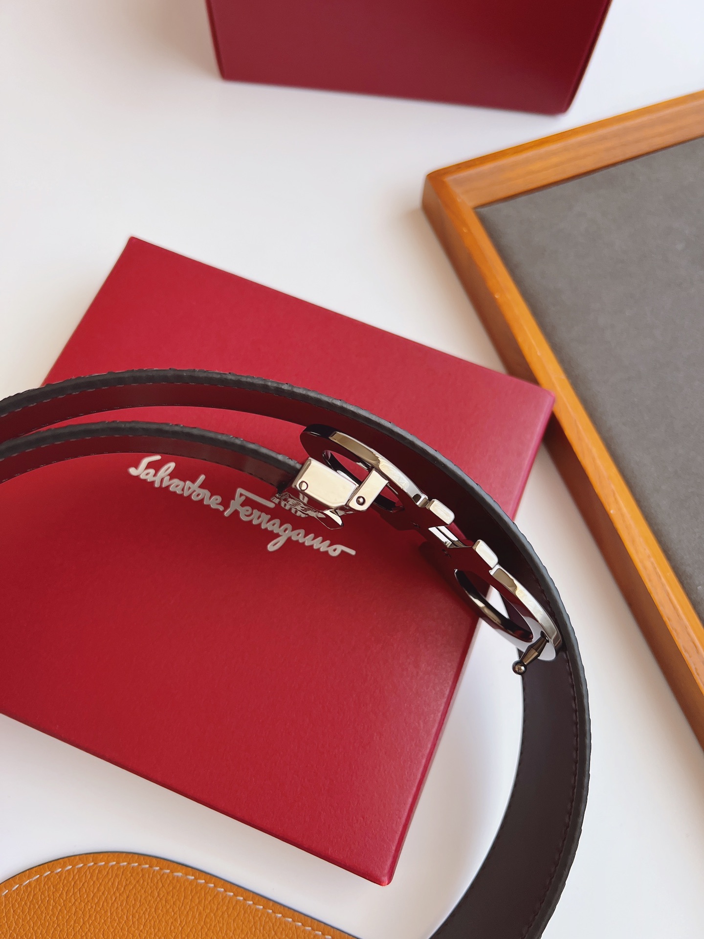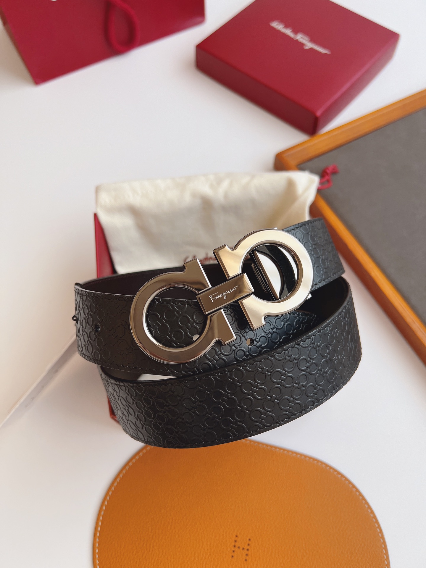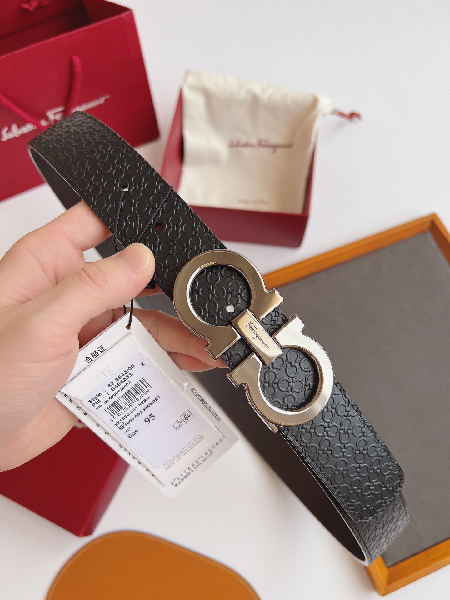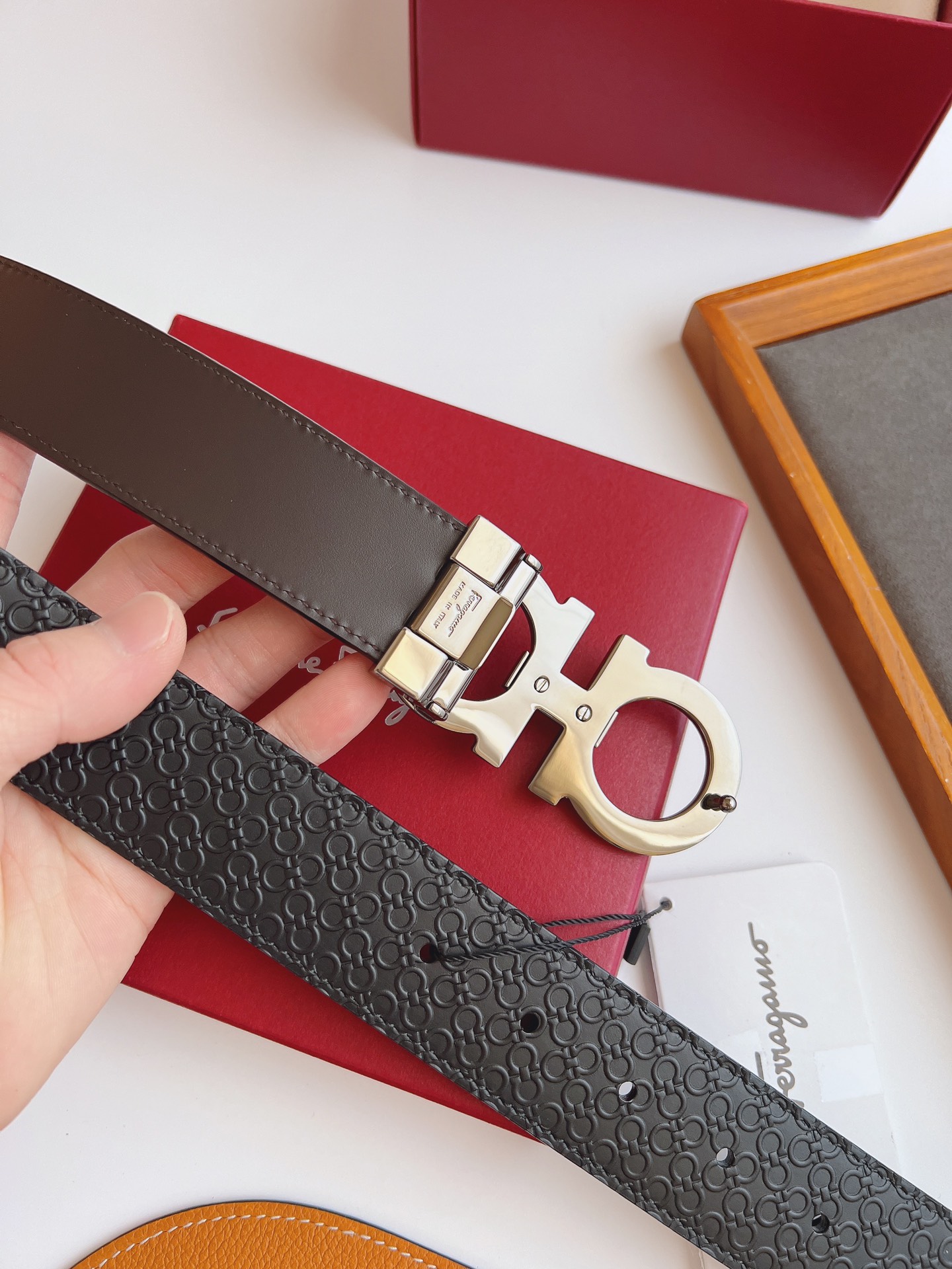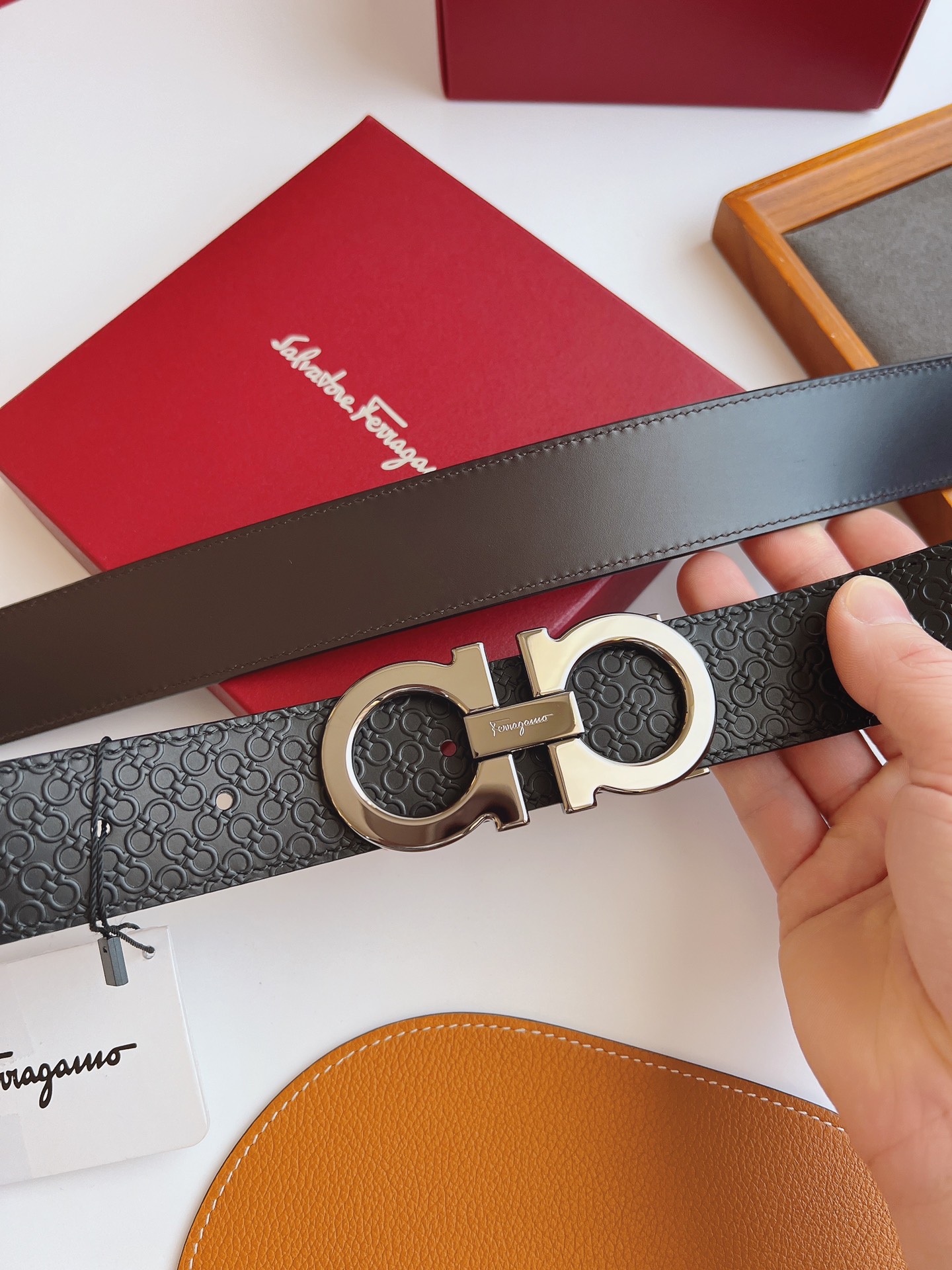 这款皮带是AAAAA 1:1 质量 (非常棒). 使用了和原版一模一样的材料. 商标部分也保持了和菲拉格慕/Salvatore Ferragamo一样. 图片拍摄是实物皮带拍摄, 您所收到的实物保证和我们图片一模一样.