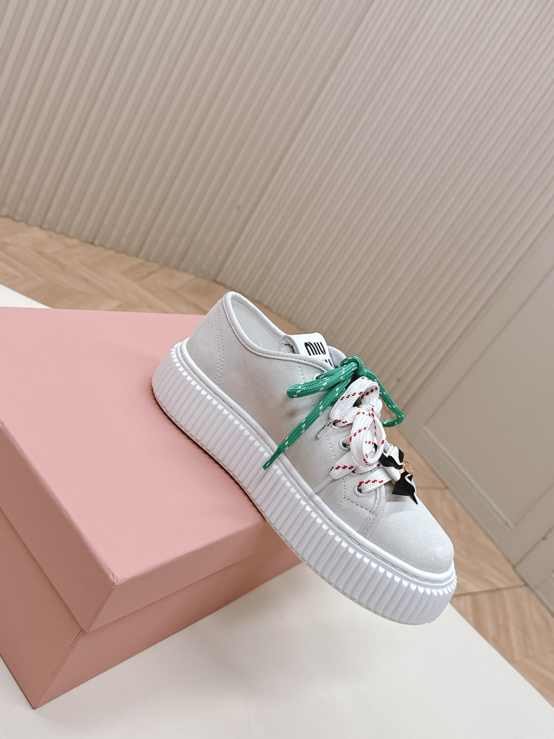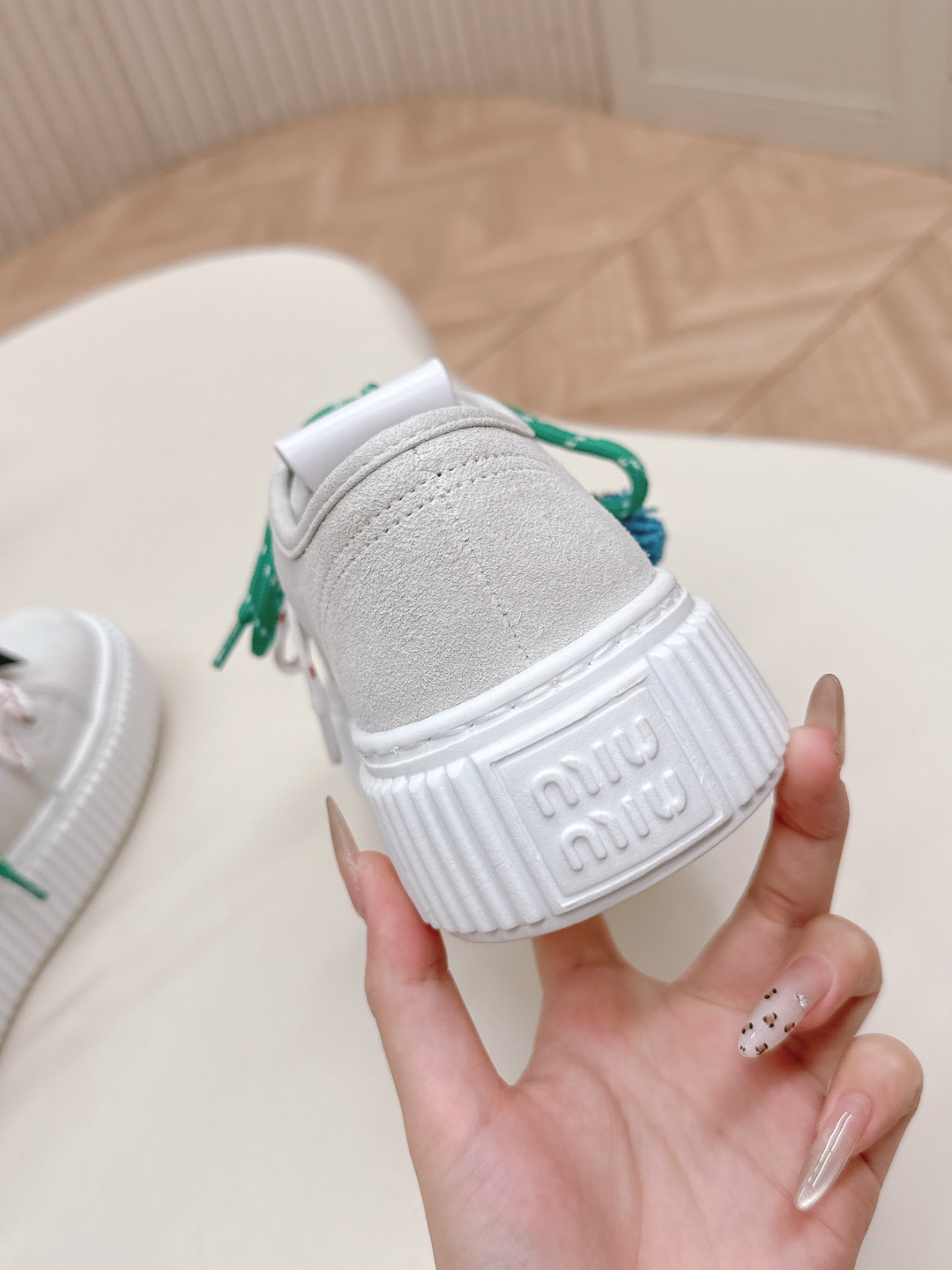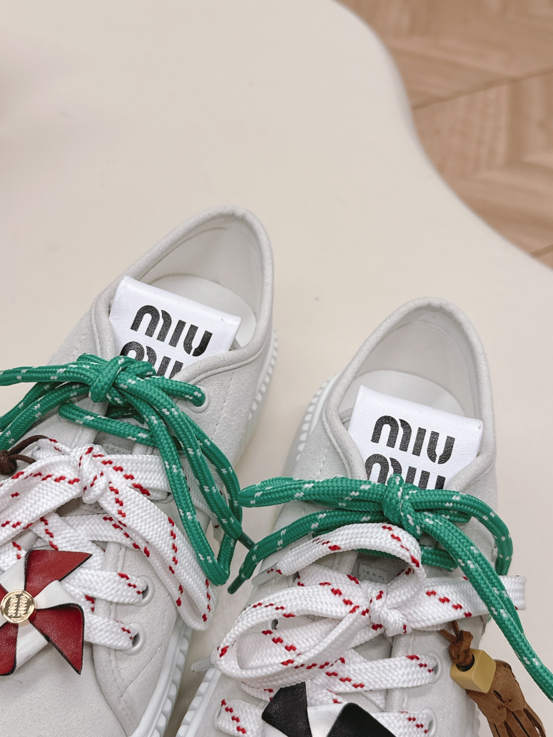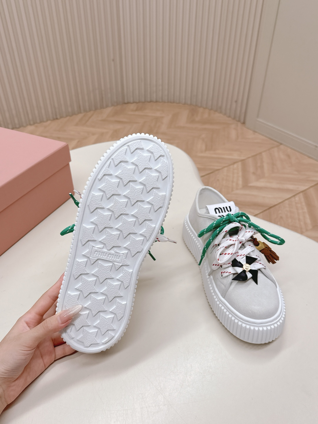 这款鞋子是AAAAA 1:1 质量 (非常棒). 使用了和原版一模一样的材料. 商标部分也保持了和缪缪/Miu Miu一样. 图片拍摄是实物鞋子拍摄, 您所收到的实物保证和我们图片一模一样.