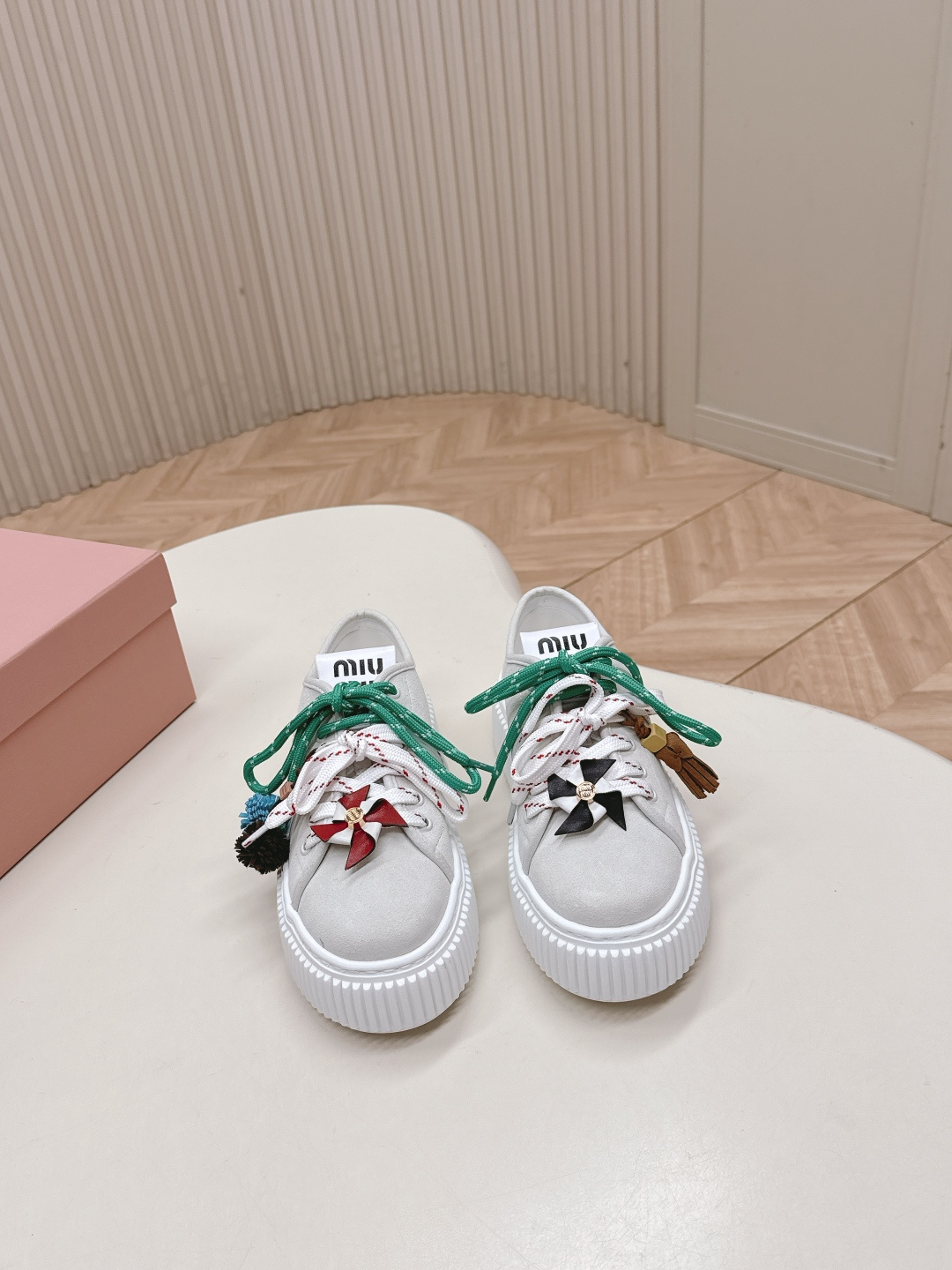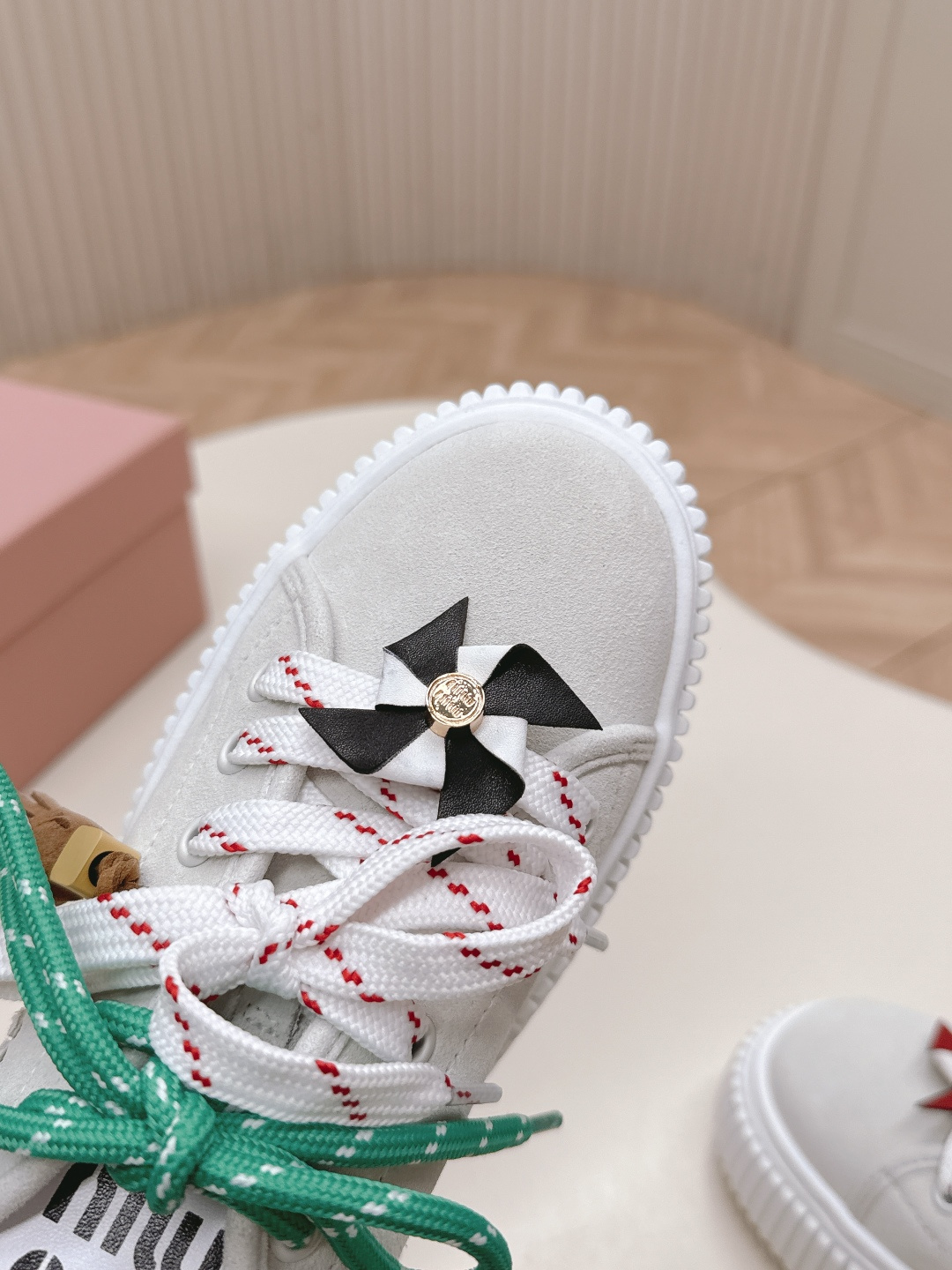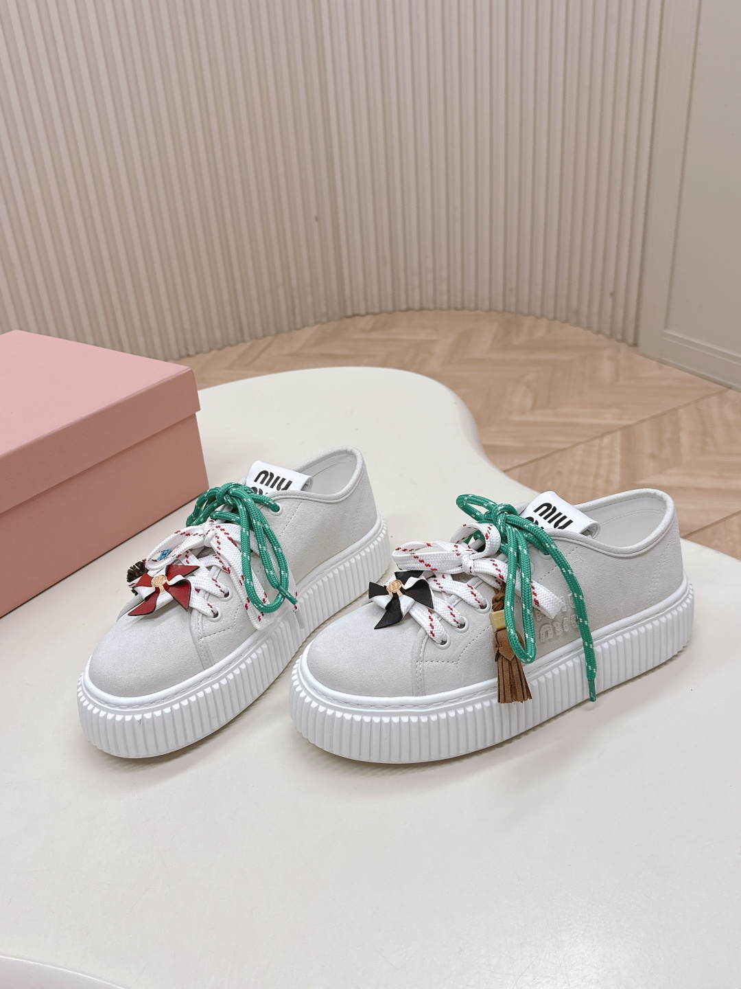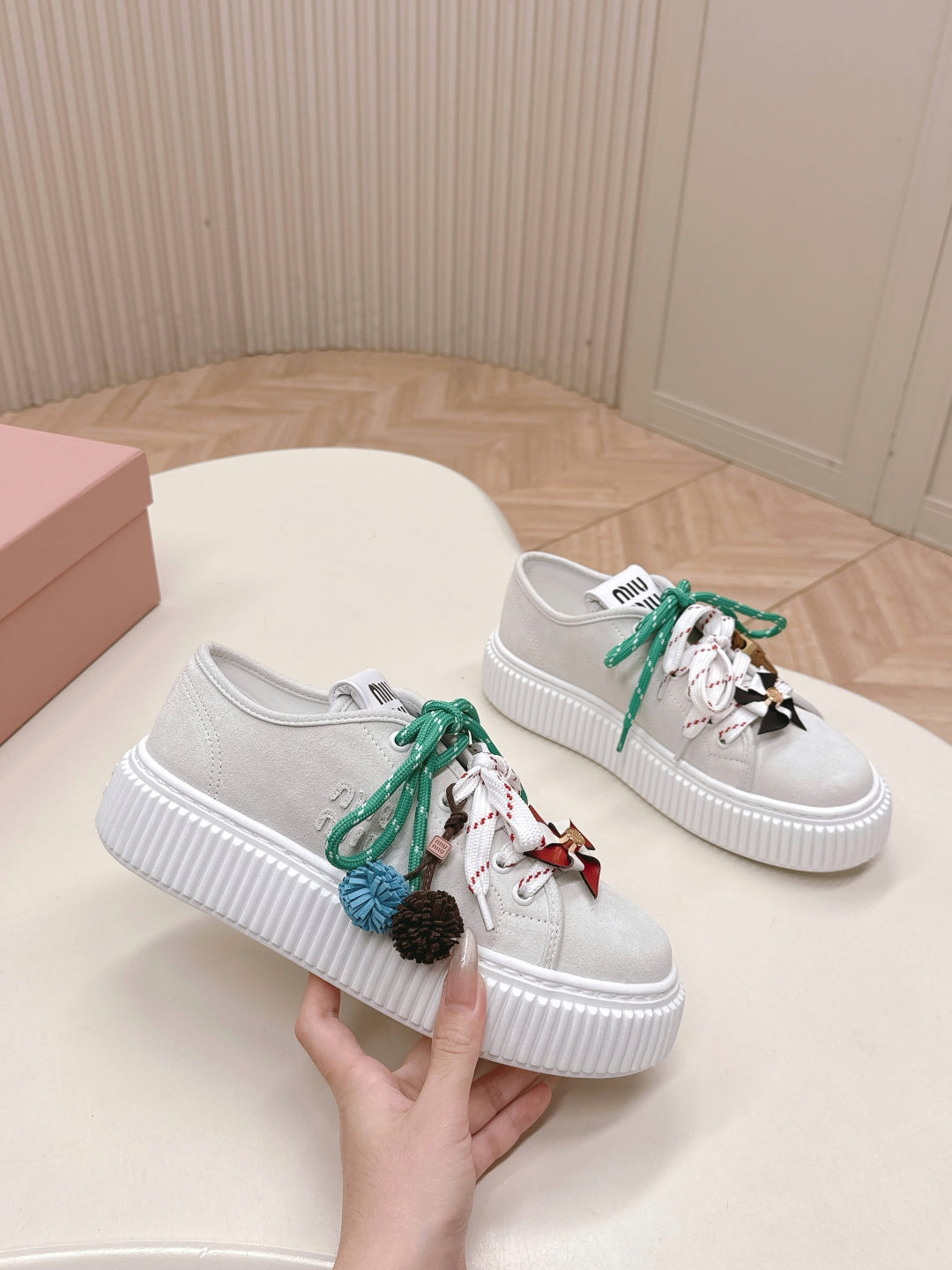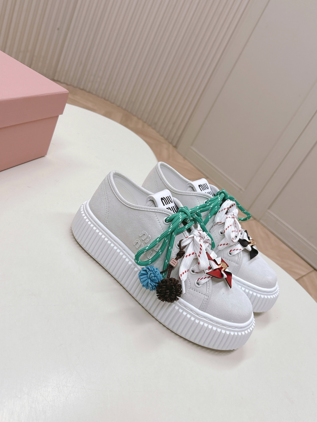 这款鞋子是AAAAA 1:1 质量 (非常棒). 使用了和原版一模一样的材料. 商标部分也保持了和缪缪/Miu Miu一样. 图片拍摄是实物鞋子拍摄, 您所收到的实物保证和我们图片一模一样.