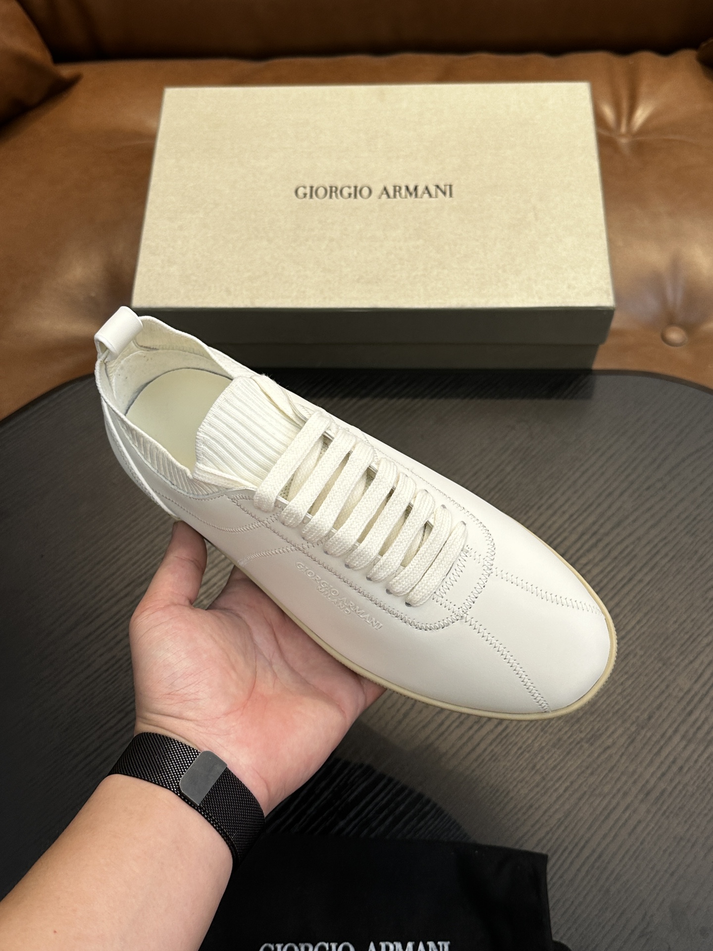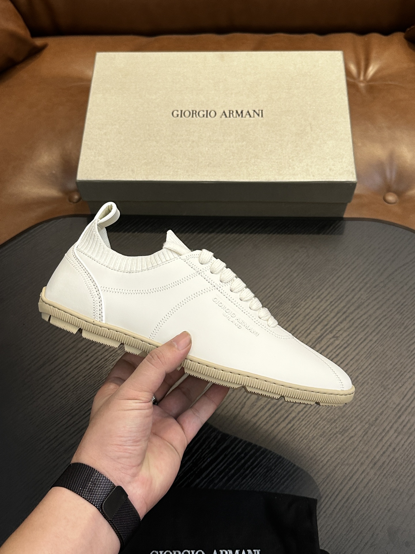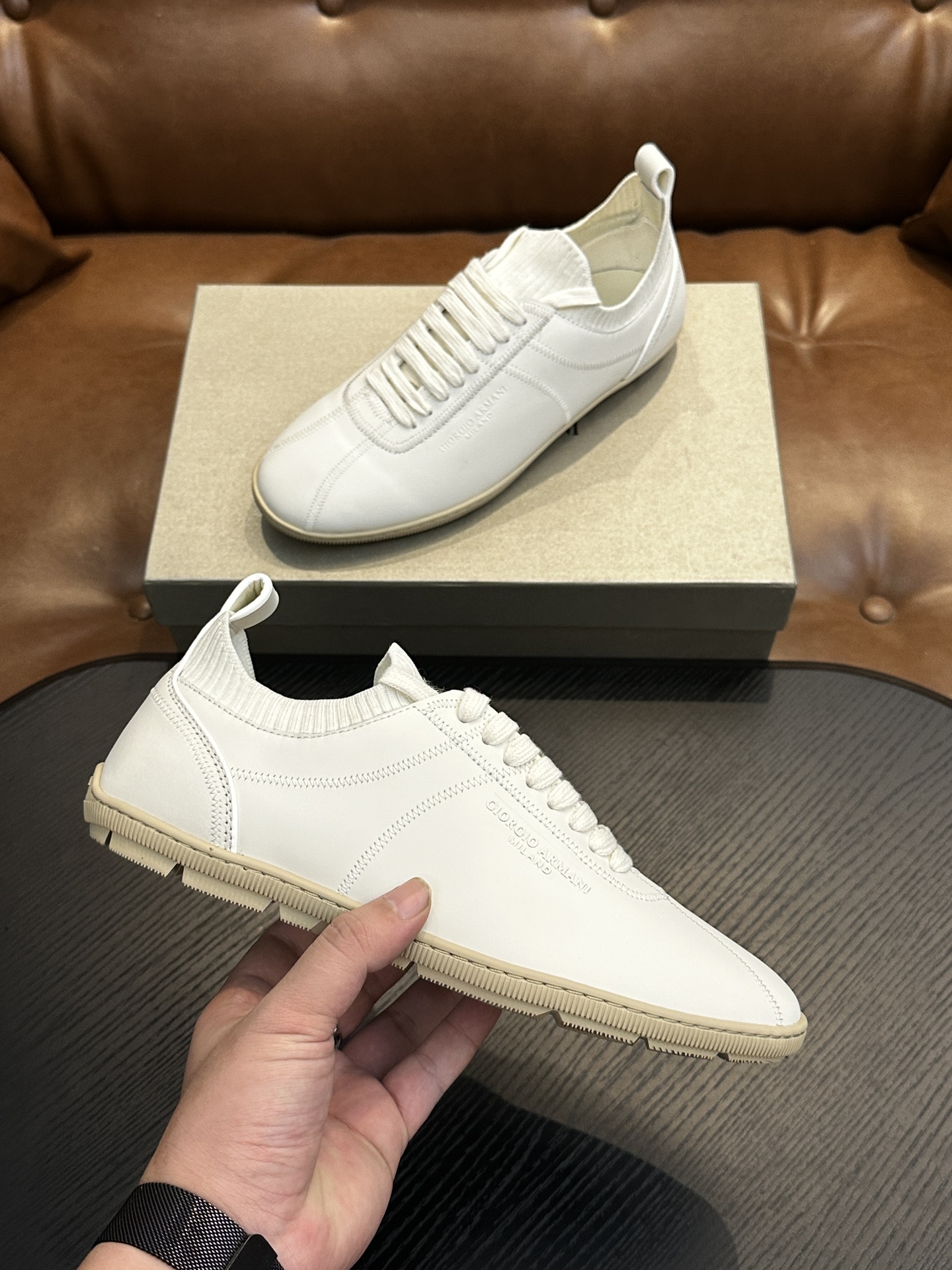 这款鞋子是AAAAA 1:1 质量 (非常棒). 使用了和原版一模一样的材料. 商标部分也保持了和阿玛尼/Armani一样. 图片拍摄是实物鞋子拍摄, 您所收到的实物保证和我们图片一模一样.