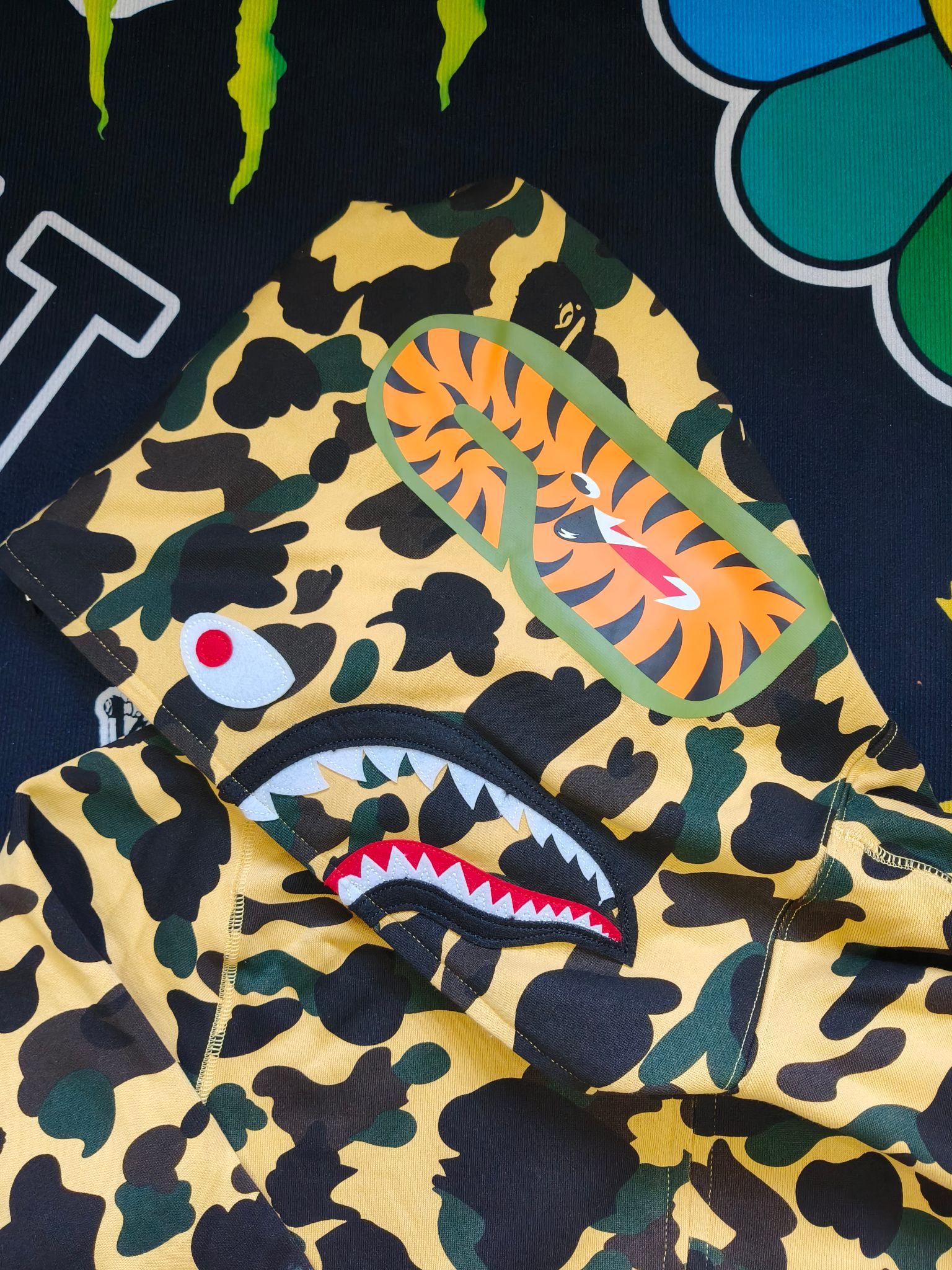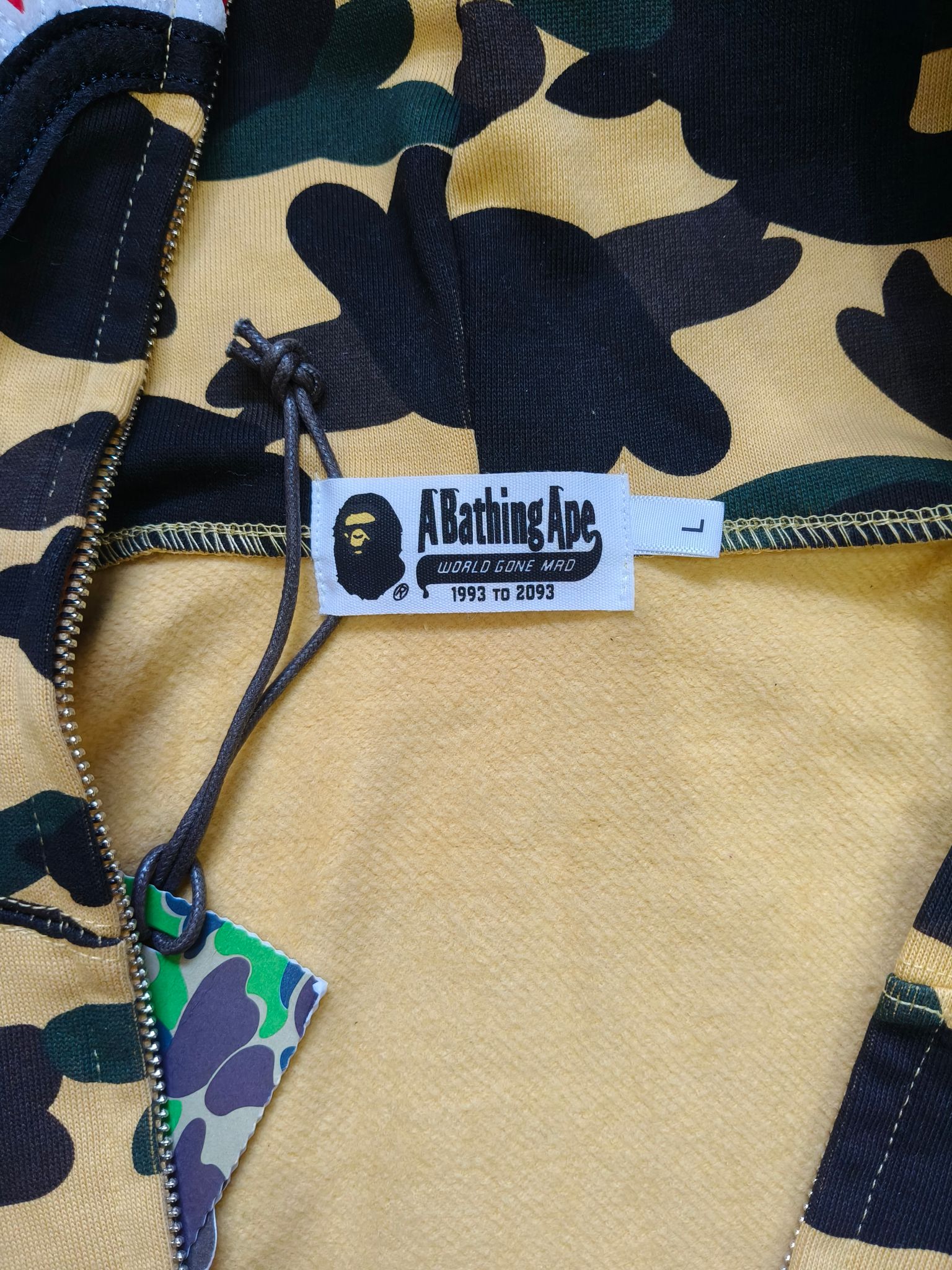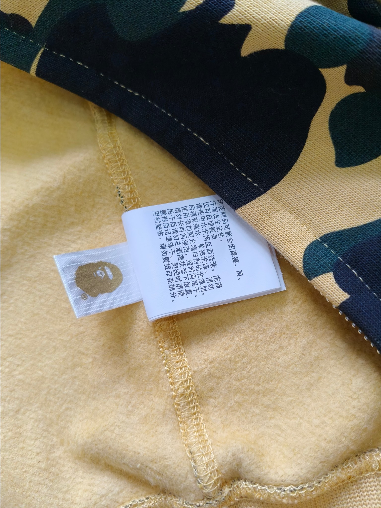 这款衣服是AAAAA 1:1 质量 (非常棒). 使用了和原版一模一样的材料. 商标部分也保持了和Bape一样. 图片拍摄是实物衣服拍摄, 您所收到的实物保证和我们图片一模一样.