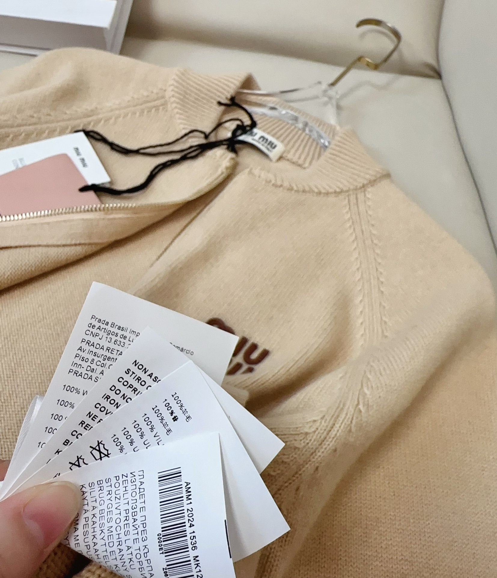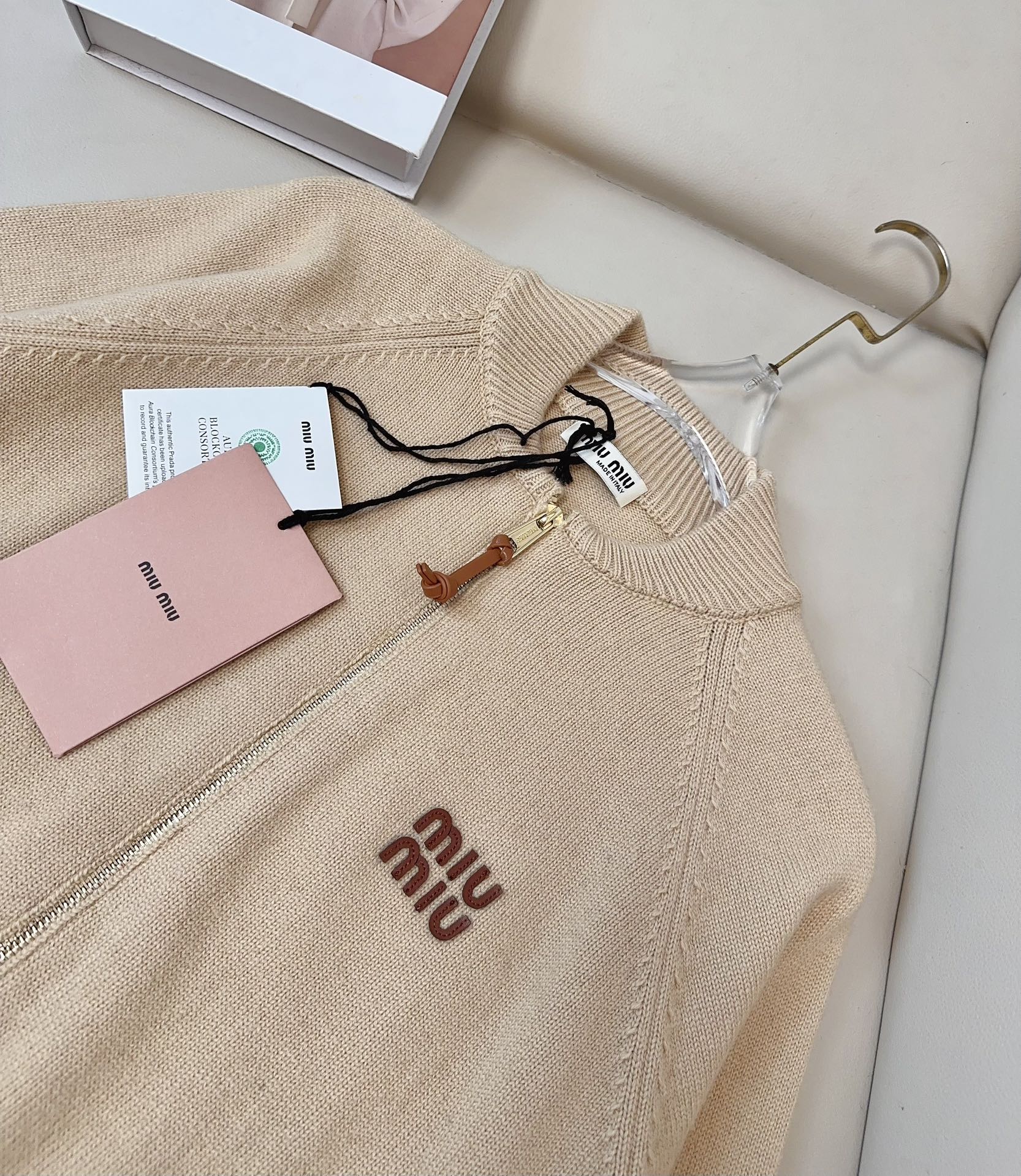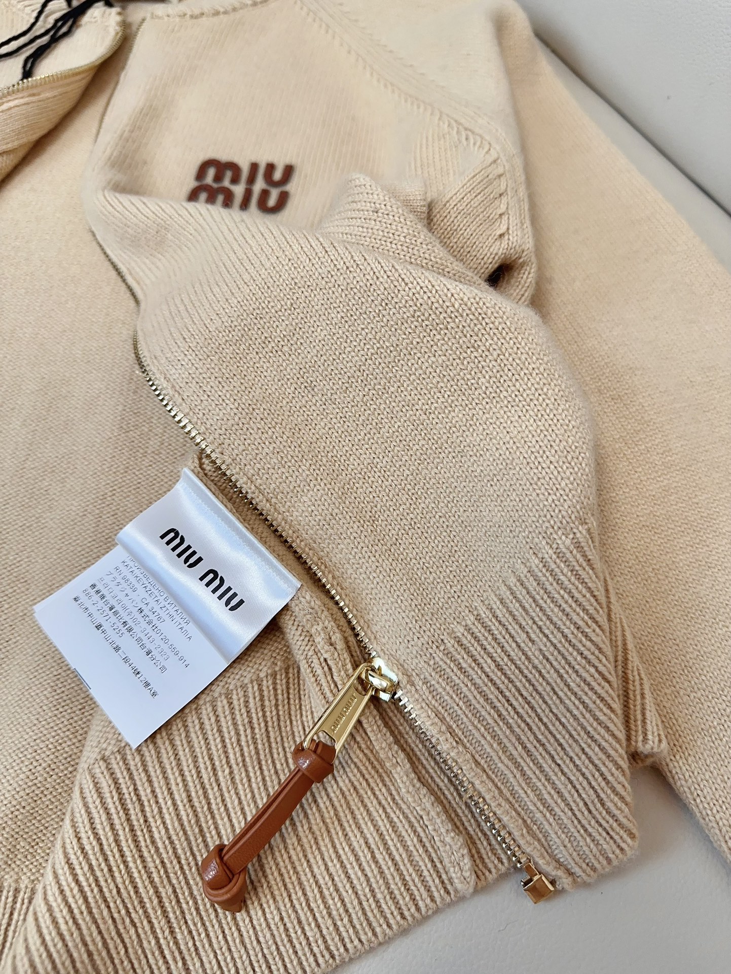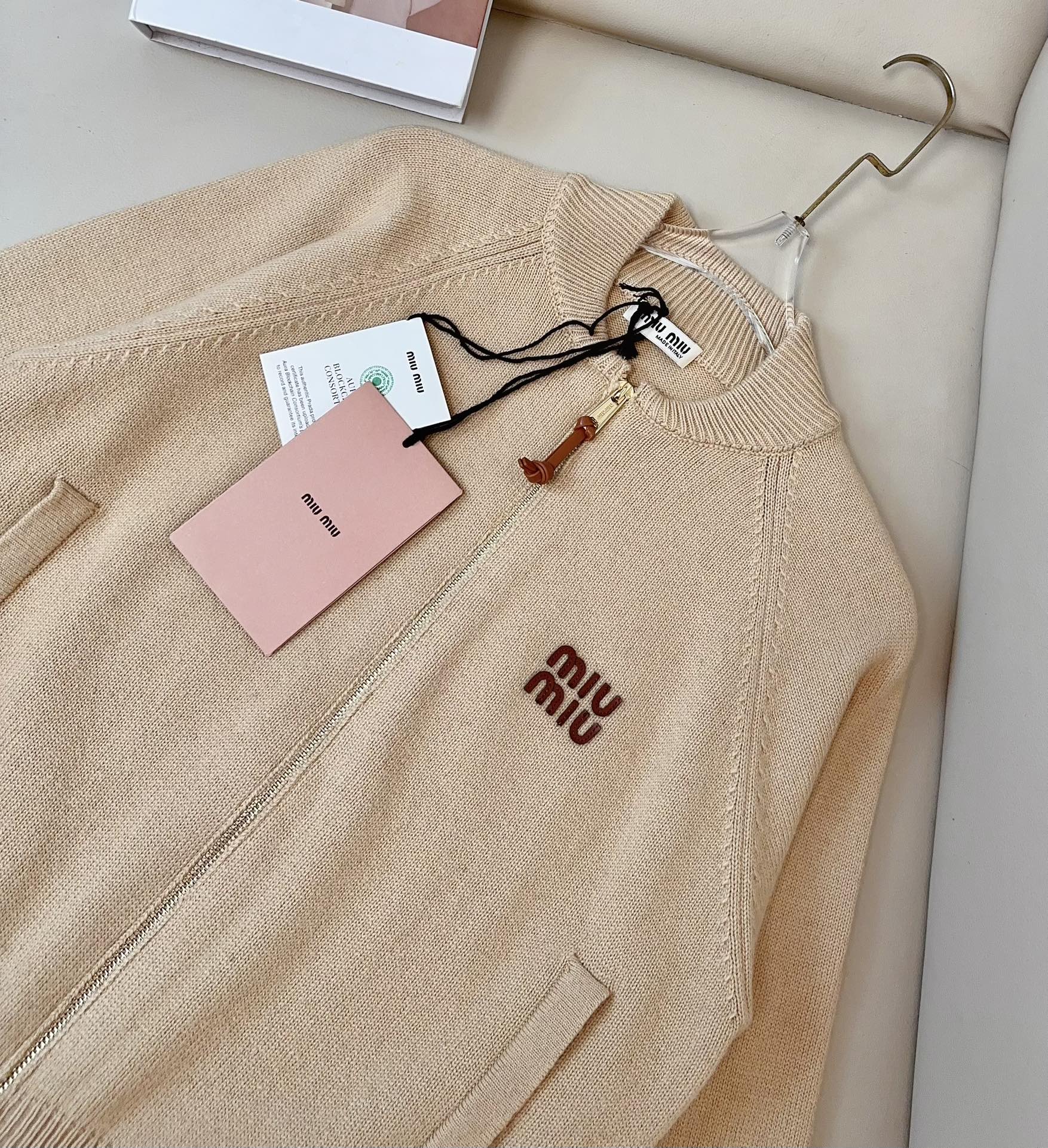 这款衣服是AAAAA 1:1 质量 (非常棒). 使用了和原版一模一样的材料. 商标部分也保持了和缪缪/Miu Miu一样. 图片拍摄是实物衣服拍摄, 您所收到的实物保证和我们图片一模一样.