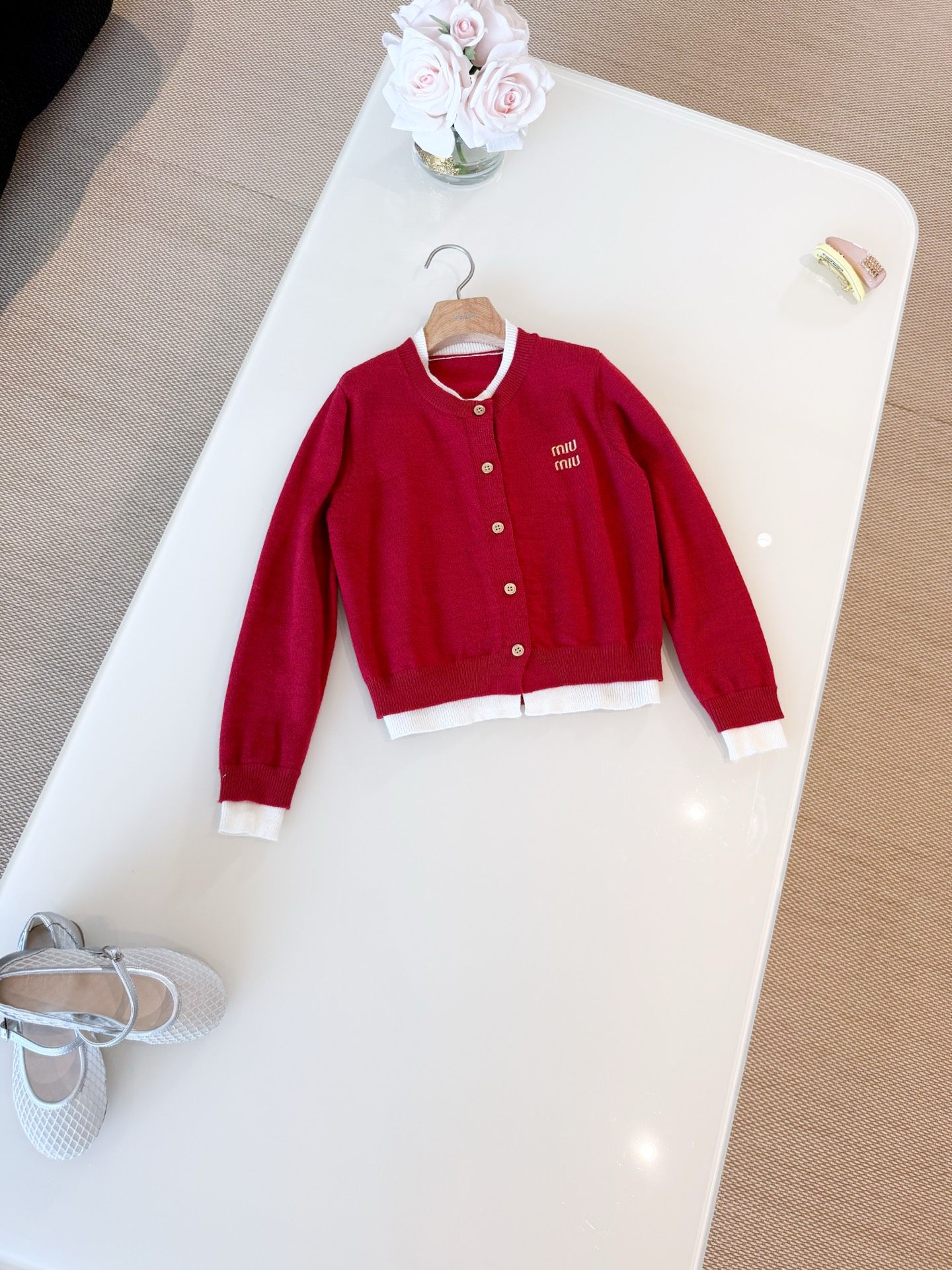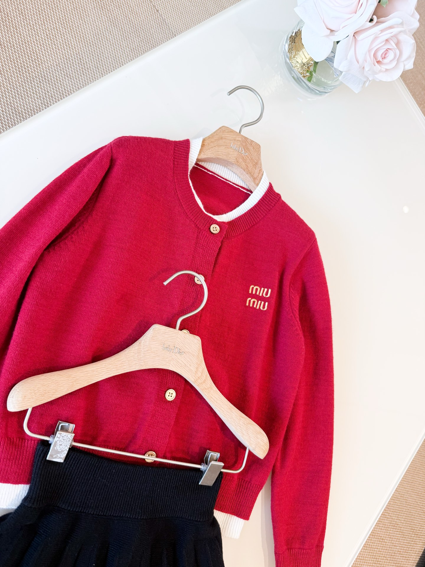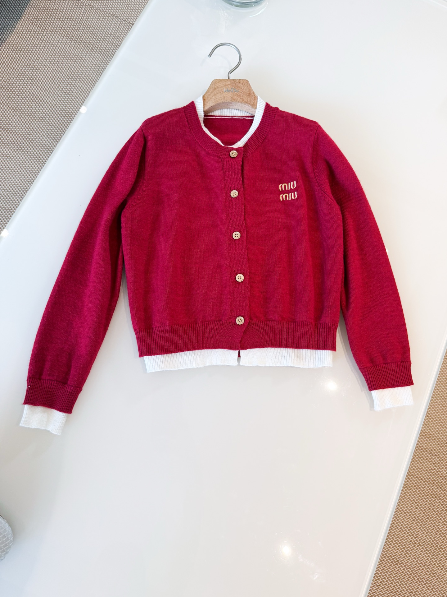 这款衣服是AAAAA 1:1 质量 (非常棒). 使用了和原版一模一样的材料. 商标部分也保持了和缪缪/Miu Miu一样. 图片拍摄是实物衣服拍摄, 您所收到的实物保证和我们图片一模一样.