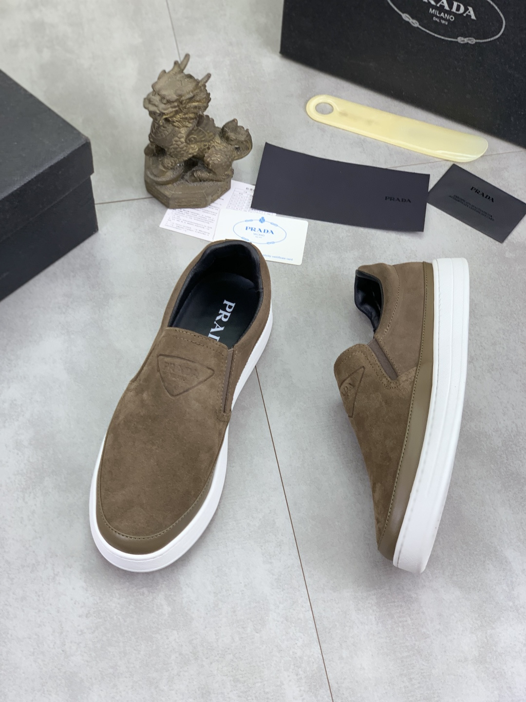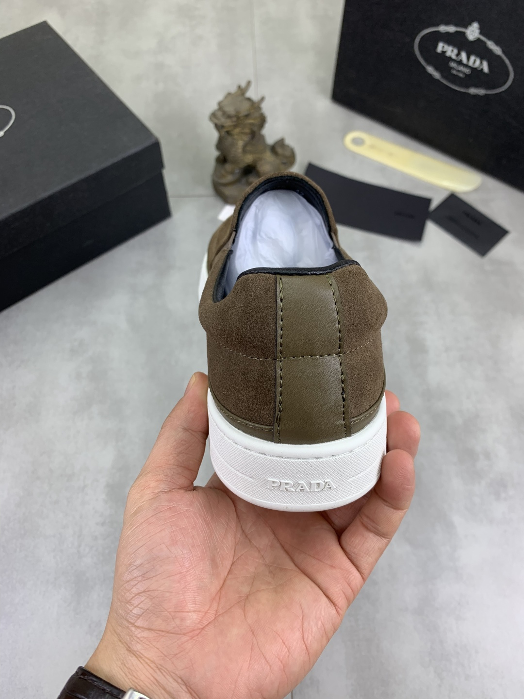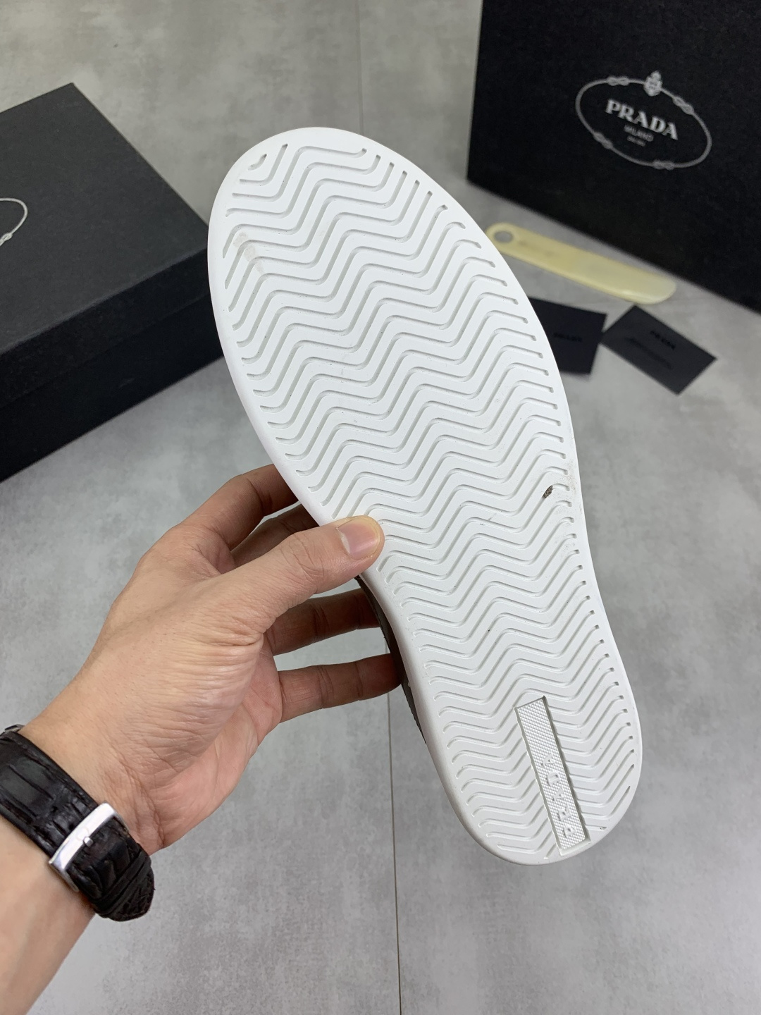 这款鞋子是AAAAA 1:1 质量 (非常棒). 使用了和原版一模一样的材料. 商标部分也保持了和普拉达/Prada一样. 图片拍摄是实物鞋子拍摄, 您所收到的实物保证和我们图片一模一样.