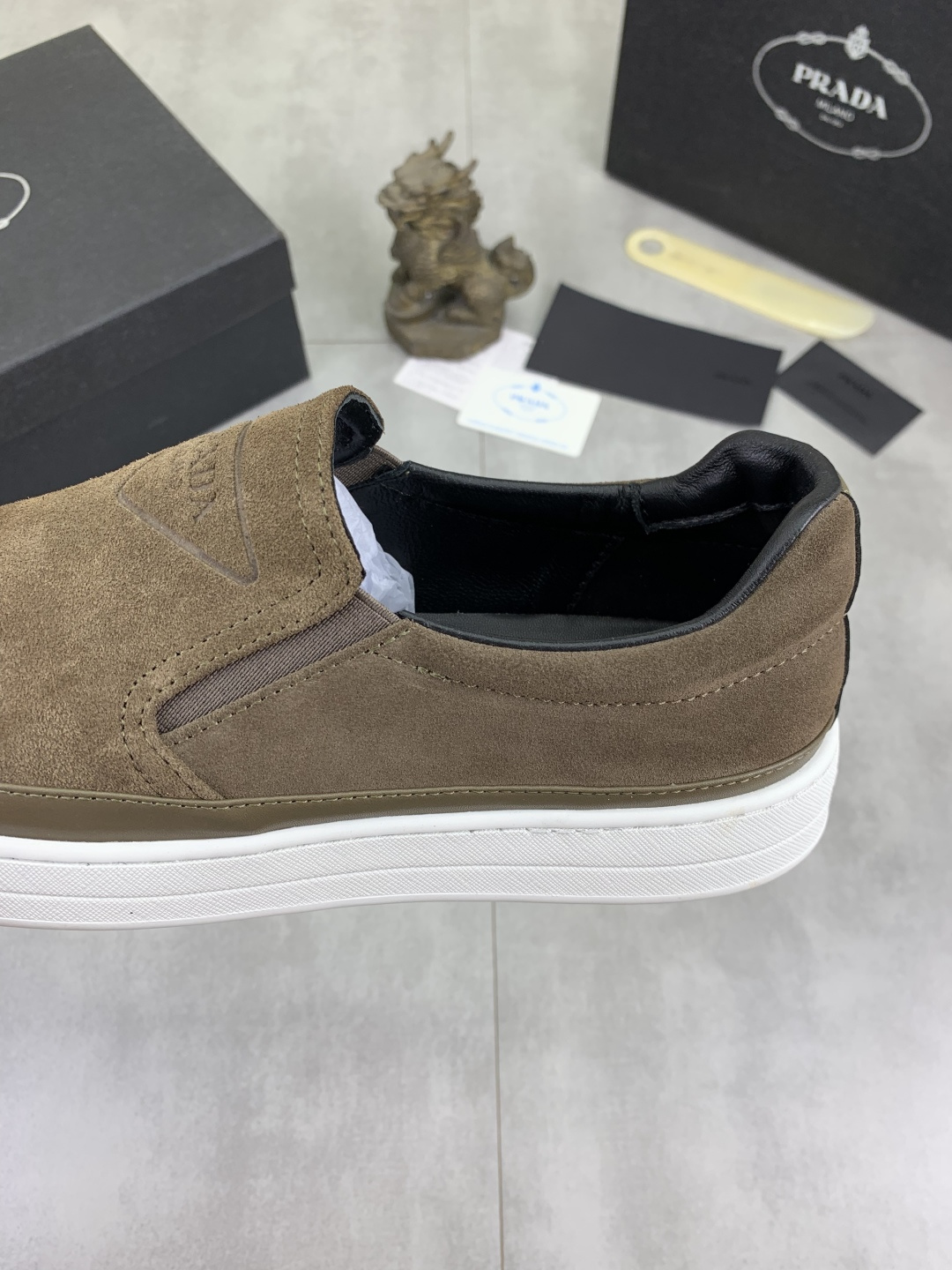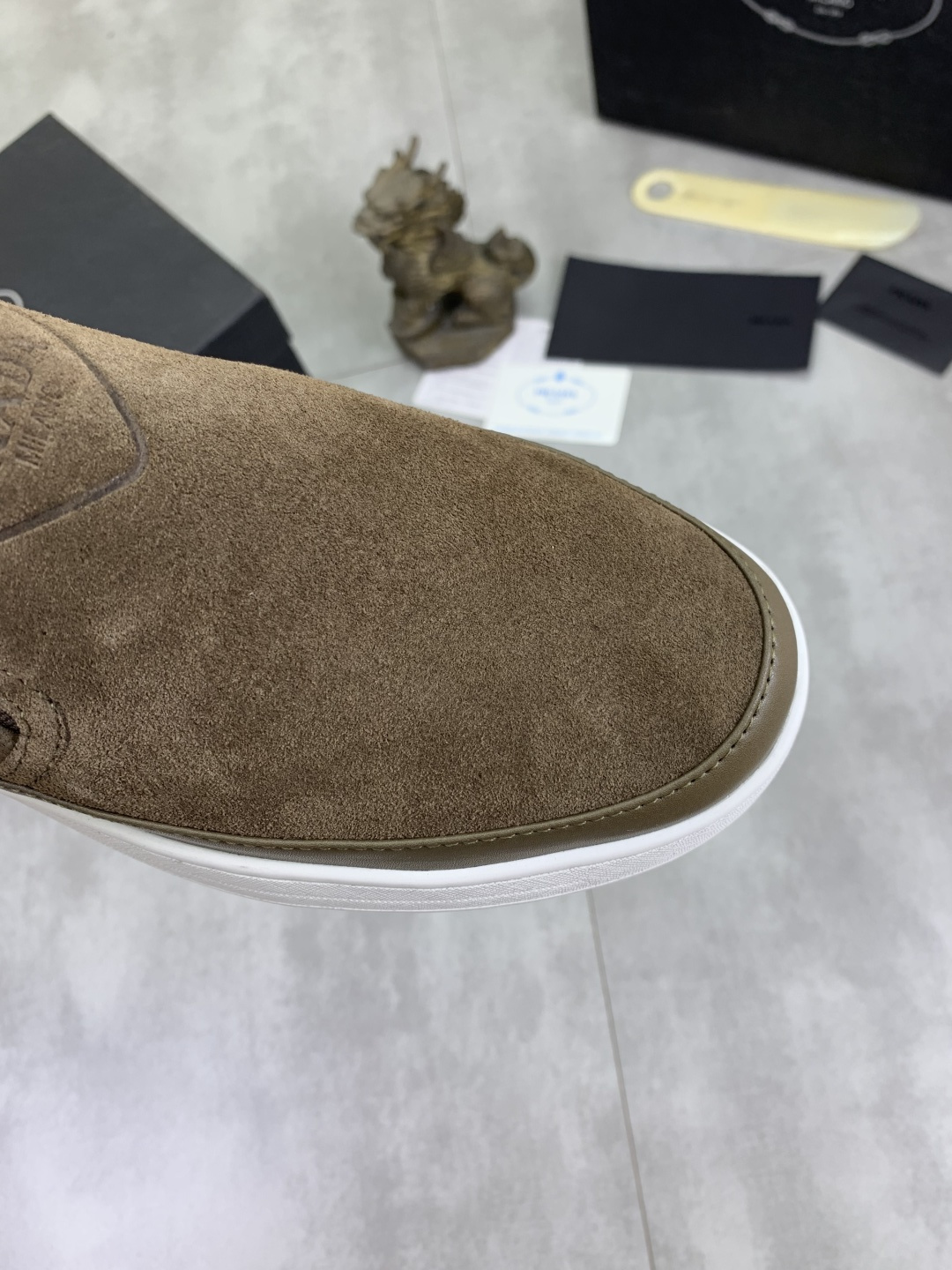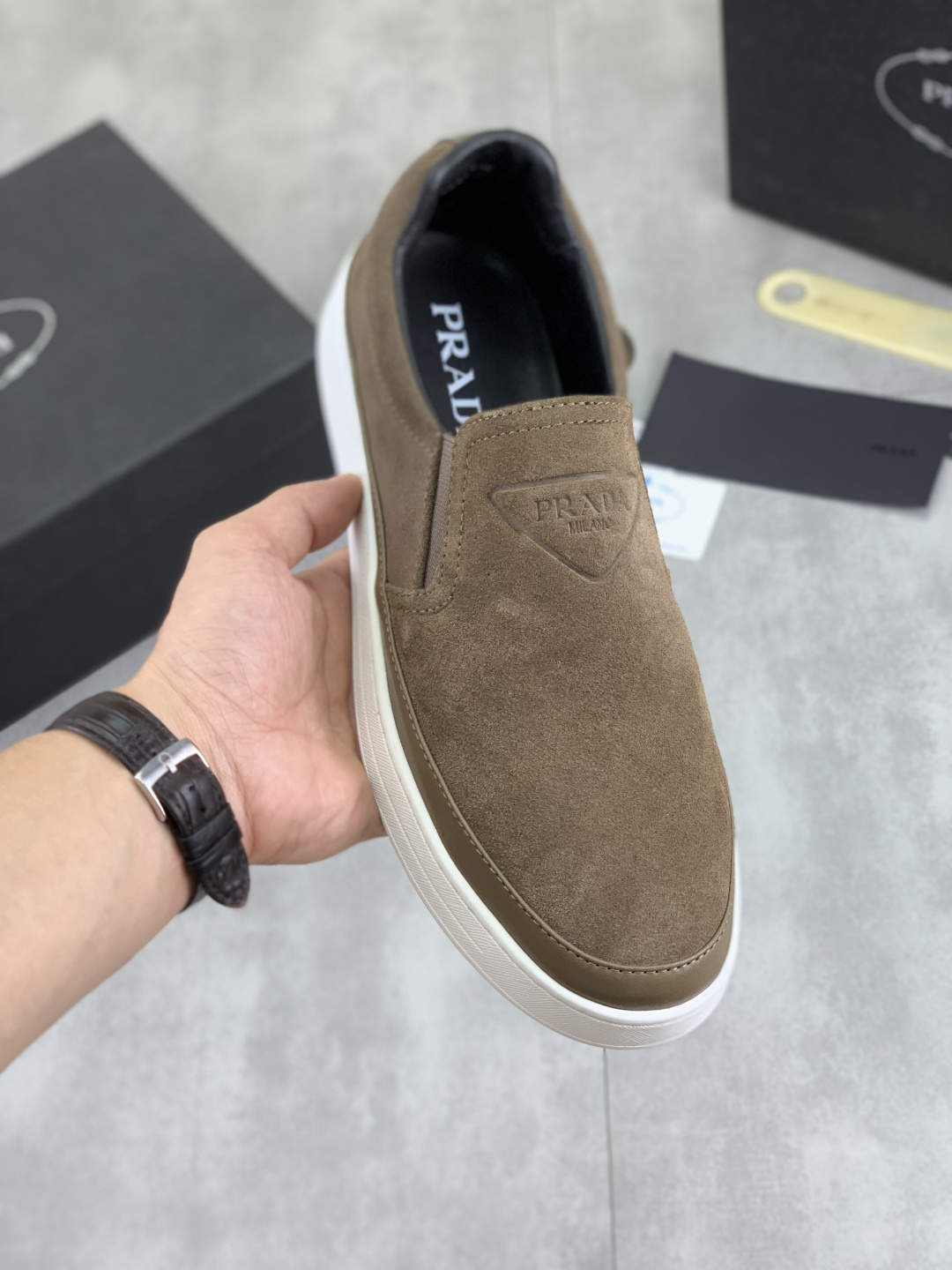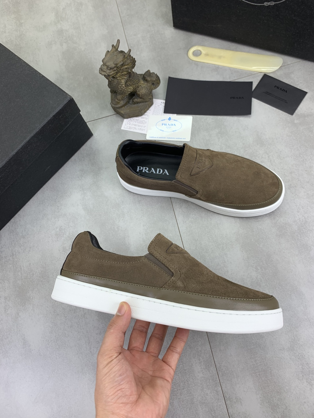 这款鞋子是AAAAA 1:1 质量 (非常棒). 使用了和原版一模一样的材料. 商标部分也保持了和普拉达/Prada一样. 图片拍摄是实物鞋子拍摄, 您所收到的实物保证和我们图片一模一样.