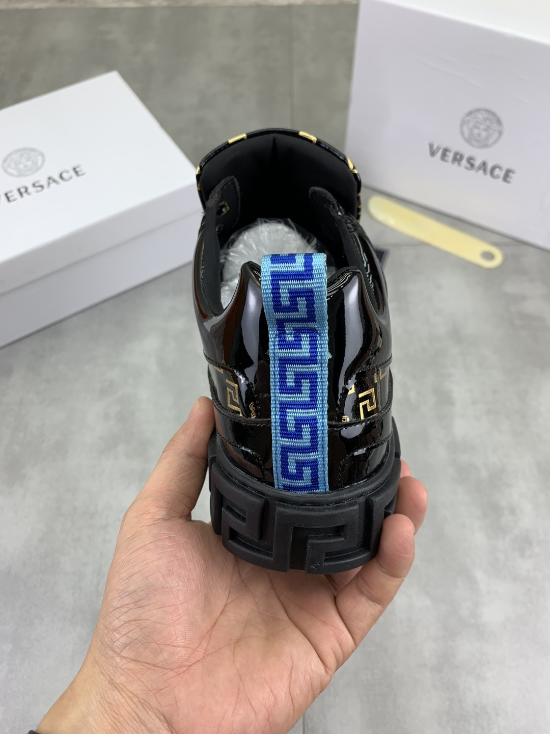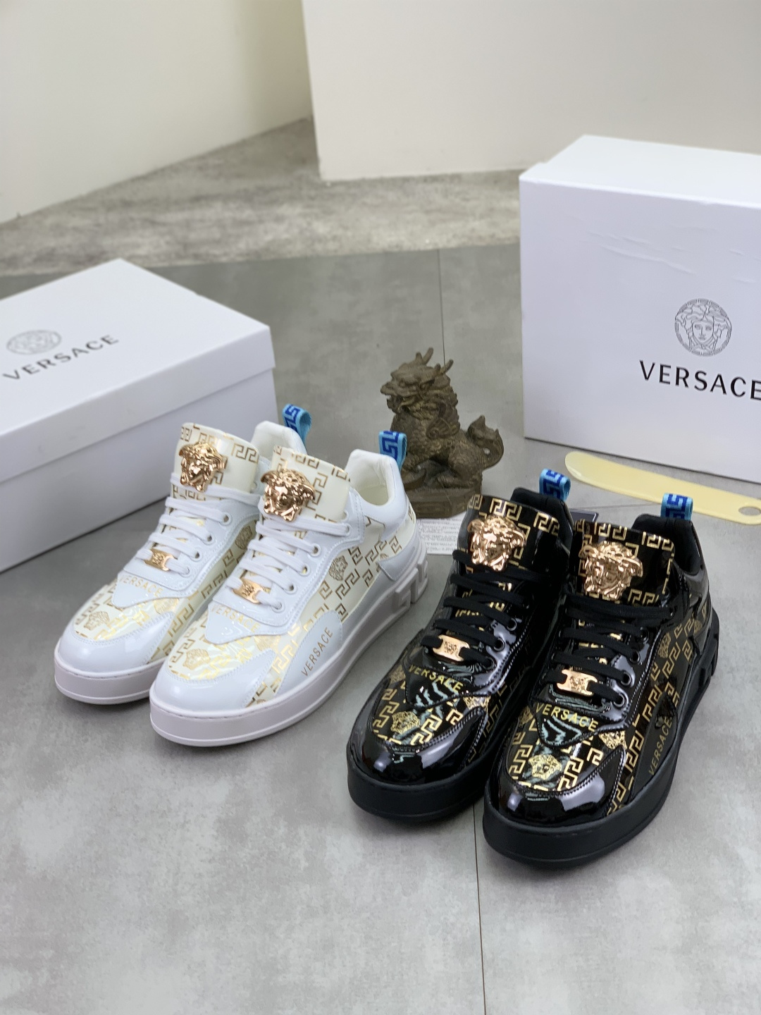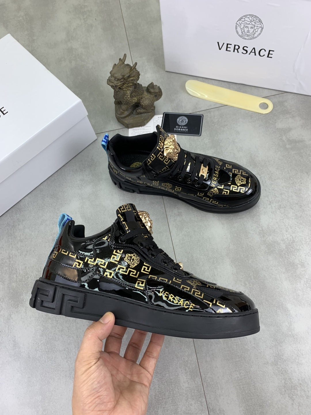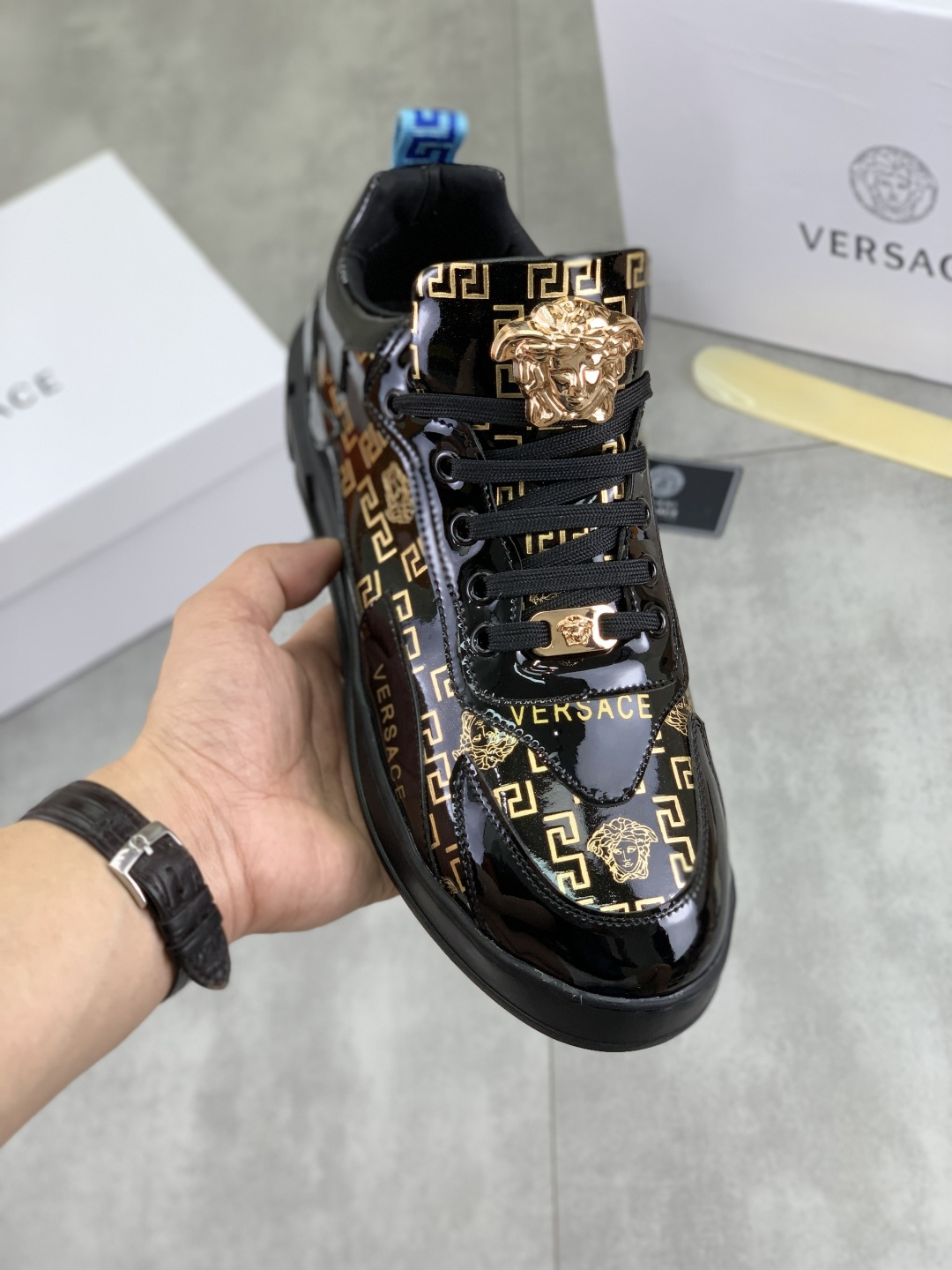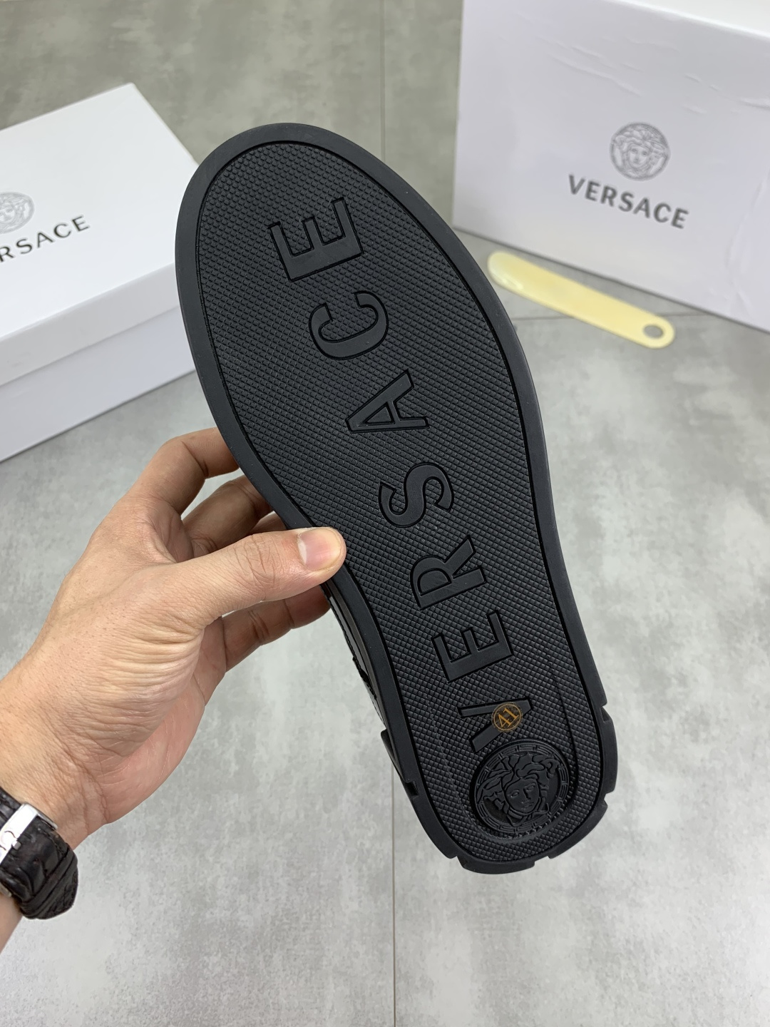 这款鞋子是AAAAA 1:1 质量 (非常棒). 使用了和原版一模一样的材料. 商标部分也保持了和范思哲/Versace一样. 图片拍摄是实物鞋子拍摄, 您所收到的实物保证和我们图片一模一样.