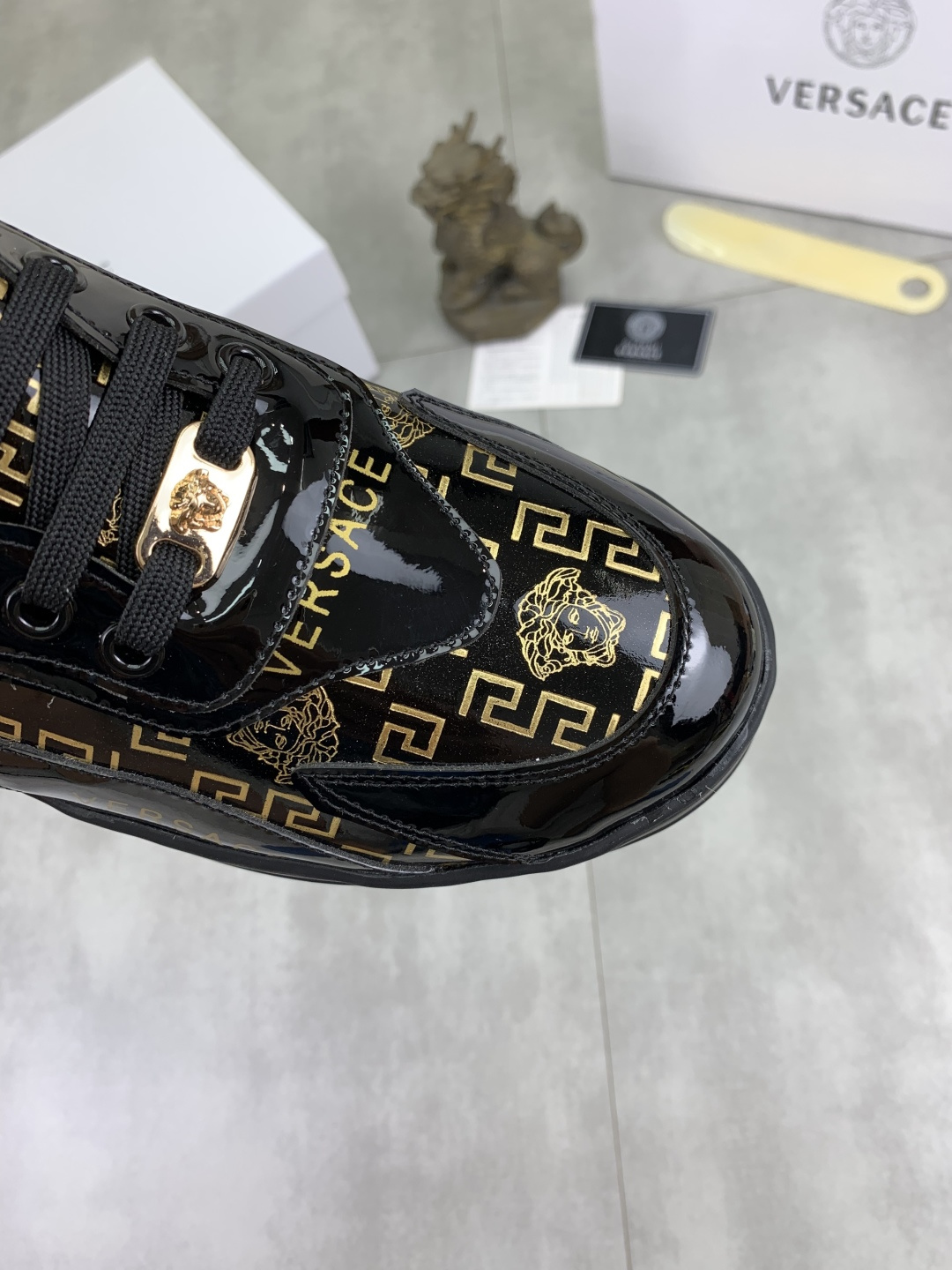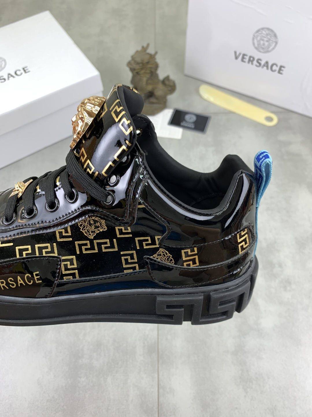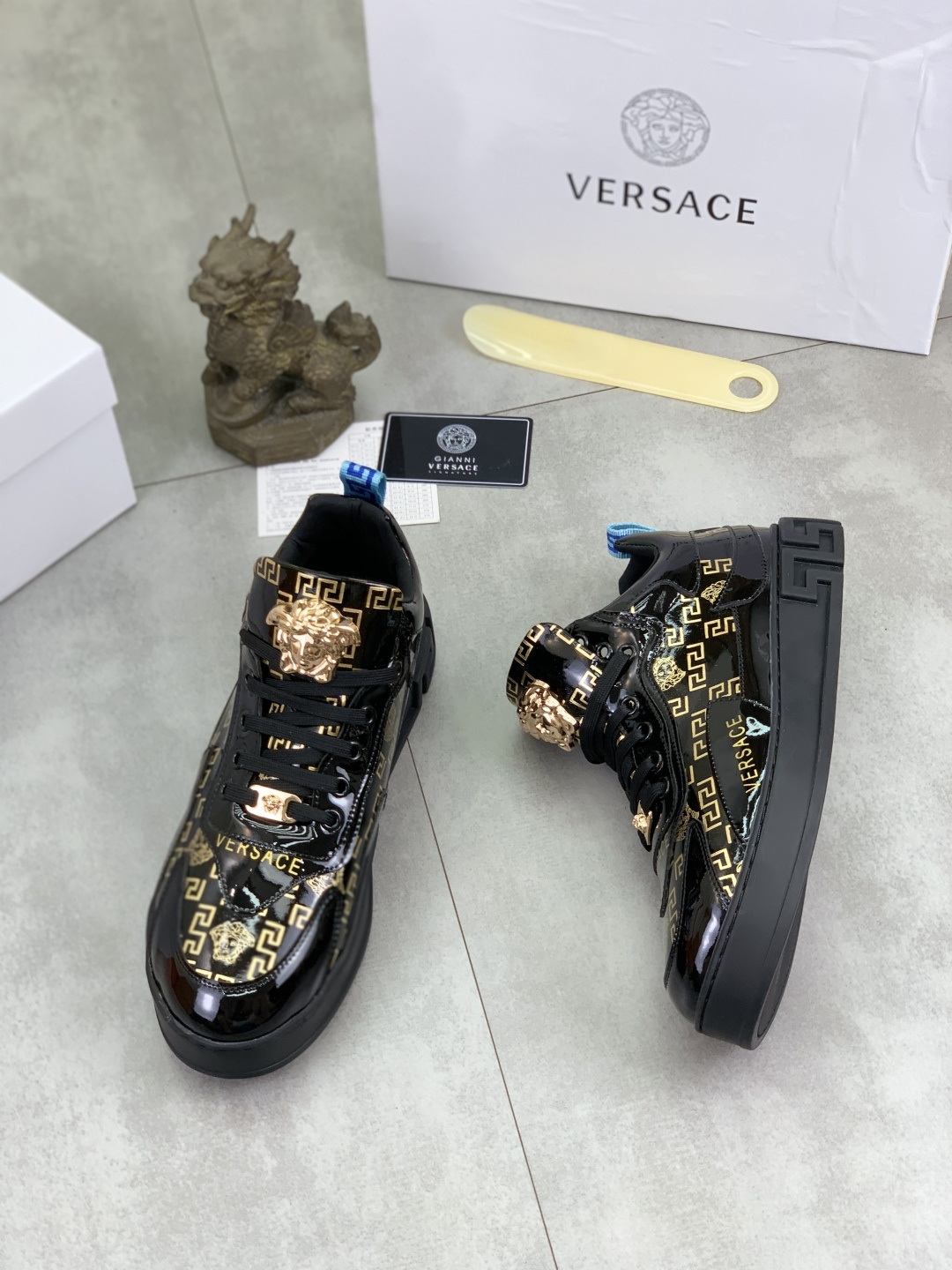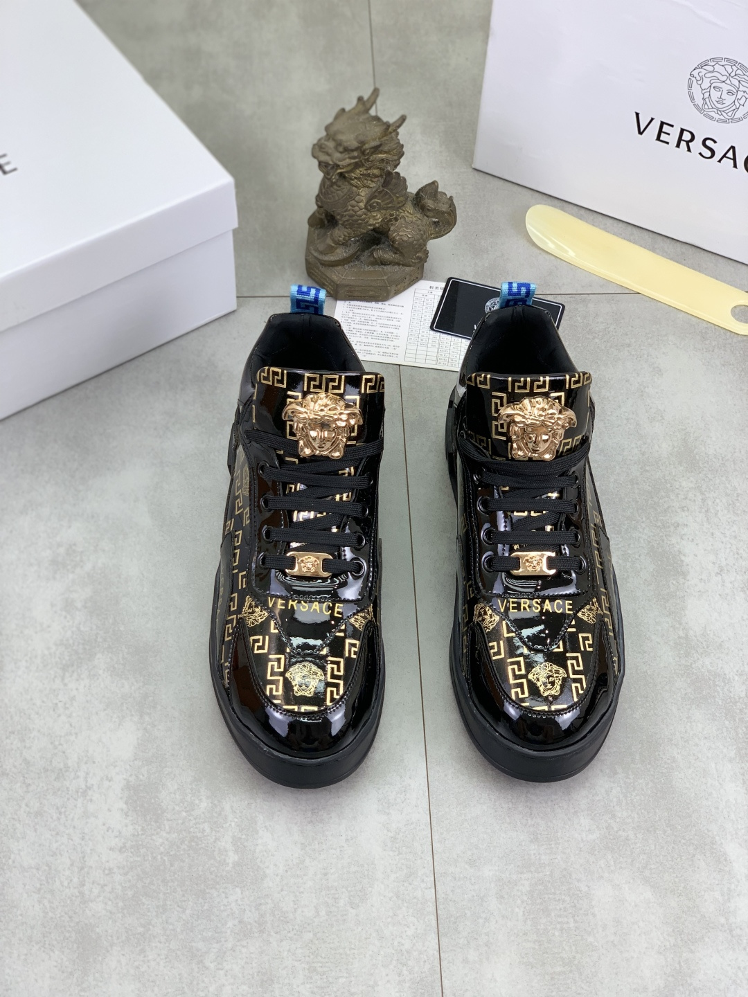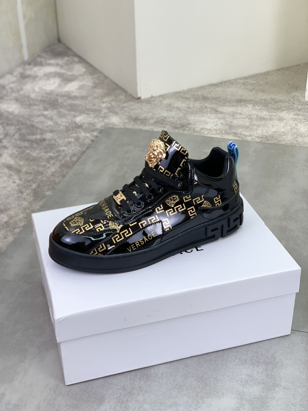 这款鞋子是AAAAA 1:1 质量 (非常棒). 使用了和原版一模一样的材料. 商标部分也保持了和范思哲/Versace一样. 图片拍摄是实物鞋子拍摄, 您所收到的实物保证和我们图片一模一样.