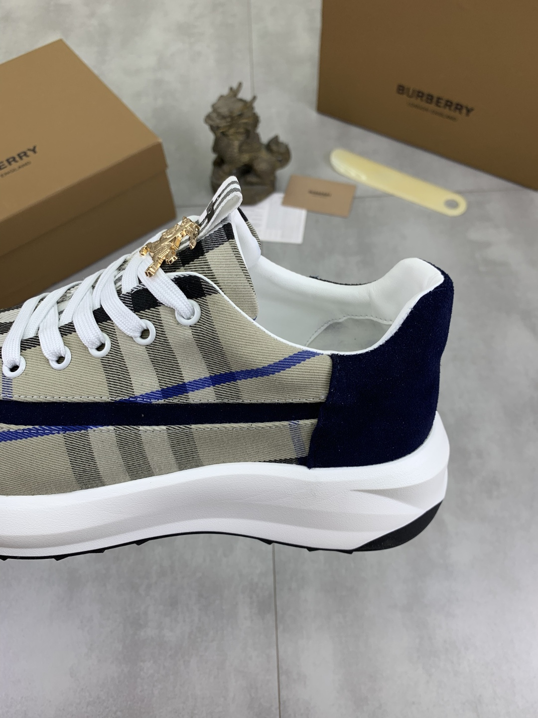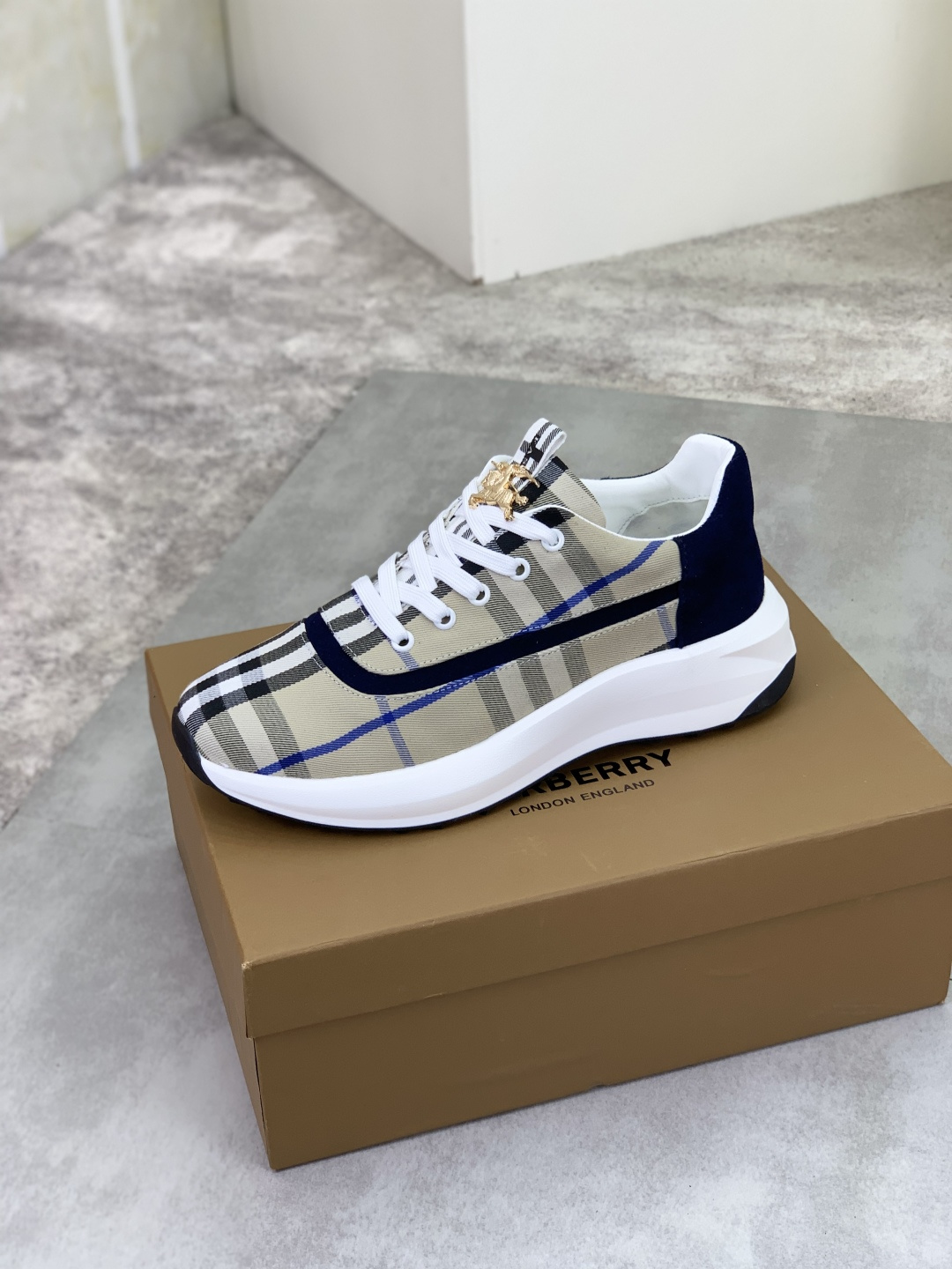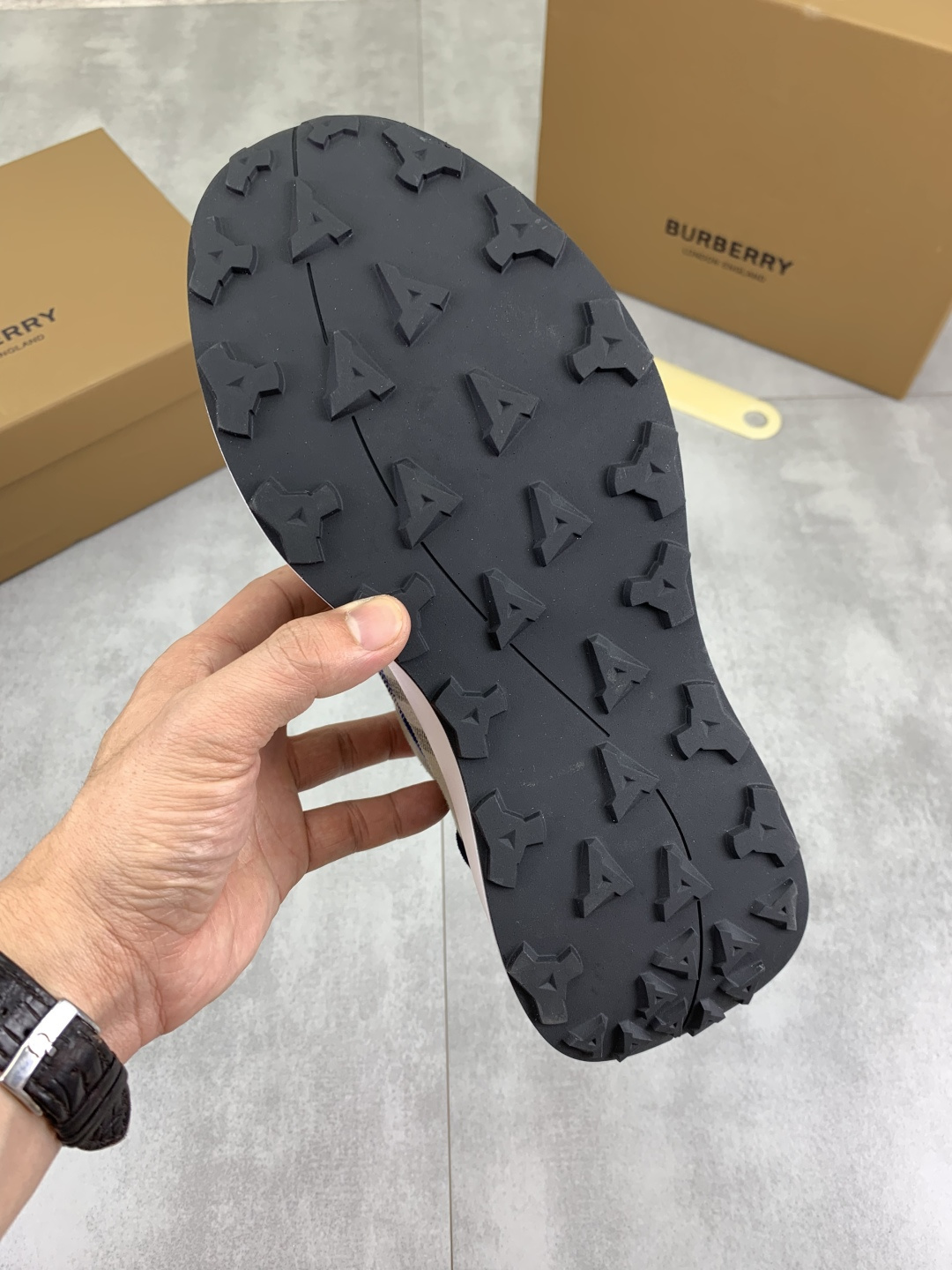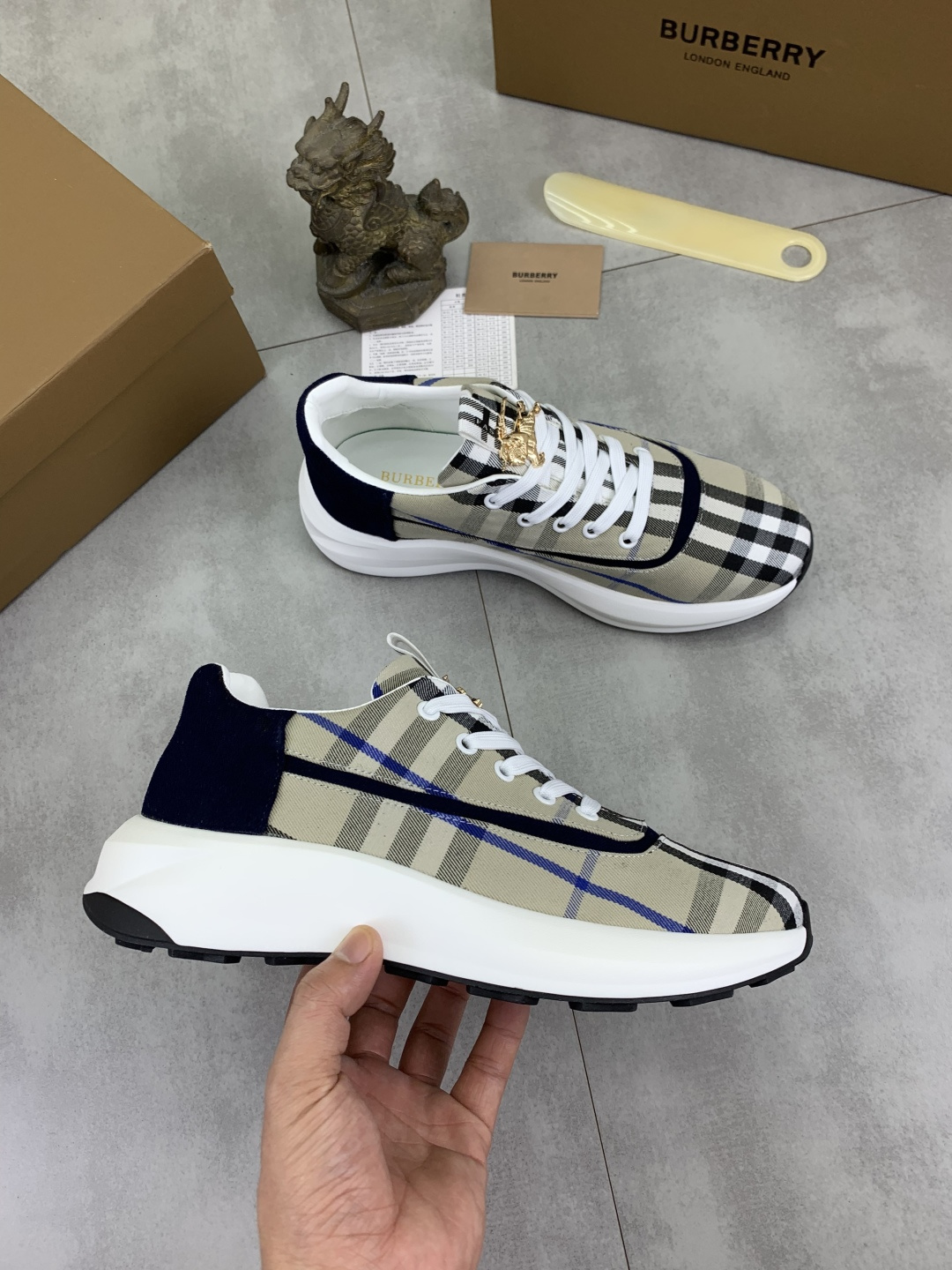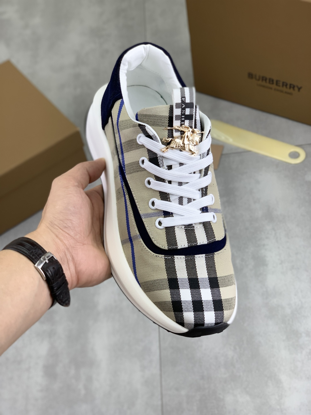 这款鞋子是AAAAA 1:1 质量 (非常棒). 使用了和原版一模一样的材料. 商标部分也保持了和巴宝莉/Burberry一样. 图片拍摄是实物鞋子拍摄, 您所收到的实物保证和我们图片一模一样.