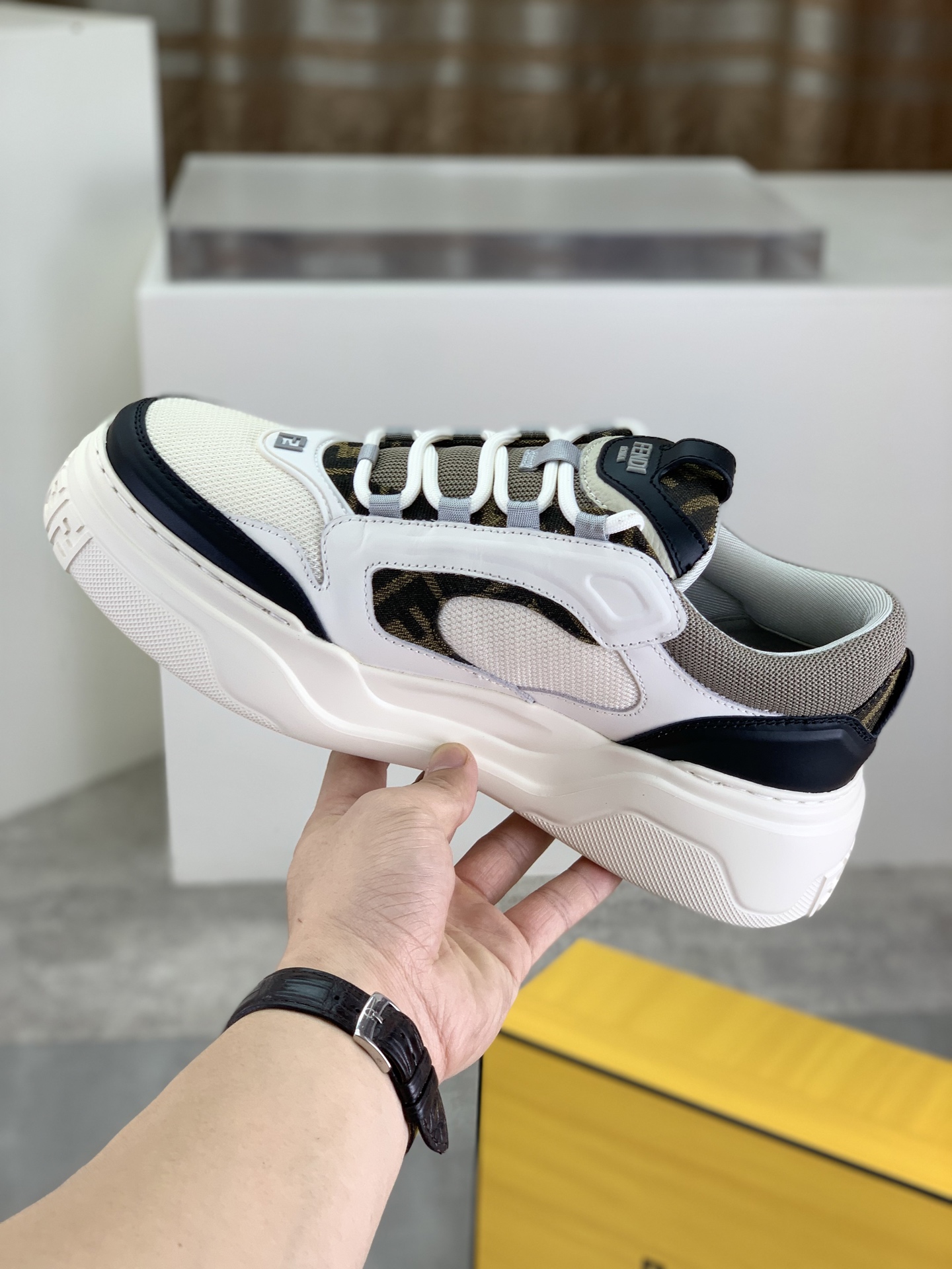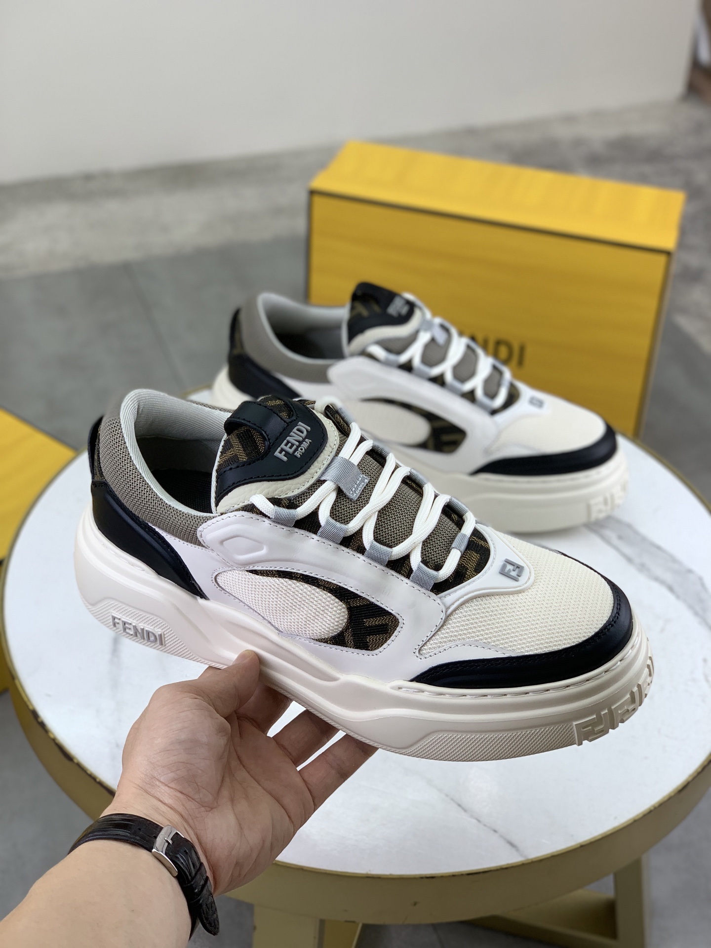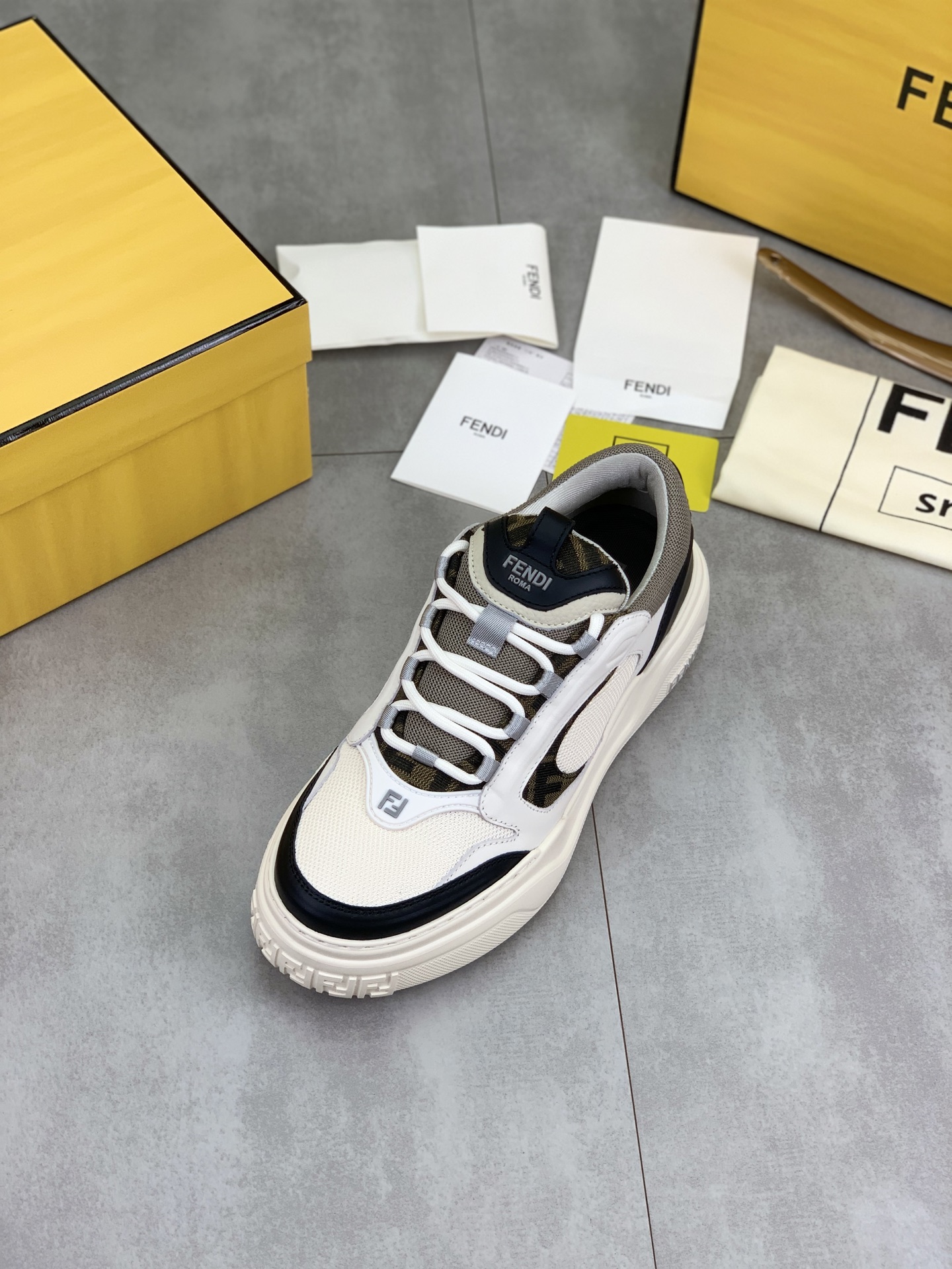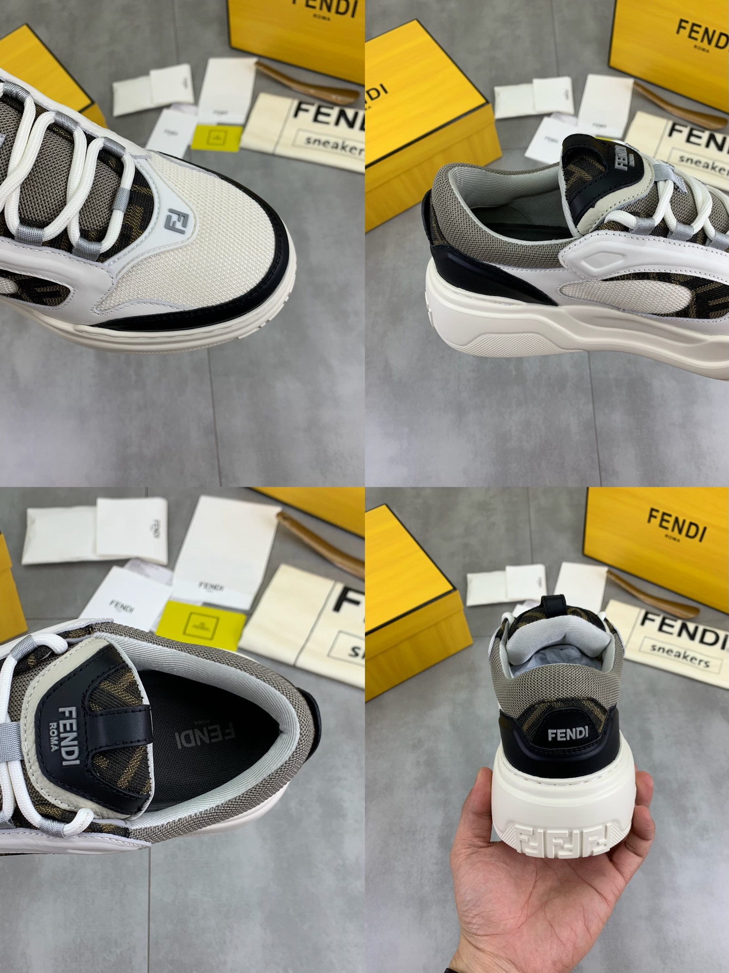 这款鞋子是AAAAA 1:1 质量 (非常棒). 使用了和原版一模一样的材料. 商标部分也保持了和芬迪/Fendi一样. 图片拍摄是实物鞋子拍摄, 您所收到的实物保证和我们图片一模一样.