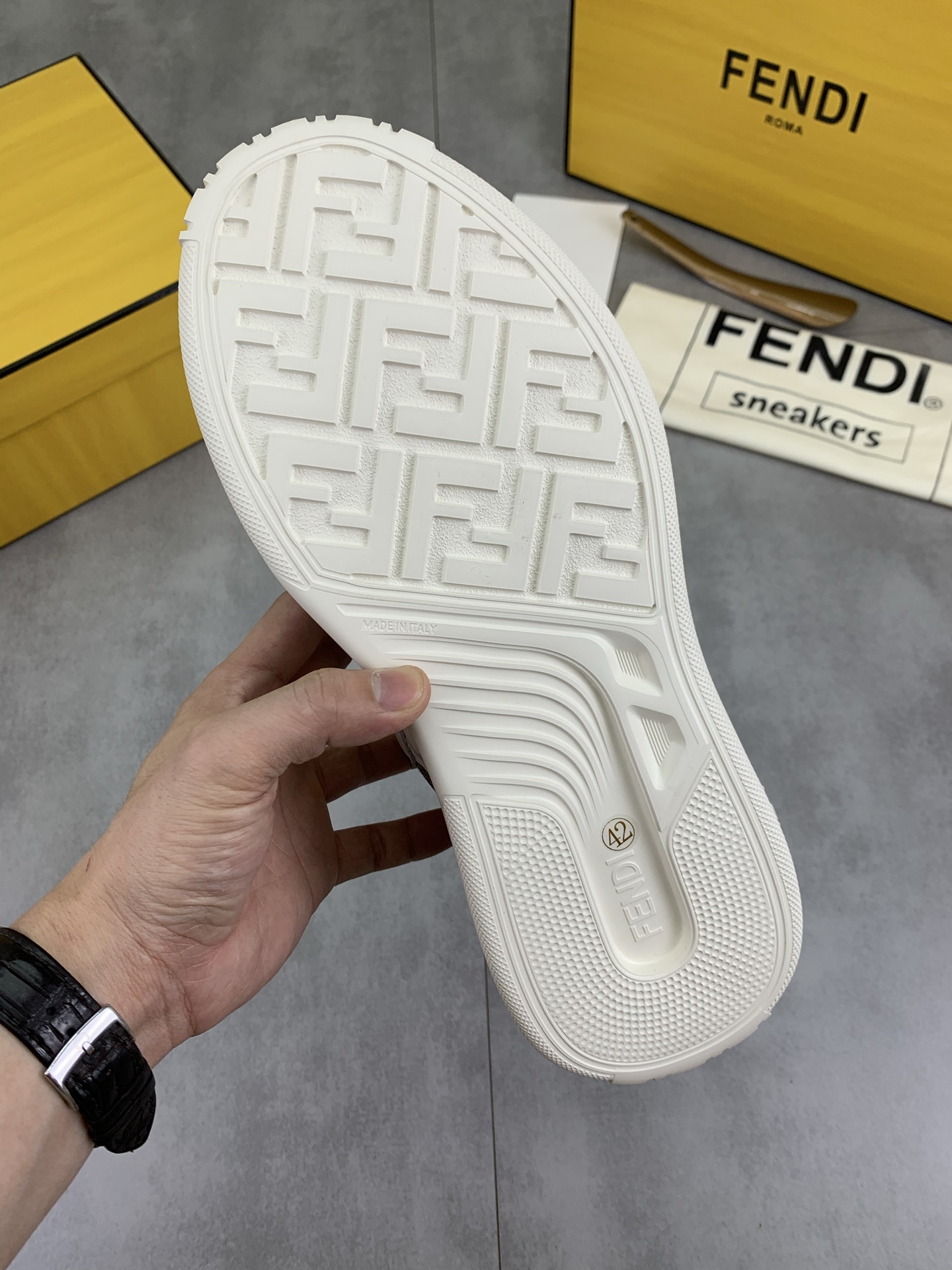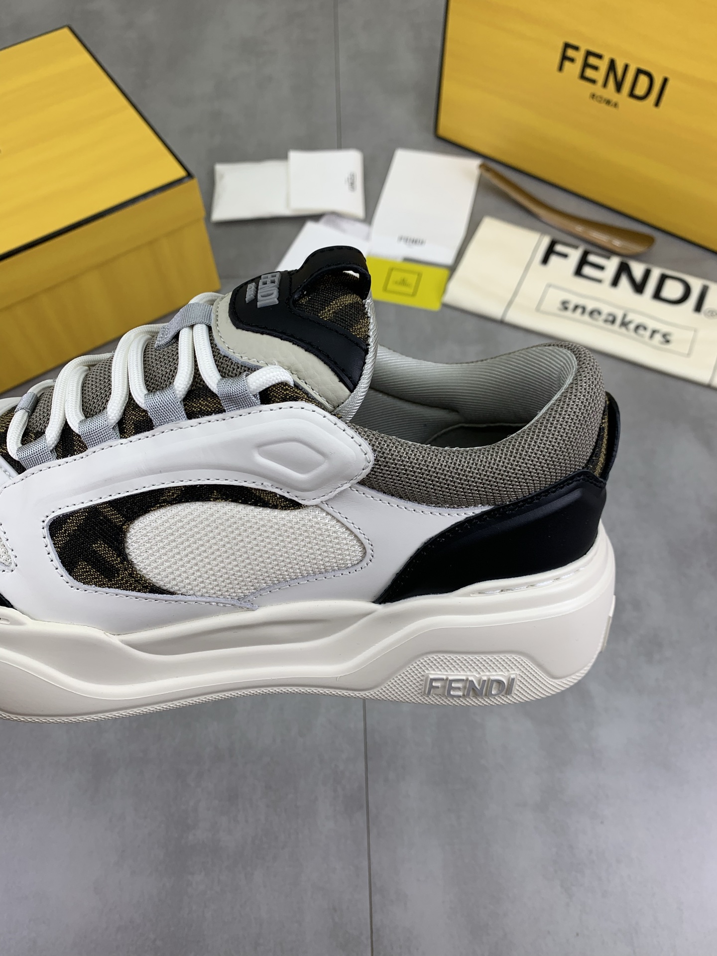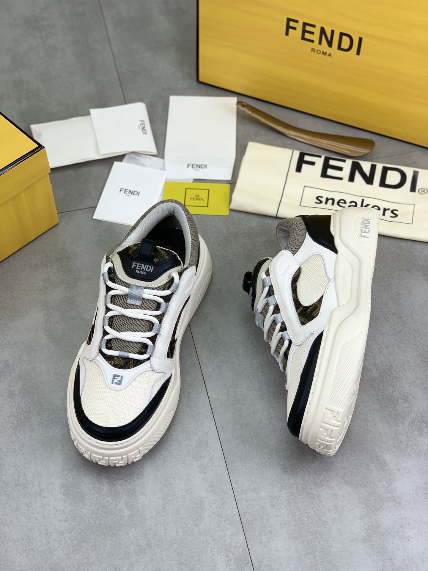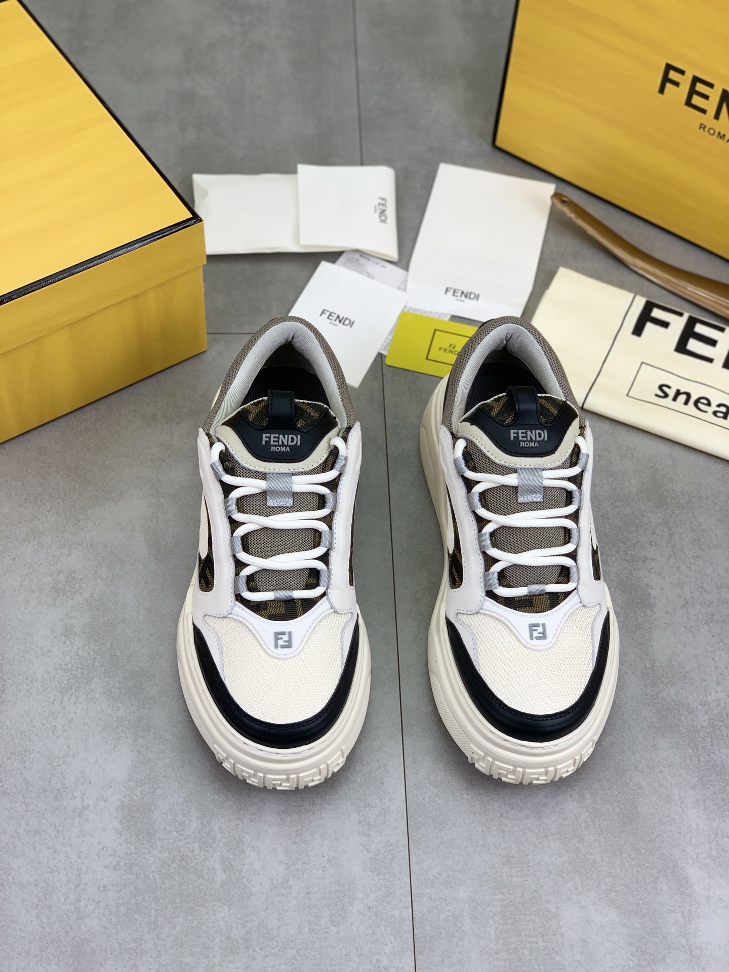 这款鞋子是AAAAA 1:1 质量 (非常棒). 使用了和原版一模一样的材料. 商标部分也保持了和芬迪/Fendi一样. 图片拍摄是实物鞋子拍摄, 您所收到的实物保证和我们图片一模一样.